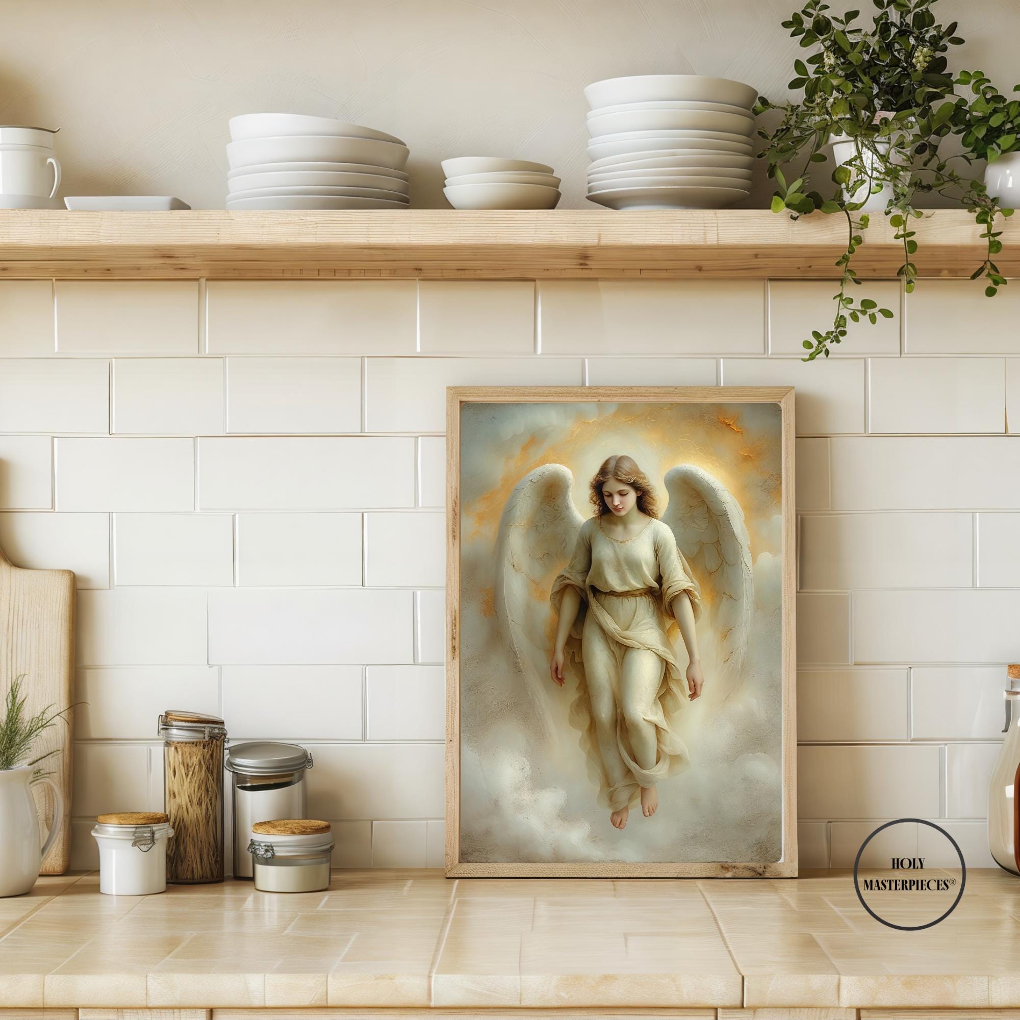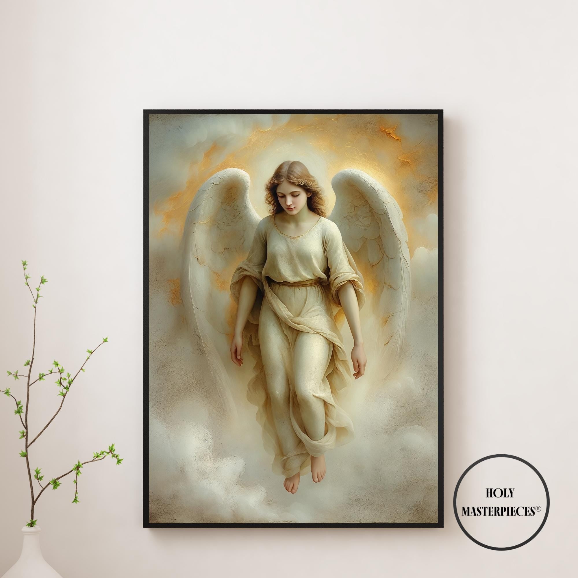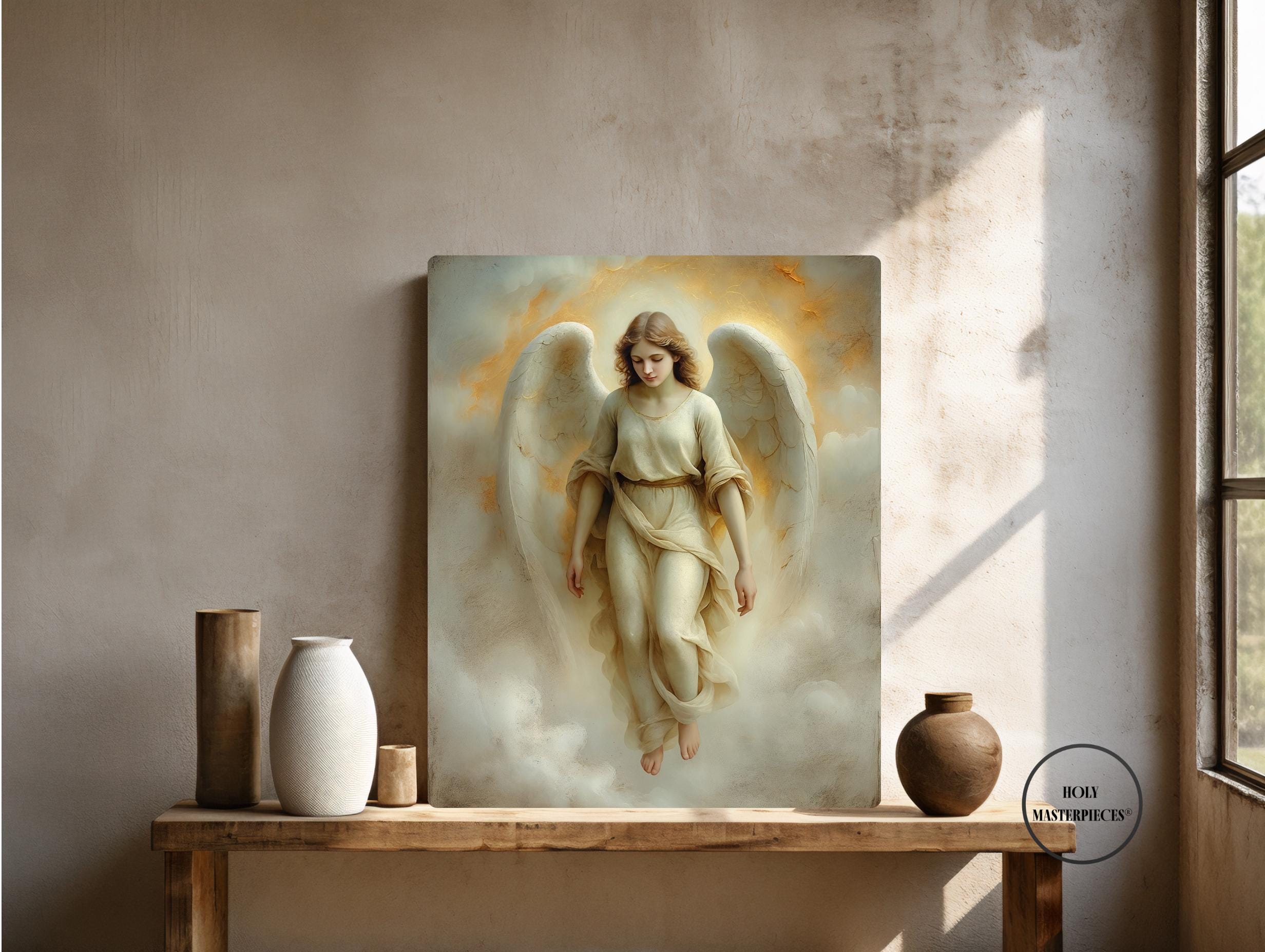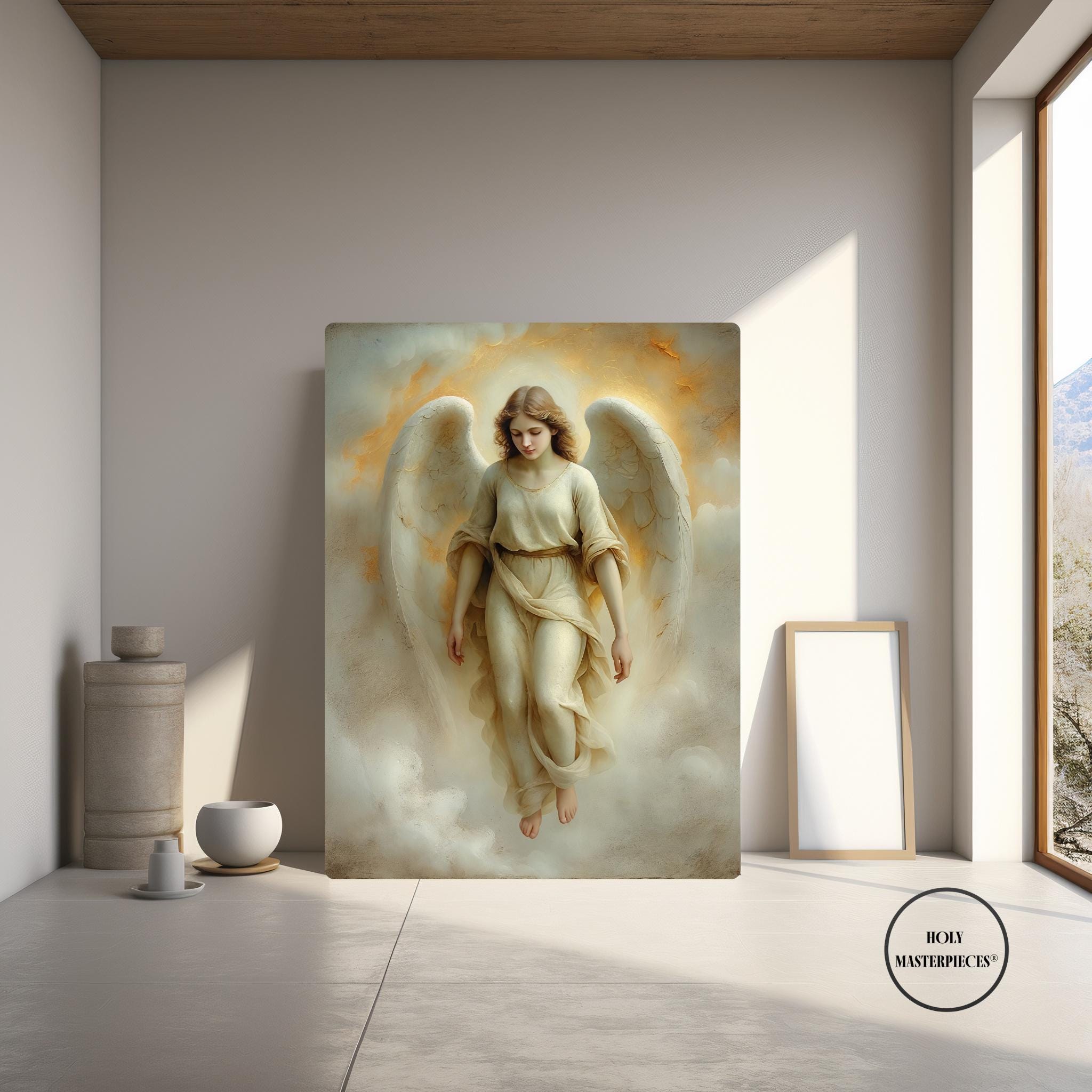 Angel in the Clouds presents a sacred angel descending gently through luminous clouds, suspended in a quiet moment between heaven and earth. The figure remains calm and composed, with a lowered gaze and relaxed posture that conveys peace, protection, and divine presence rather than dramatic movement. This serene Catholic angel wall art piece is designed to create an atmosphere of reassurance and contemplative stillness within the home.