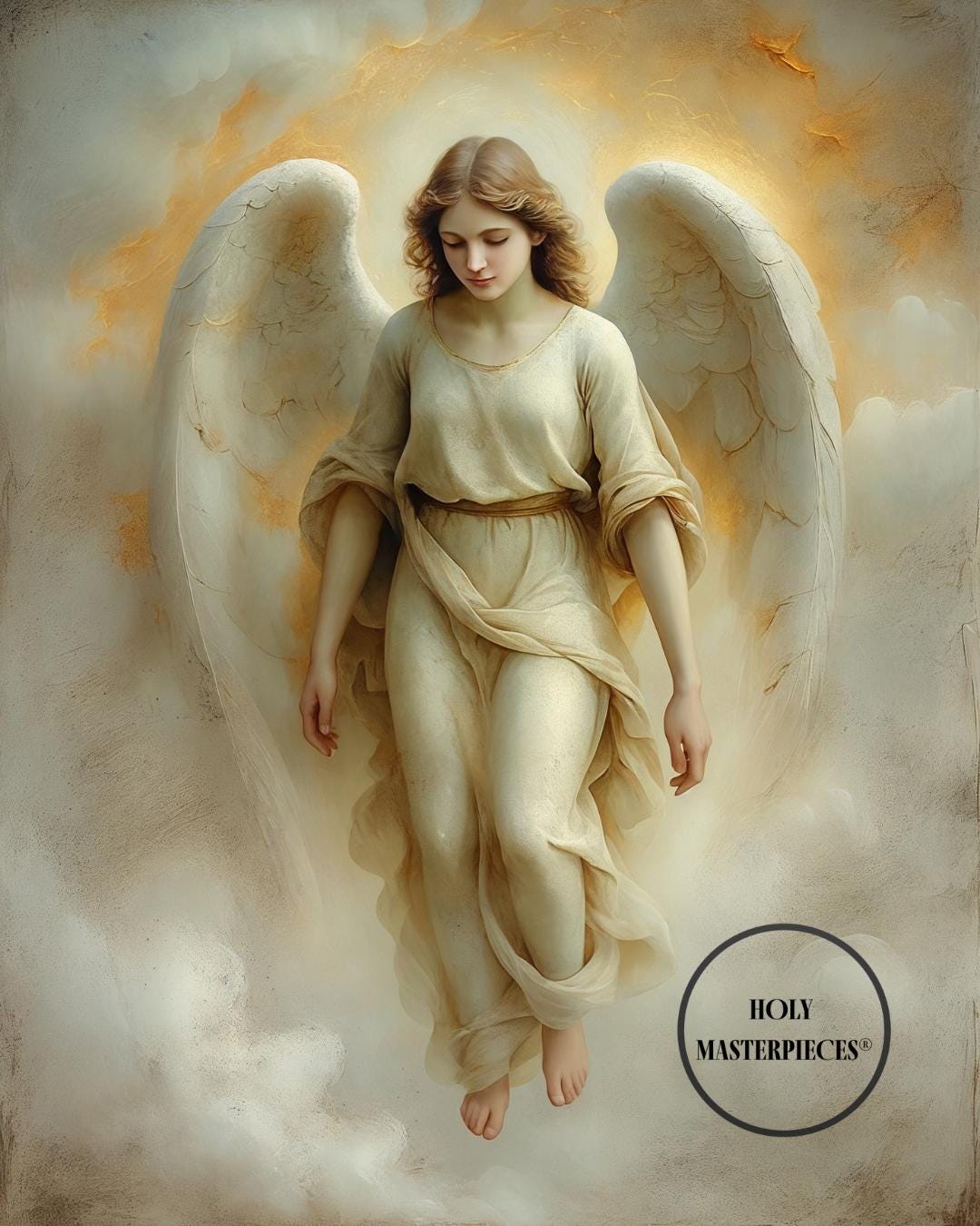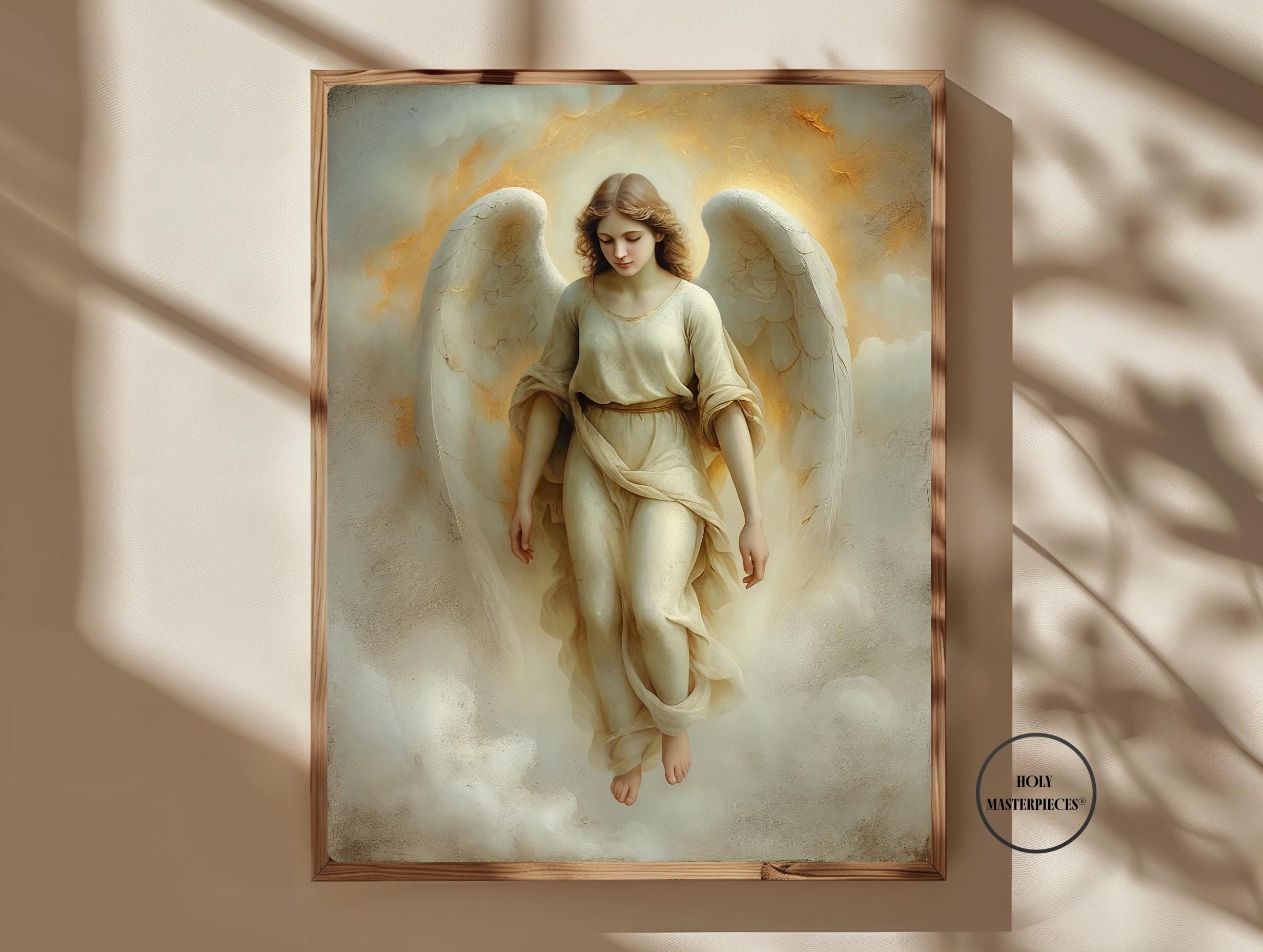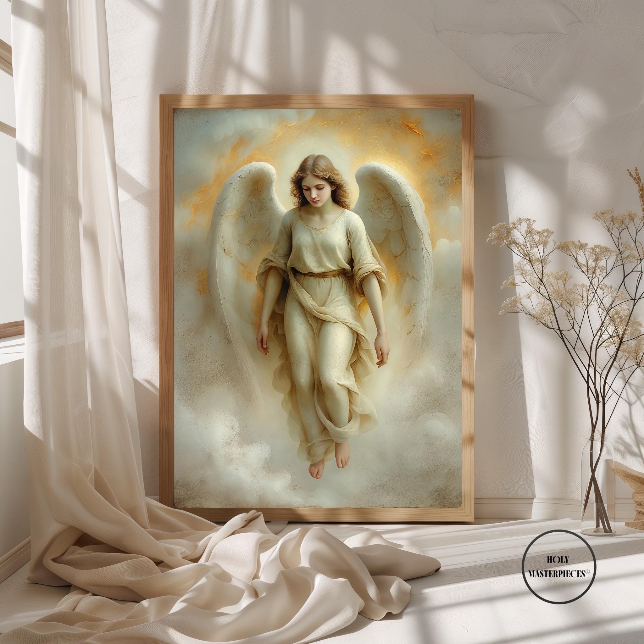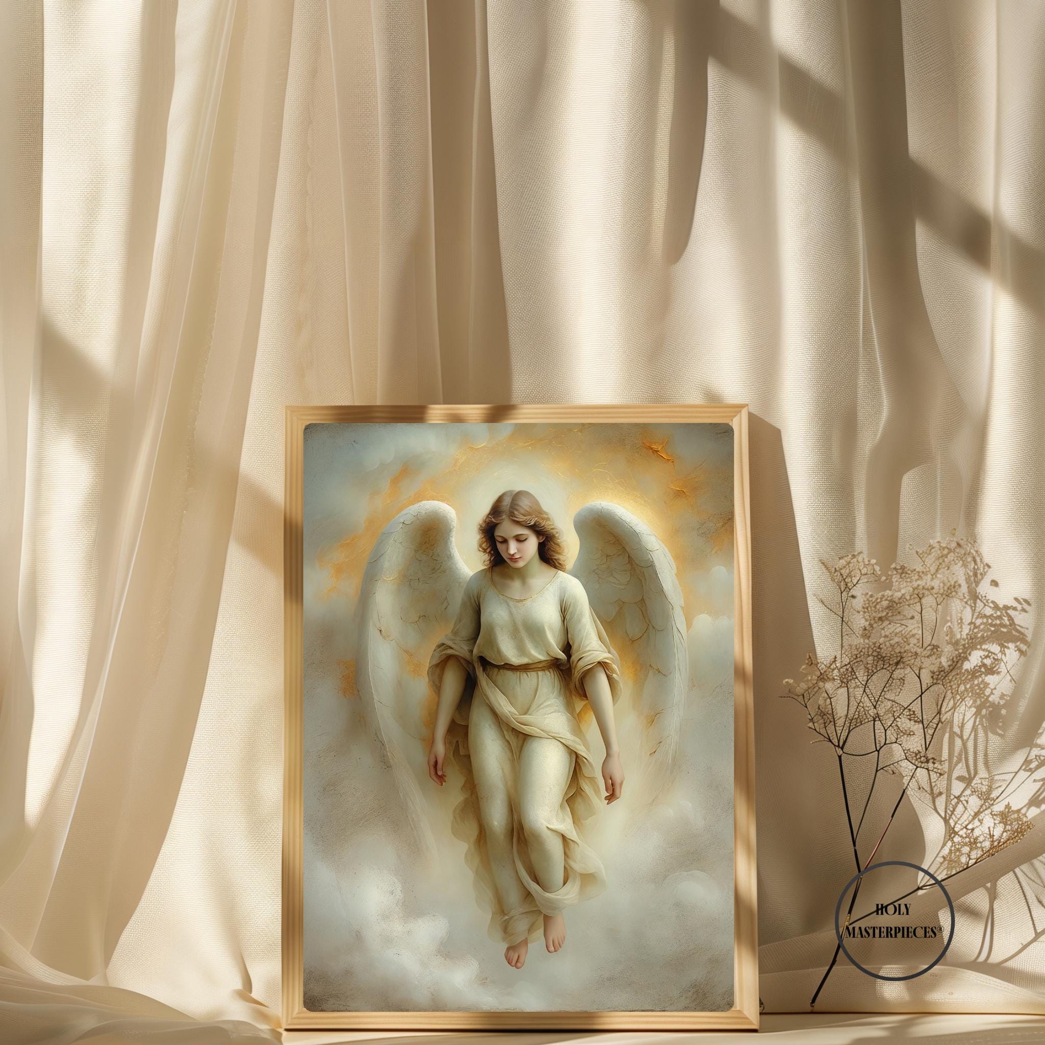 Angel in the Clouds presents a sacred angel descending gently through luminous clouds, suspended in a quiet moment between heaven and earth. The figure remains calm and composed, with a lowered gaze and relaxed posture that conveys peace, protection, and divine presence rather than dramatic movement. This serene Catholic angel wall art piece is designed to create an atmosphere of reassurance and contemplative stillness within the home.