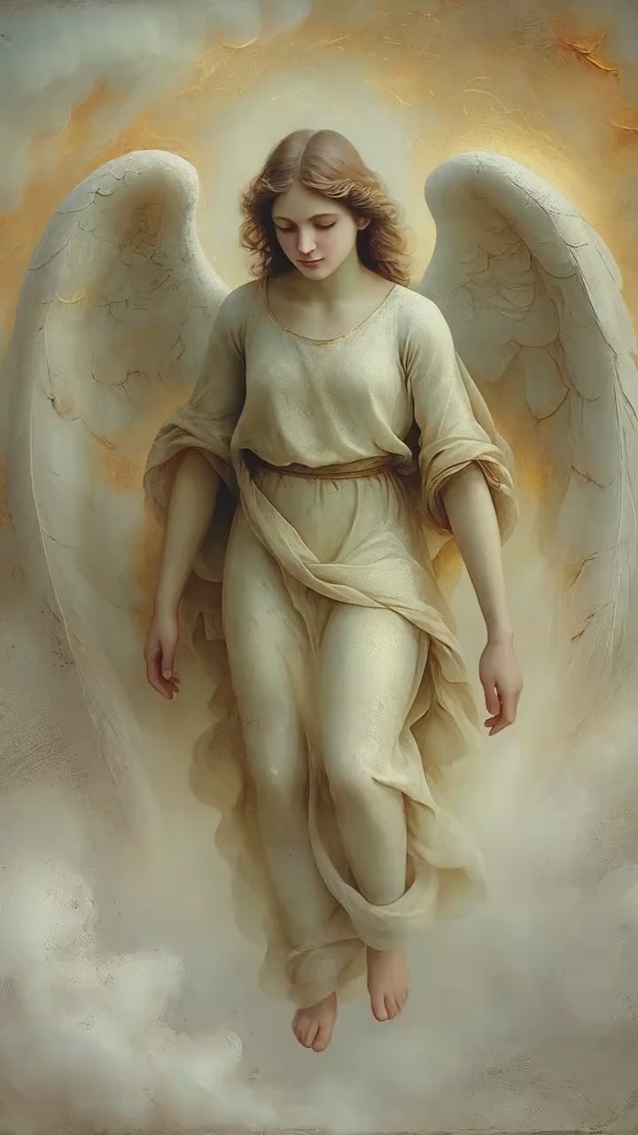 Soft ivory robes fall in flowing, sculptural folds enriched with visible oil-textured brushwork and subtle tonal variation. Broad feathered wings emerge naturally from the surrounding mist, curving around the figure to frame the composition with balance and harmony. A faint golden halo encircles the angel’s head, softly blended into the surrounding light to reinforce the sacred tone without visual excess.