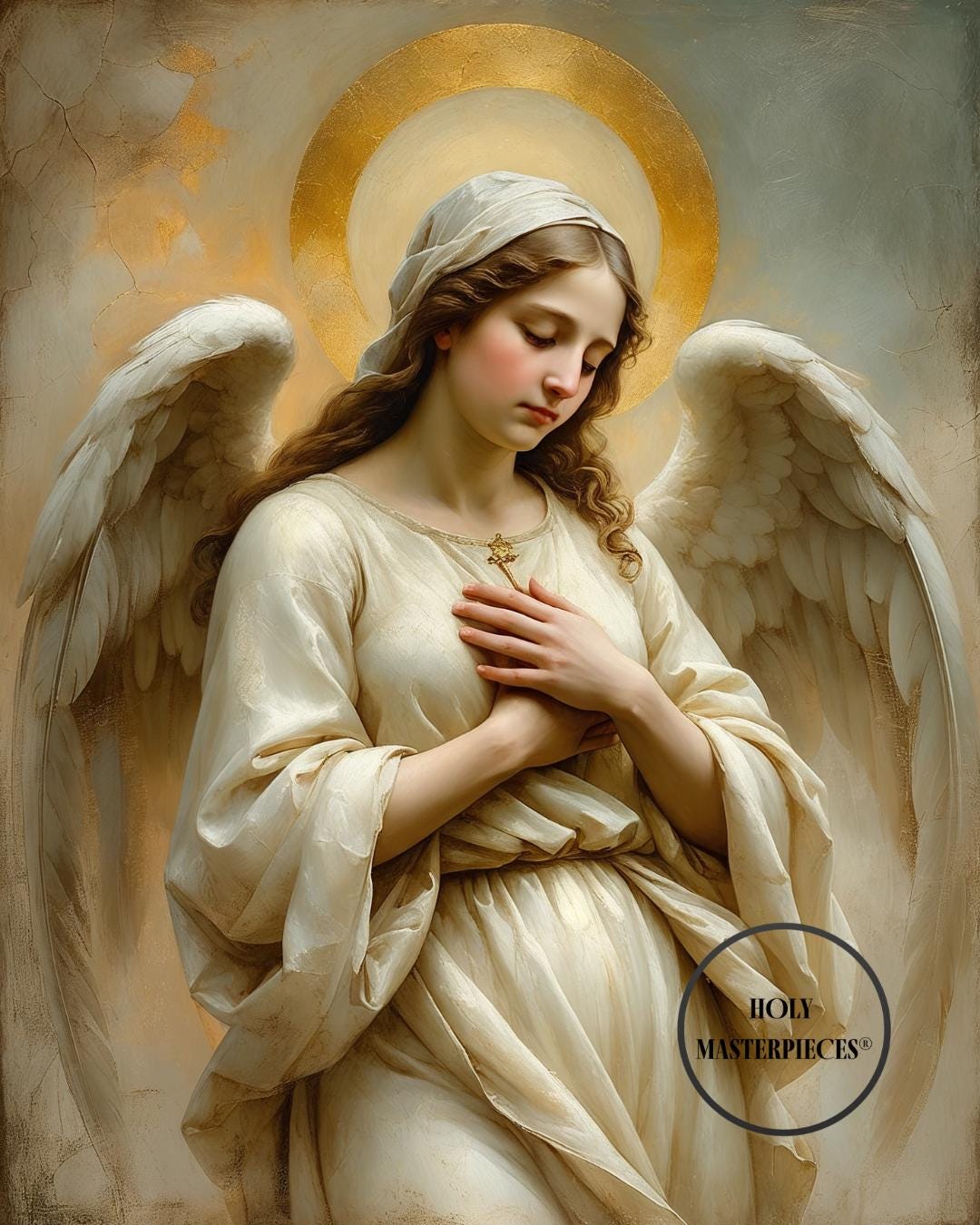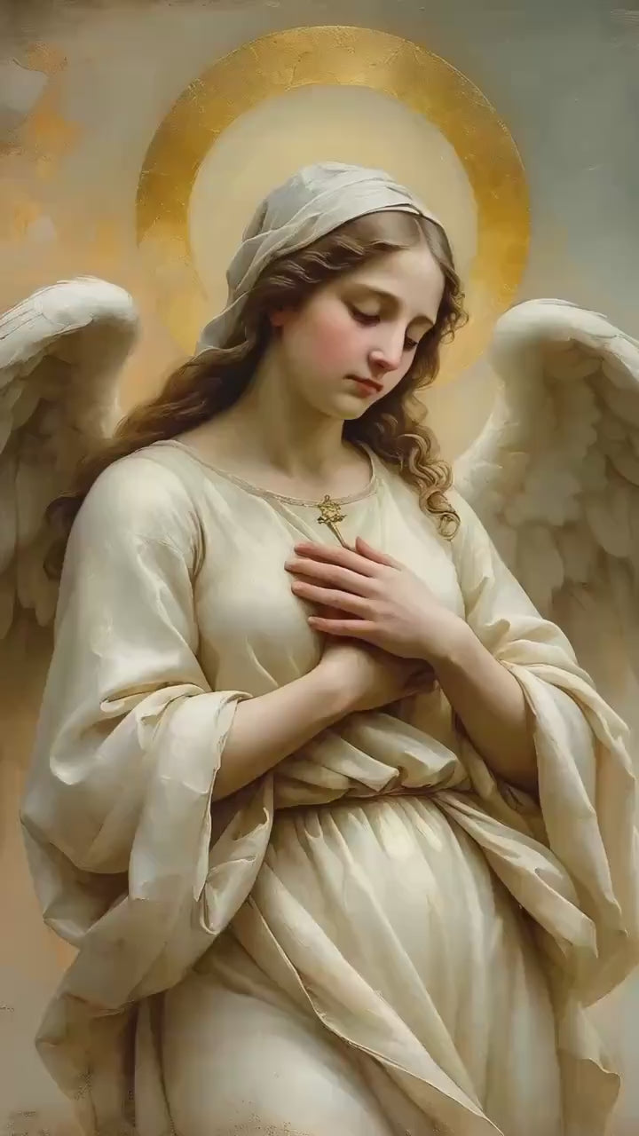 A gentle and comforting devotional portrait of the Angel of Consolation, created in a classical 17th-century painterly style. The angel is shown with a tender, compassionate expression, hands resting over the heart as a symbol of solace, mercy, and divine comfort. Soft ivory robes, warm golden tones, and a subtle radiant halo create a peaceful and reassuring sacred presence, inspired by traditional European religious art.