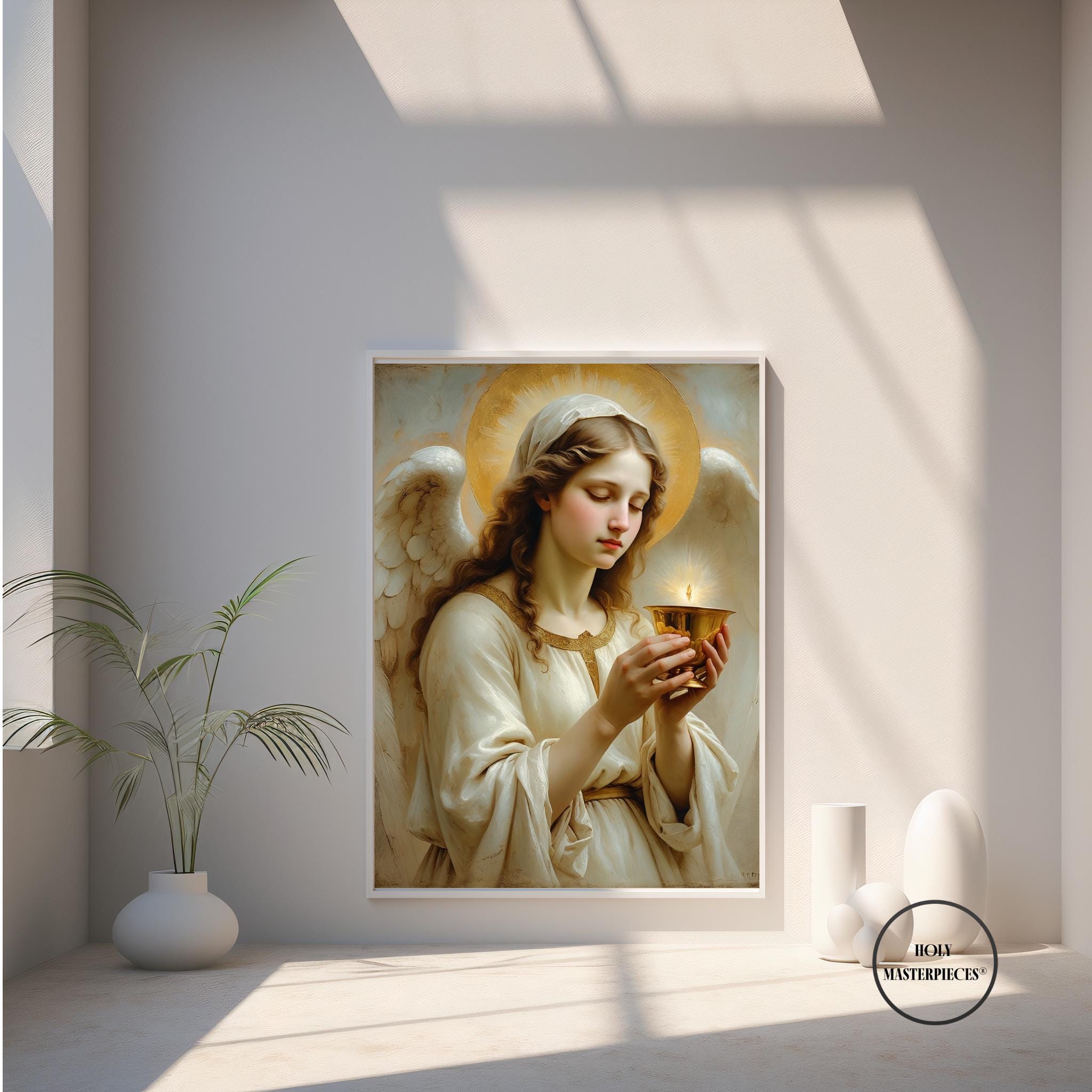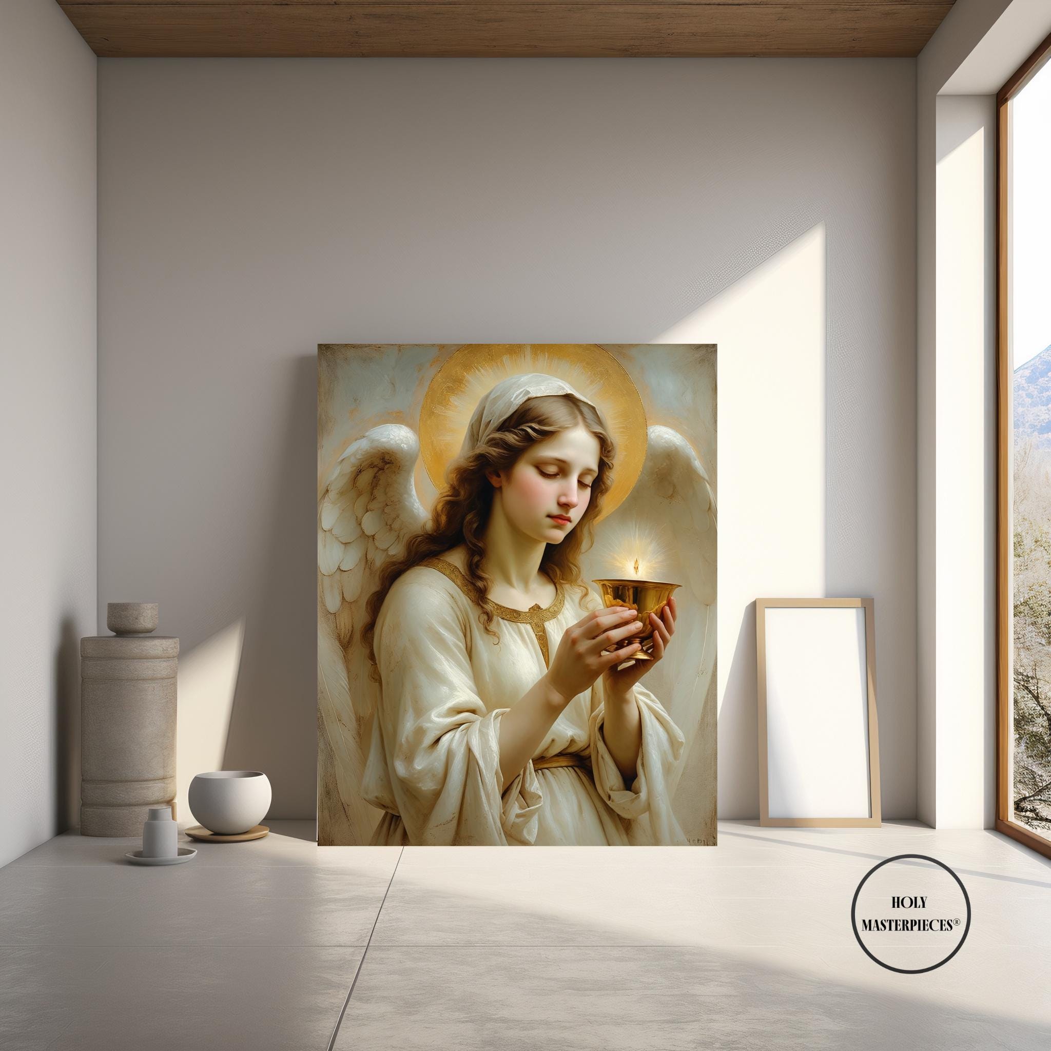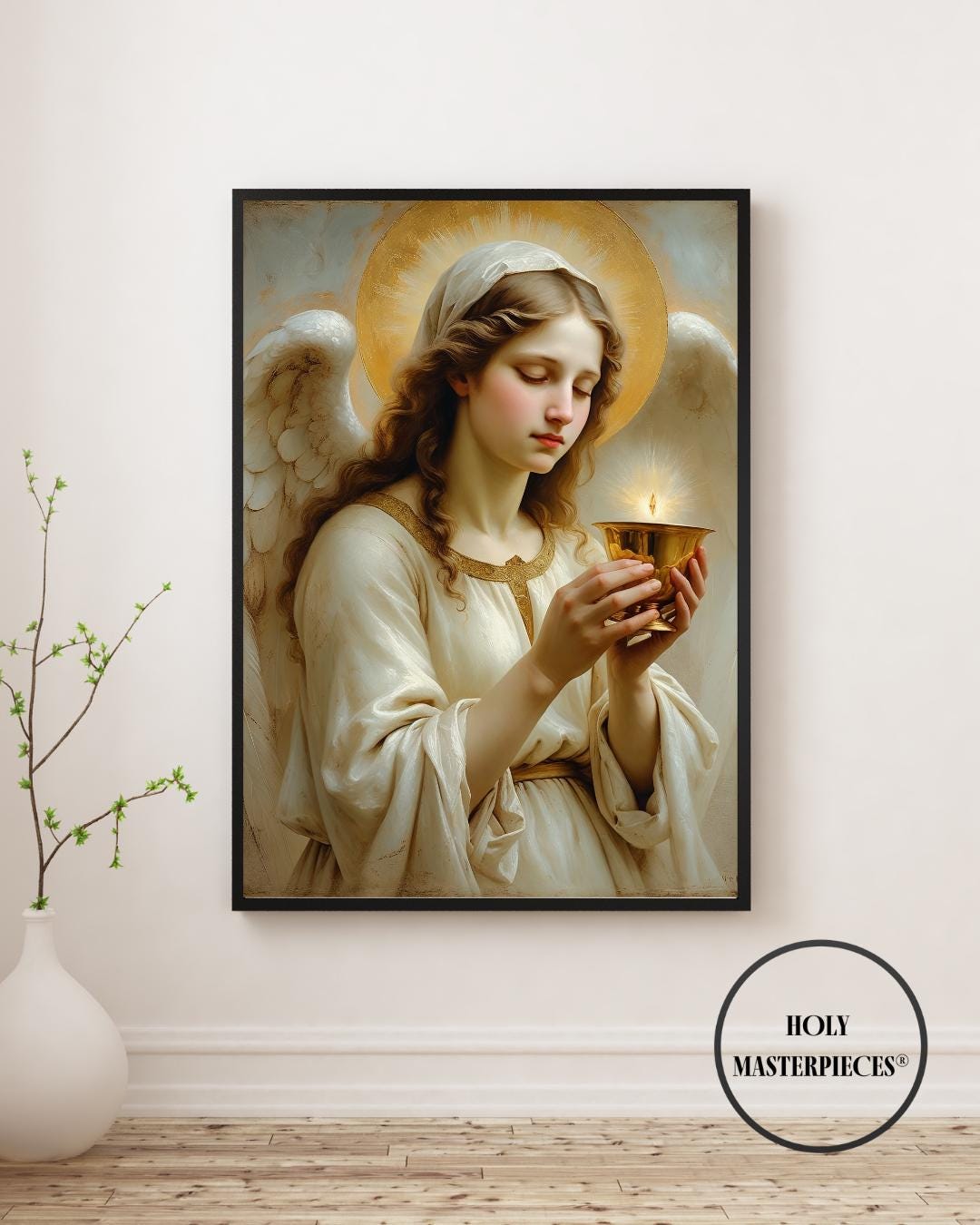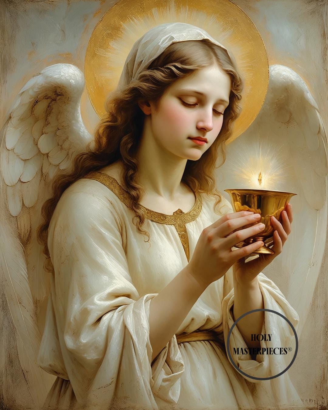 A serene and devotional portrayal of the Angel of the Eucharist, shown reverently holding a golden chalice aflame with divine light. Rendered in a classical 17th-century sacred oil-painting style, this artwork reflects themes of reverence, sacrifice, and holy mystery. Soft ivory tones, warm gold accents, and gentle brushwork create a peaceful, contemplative presence. Part of the Angels Collection by Holy Masterpieces.