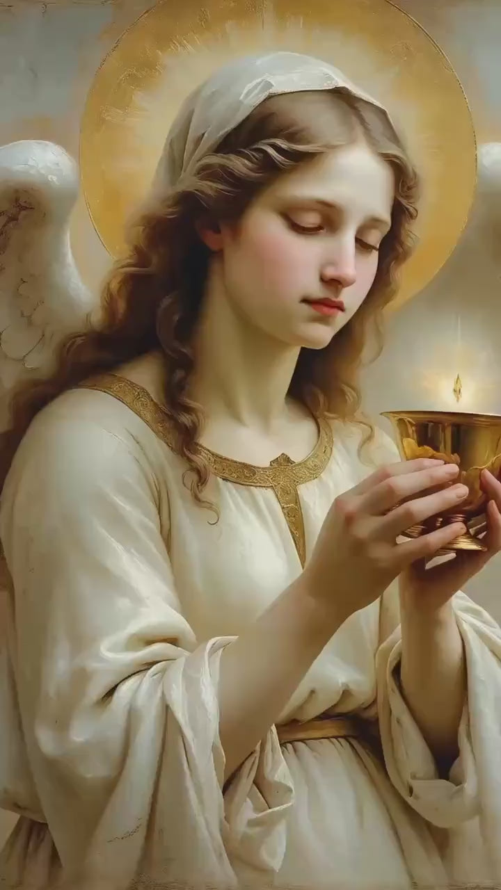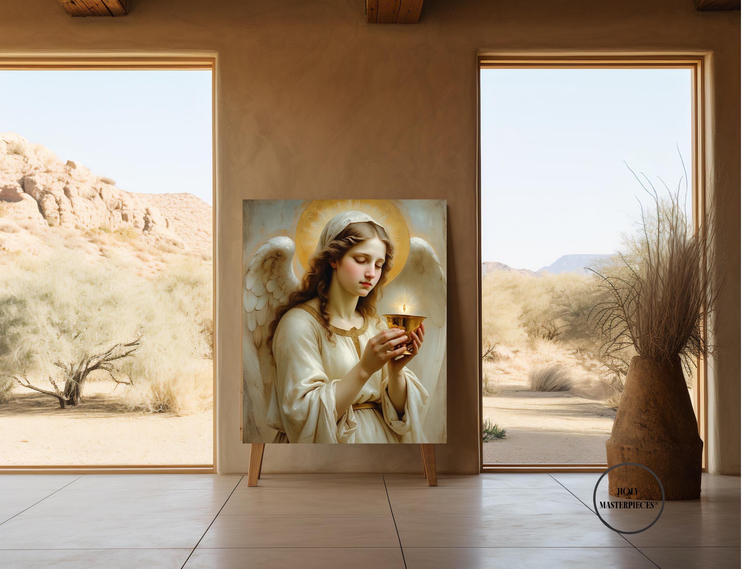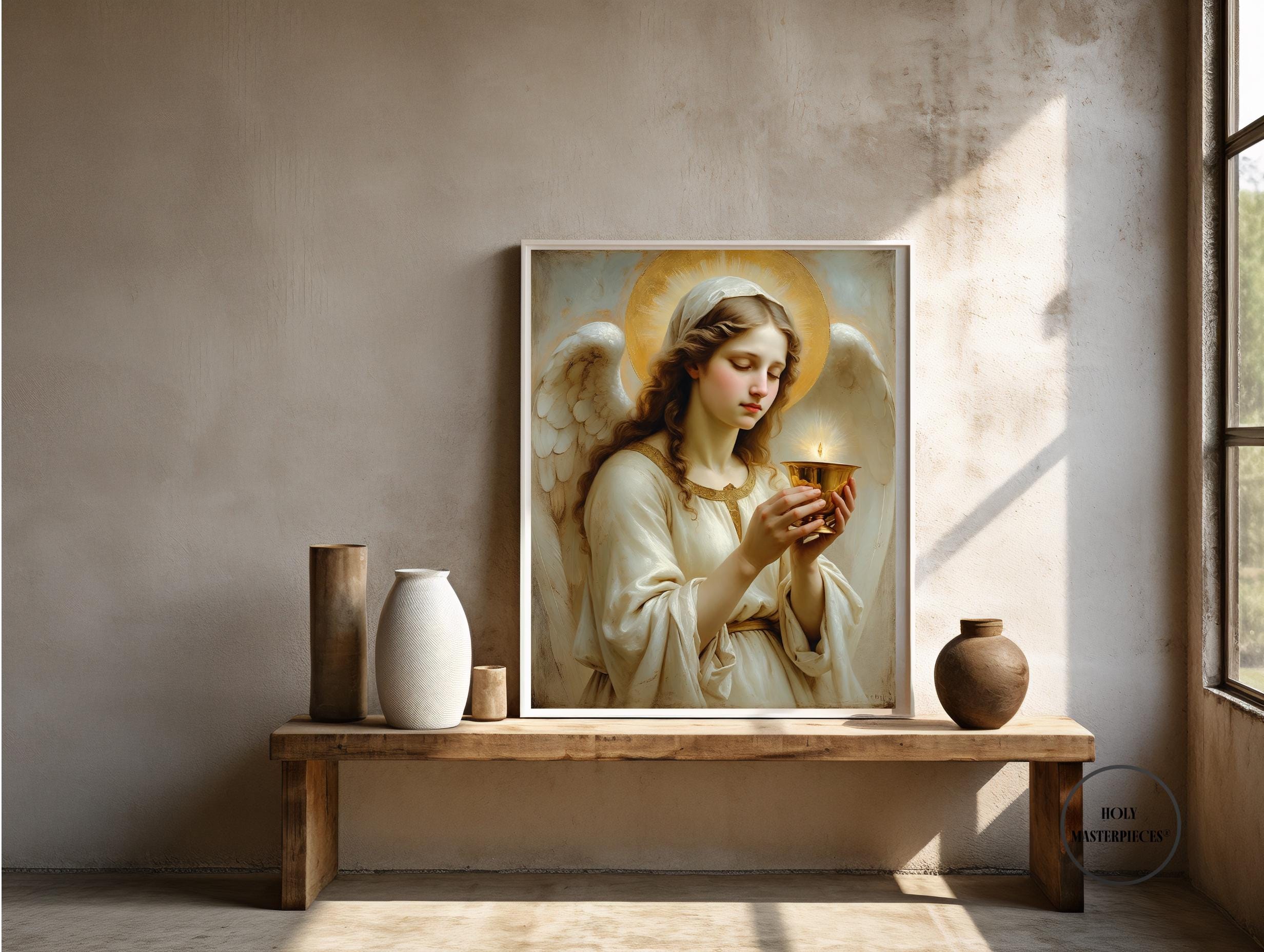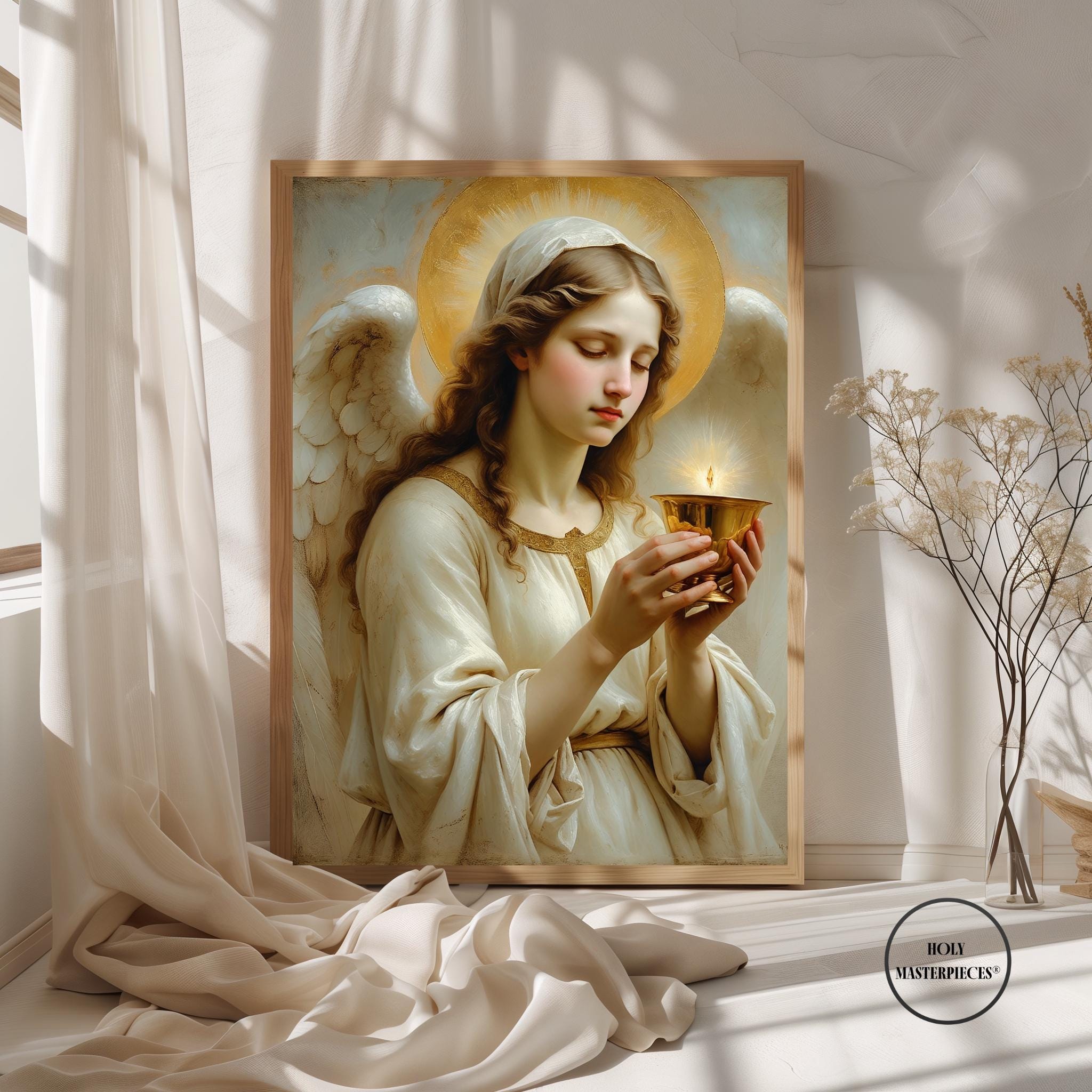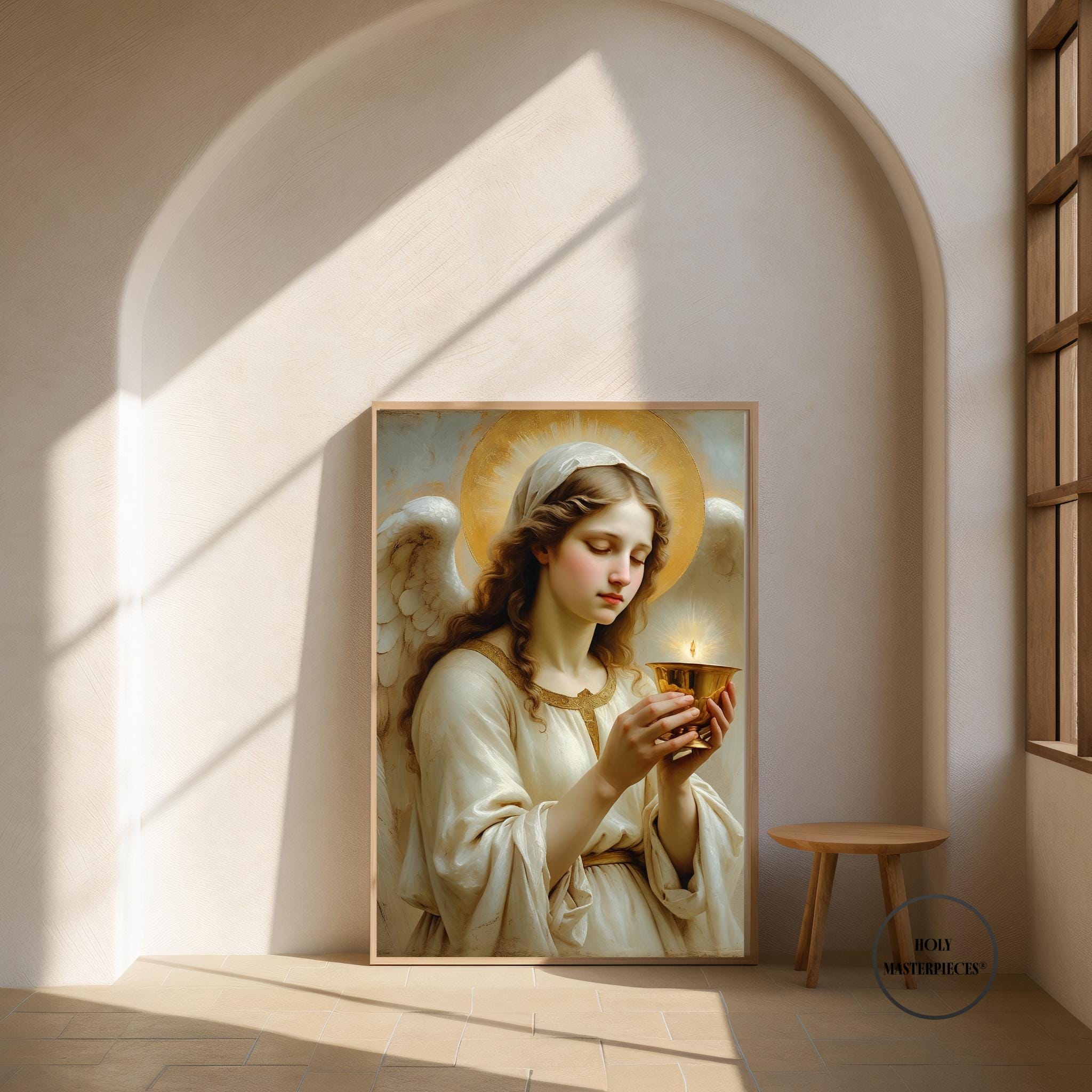 A serene and devotional portrayal of the Angel of the Eucharist, shown reverently holding a golden chalice aflame with divine light. Rendered in a classical 17th-century sacred oil-painting style, this artwork reflects themes of reverence, sacrifice, and holy mystery. Soft ivory tones, warm gold accents, and gentle brushwork create a peaceful, contemplative presence. Part of the Angels Collection by Holy Masterpieces.