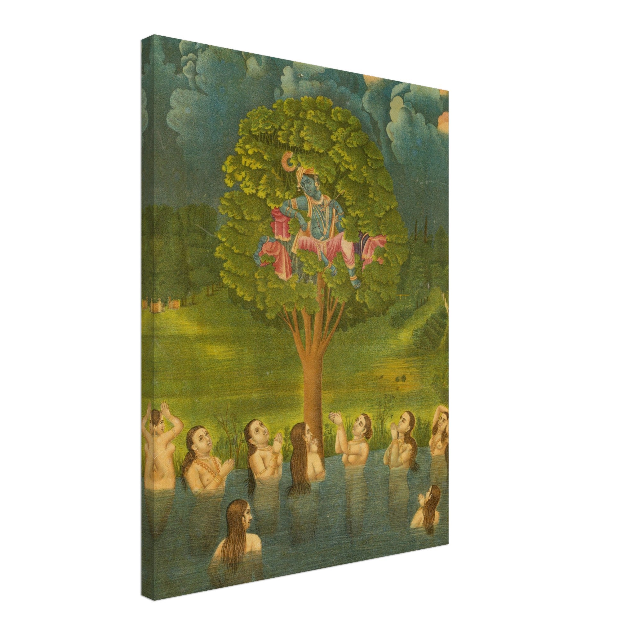 Experimente la belleza y la intriga de la mitología hindú con esta exquisita pintura, "Krishna roba la ropa de las gopis". Pintada magistralmente por un artista anónimo entre 1875 y 1880, esta pieza captura el espíritu divino de Krishna y su naturaleza lúdica. Una fascinante incorporación a cualquier colección de arte.