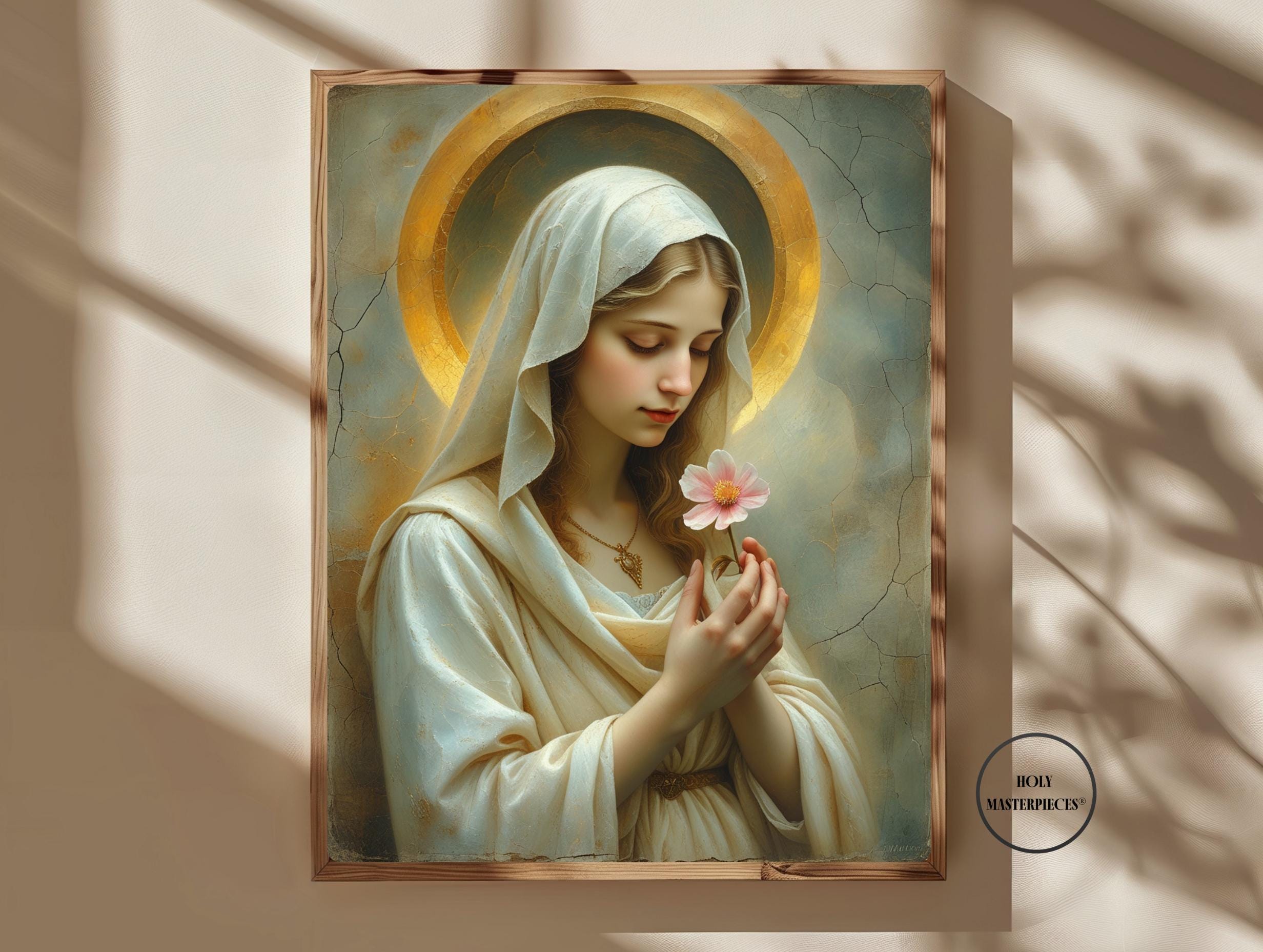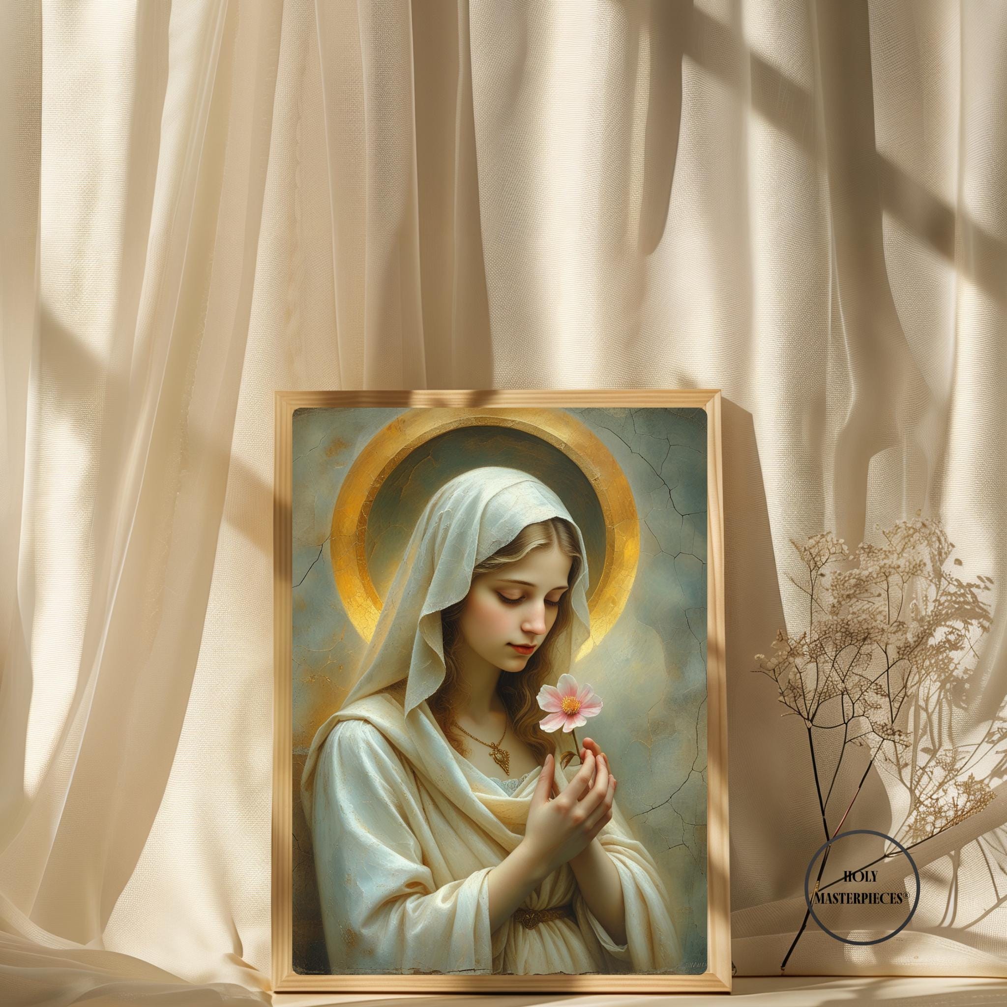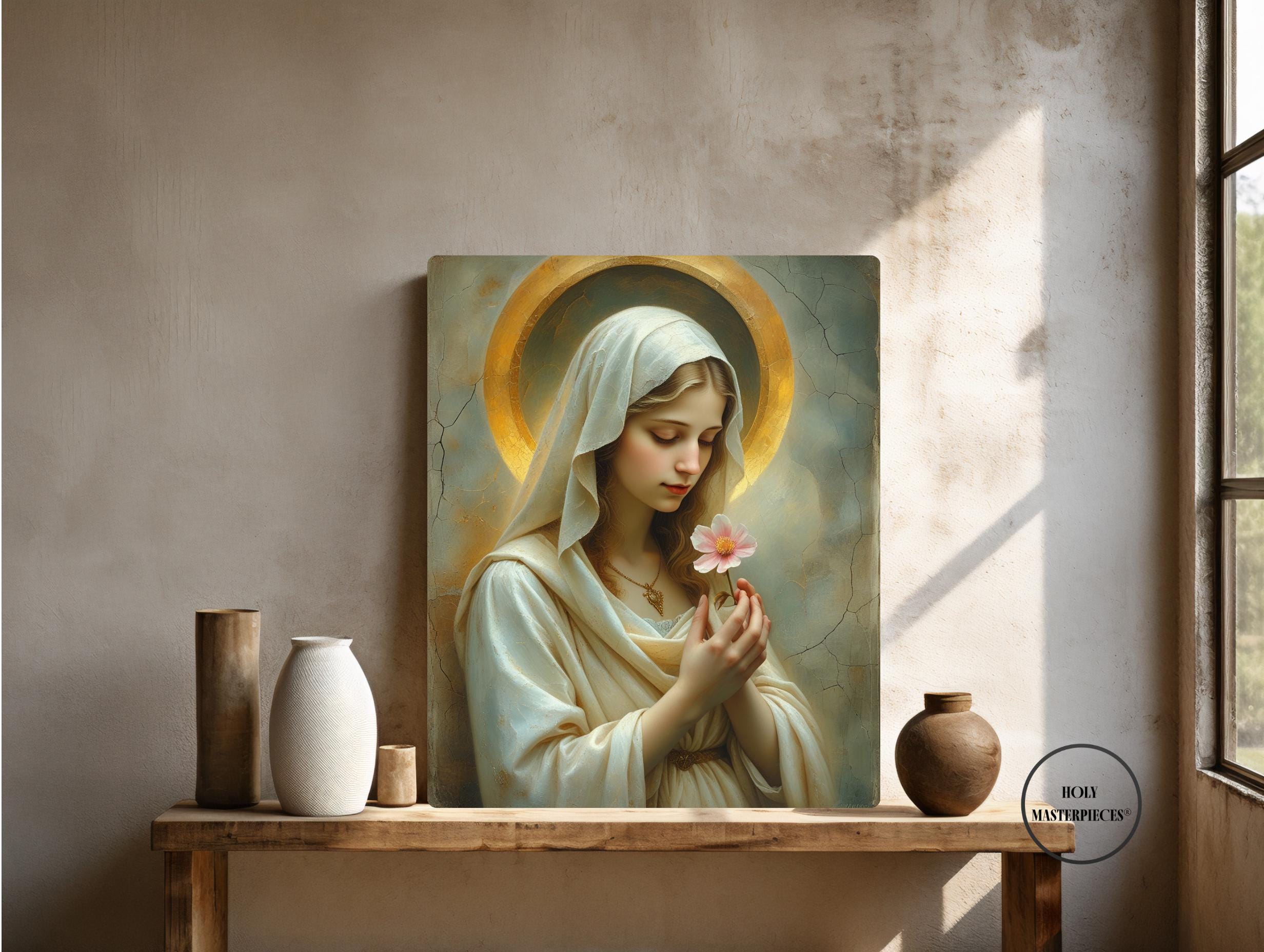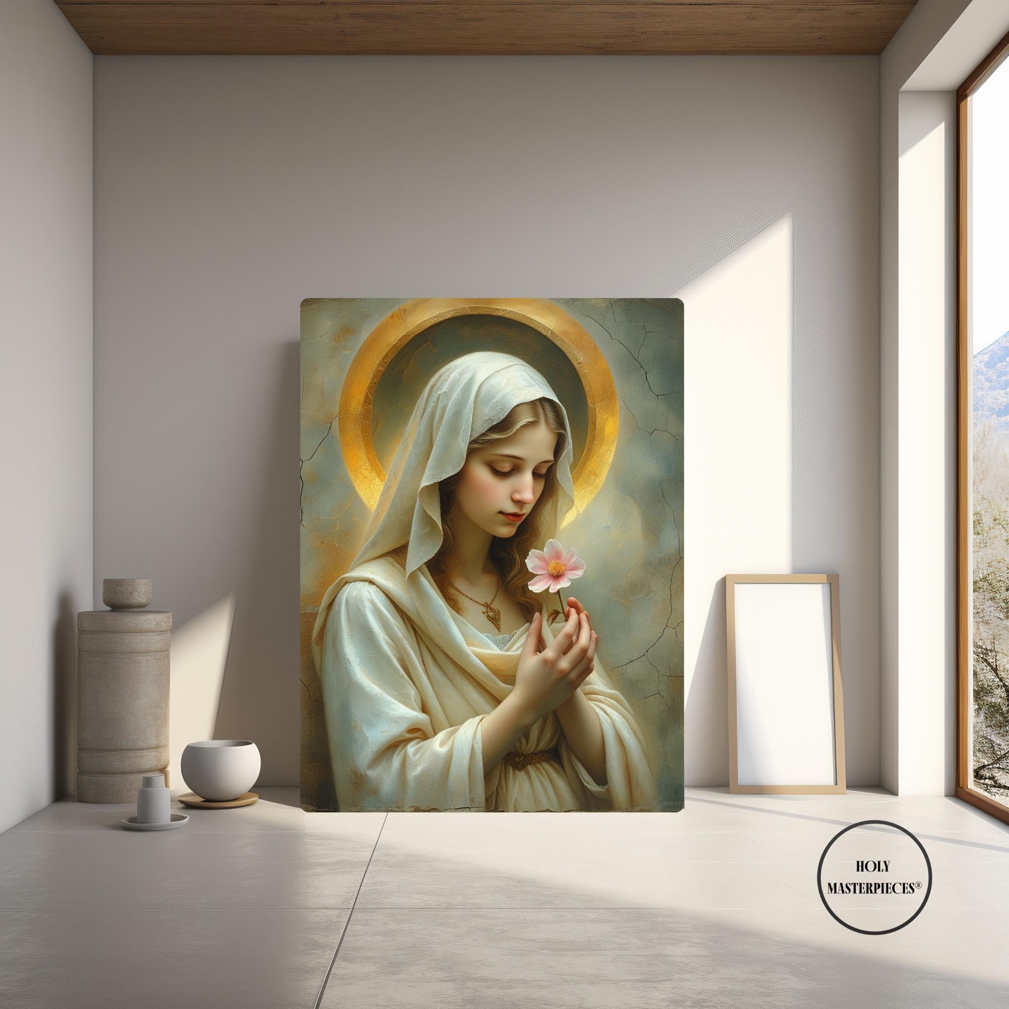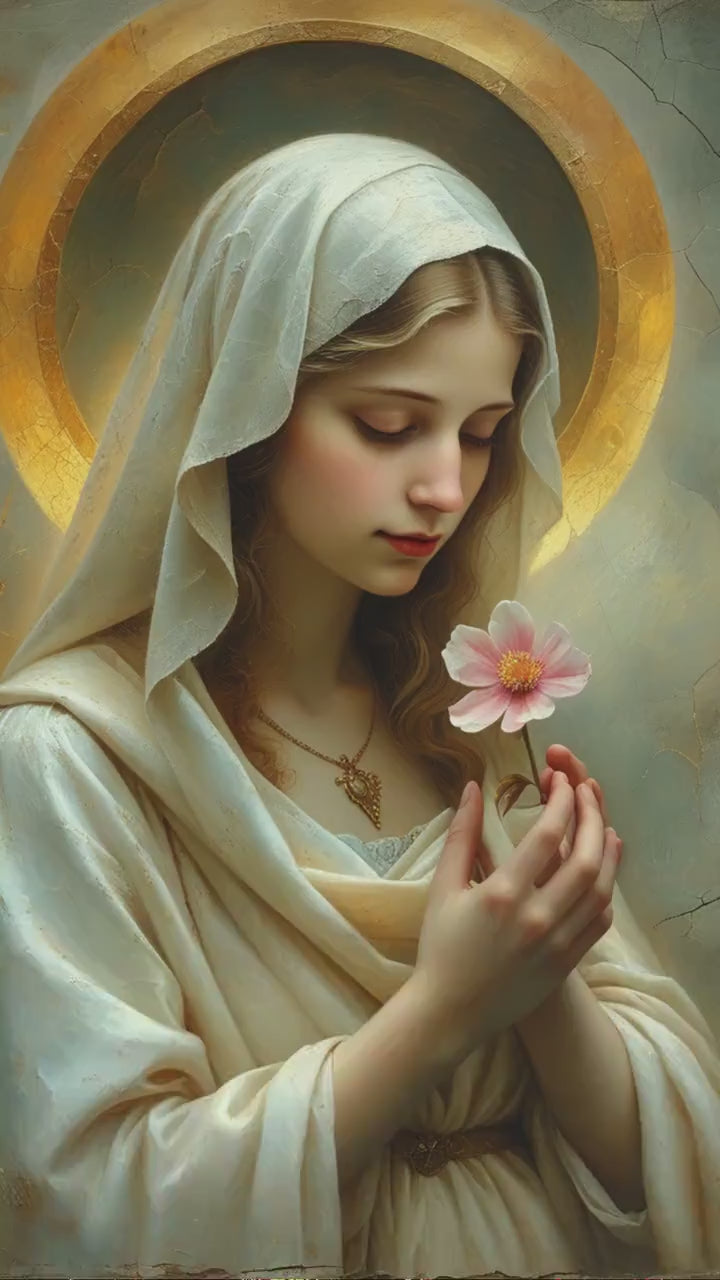 Blossom Mary presents the Virgin Mary in a moment of quiet reverence, gently holding a single blossom as a symbol of purity, renewal, and humble grace. Her slightly bowed head and softened gaze create an atmosphere of stillness and inward prayer, making this piece a refined example of Catholic Marian wall art suited for contemplative interiors.