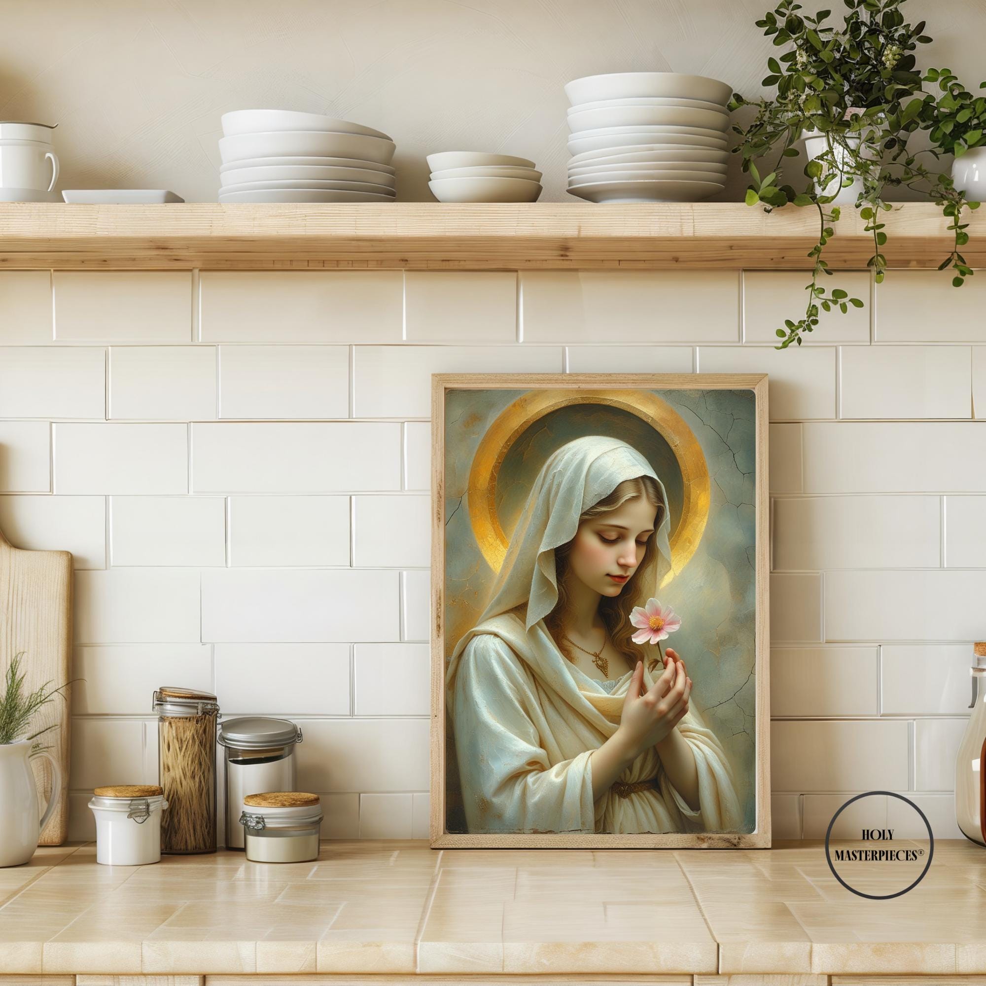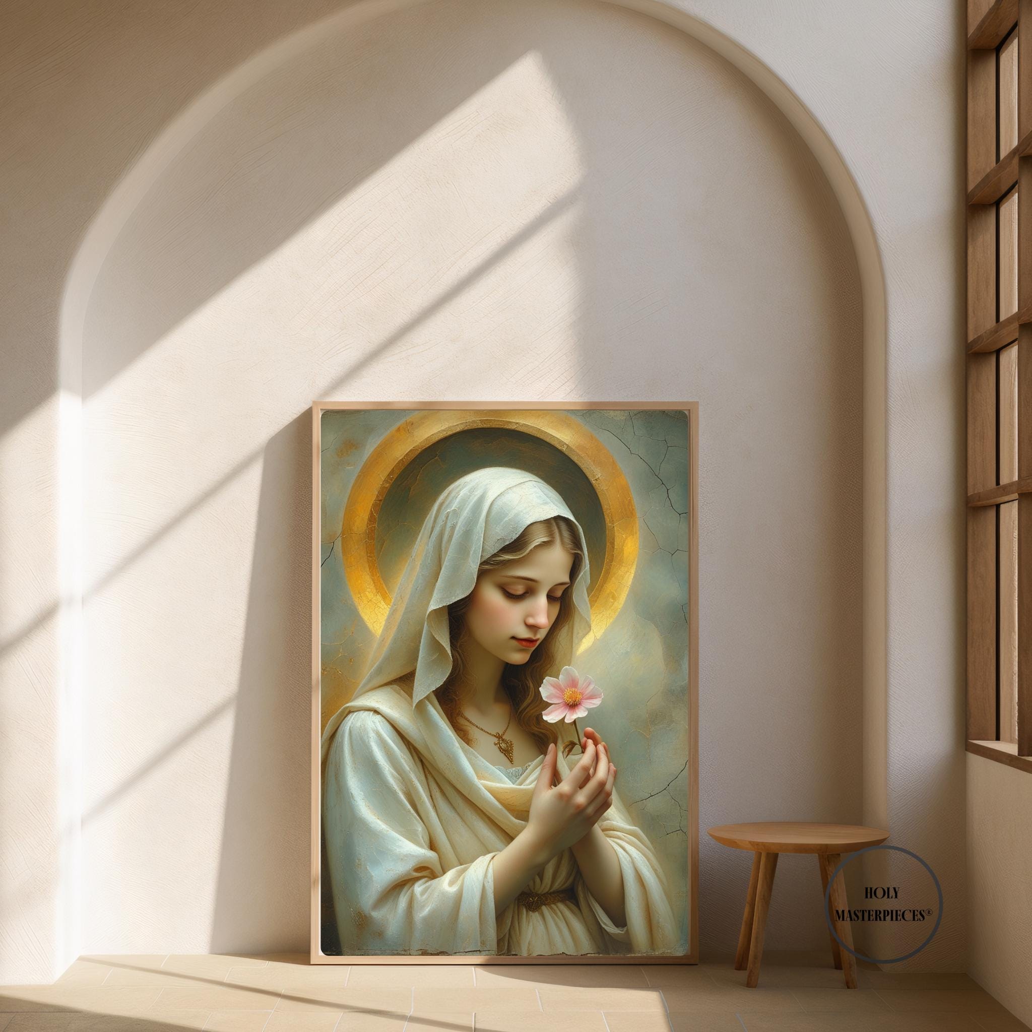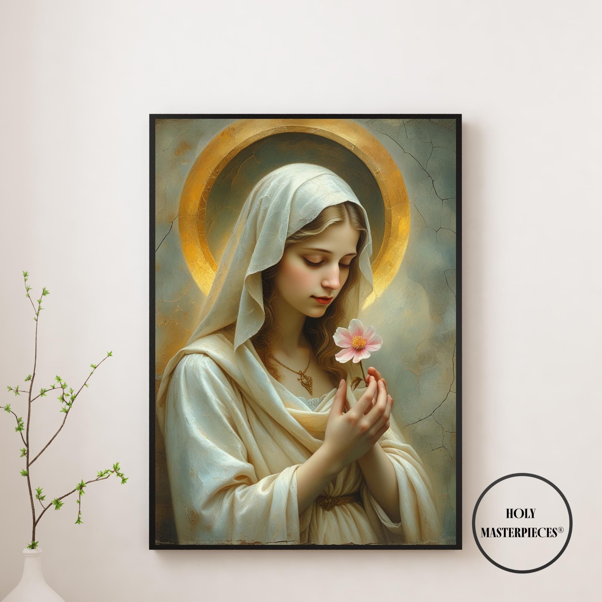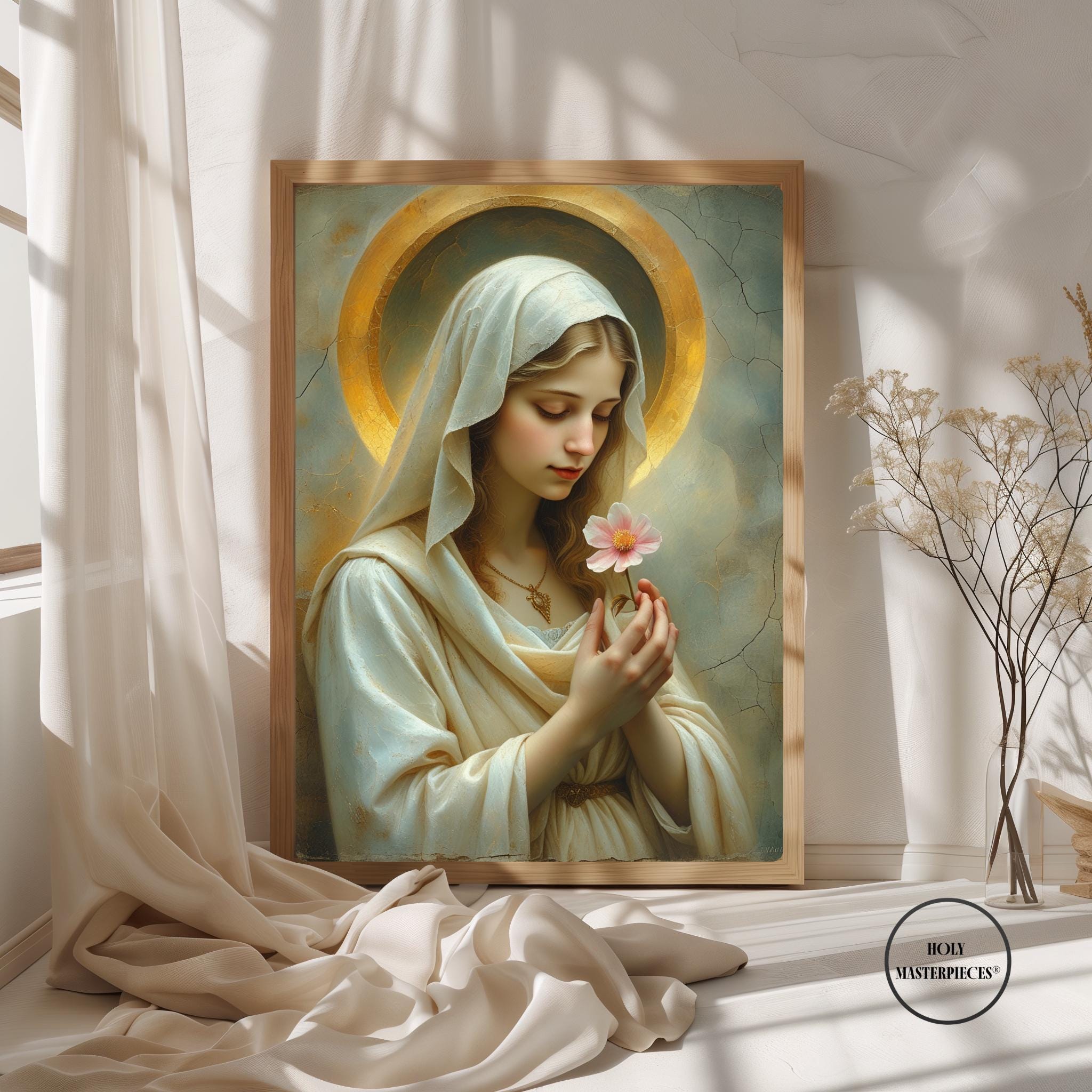 Blossom Mary presents the Virgin Mary in a moment of quiet reverence, gently holding a single blossom as a symbol of purity, renewal, and humble grace. Her slightly bowed head and softened gaze create an atmosphere of stillness and inward prayer, making this piece a refined example of Catholic Marian wall art suited for contemplative interiors.