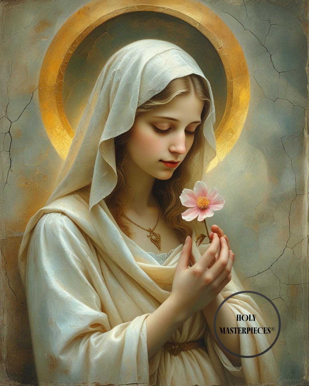 Flowing ivory and soft cream garments are rendered with visible oil texture and subtle tonal variation, giving the figure a sculptural presence rooted in classical devotional art. A muted golden halo surrounds her head, softly integrated into the background rather than sharply defined, lending a gentle sacred luminosity to the composition. The pale pink blossom introduces a delicate focal point, contrasting with the restrained palette while reinforcing themes of innocence and spiritual renewal.