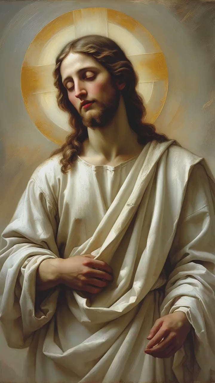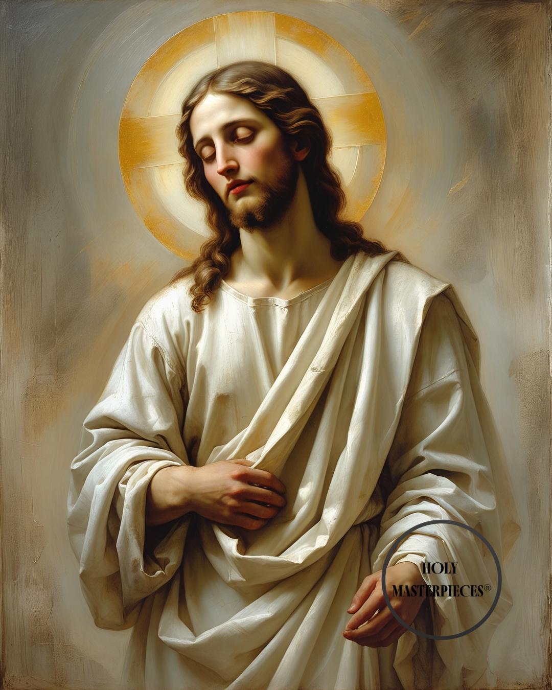 The composition is restrained and intimate, allowing the sculptural folds of the white robes to guide the eye naturally. Gentle chiaroscuro lighting shapes His tranquil features and garments, while the background remains subtle and atmospheric. A soft halo glow and muted devotional palette of ivory, warm neutrals, and delicate gold tones create a timeless, sacred atmosphere.