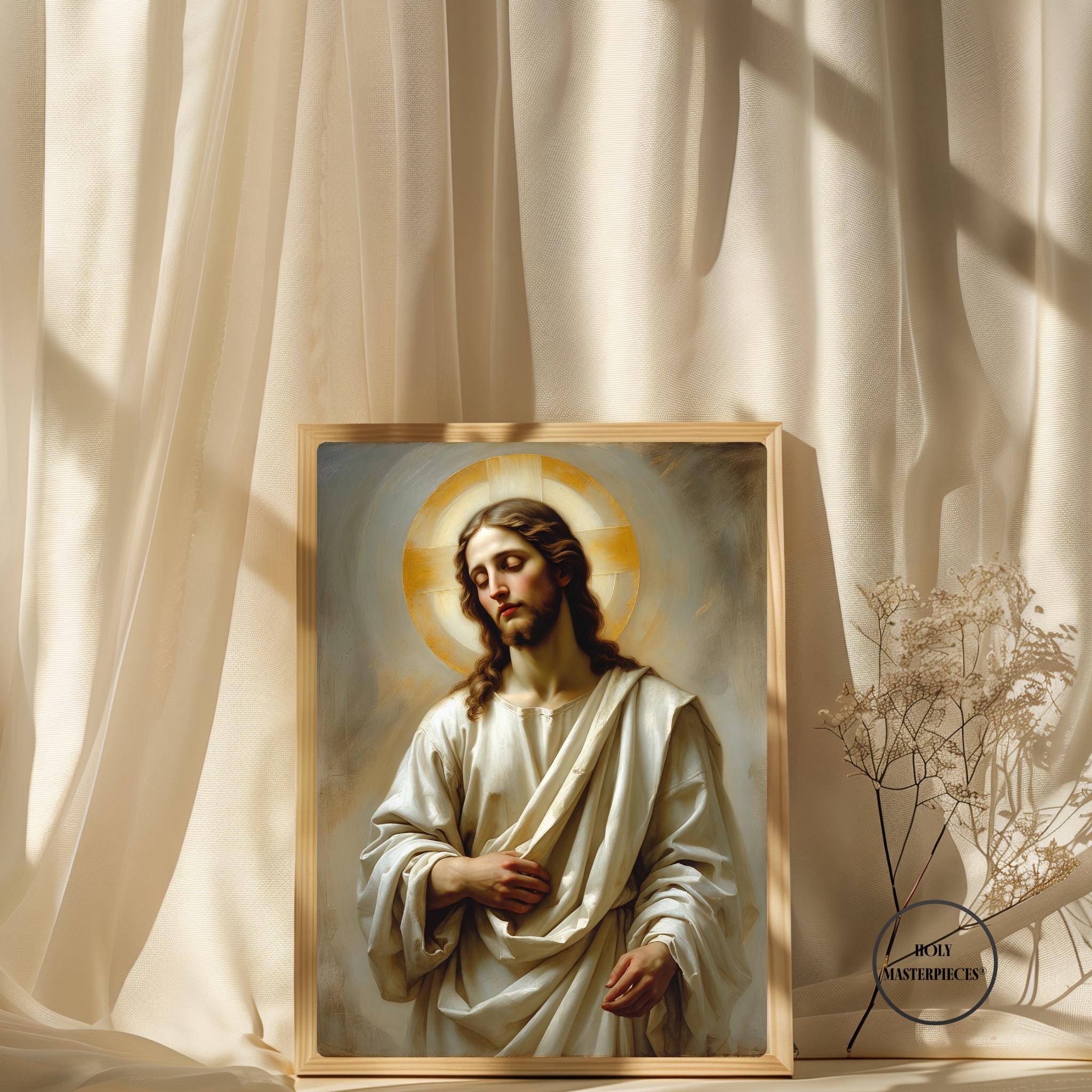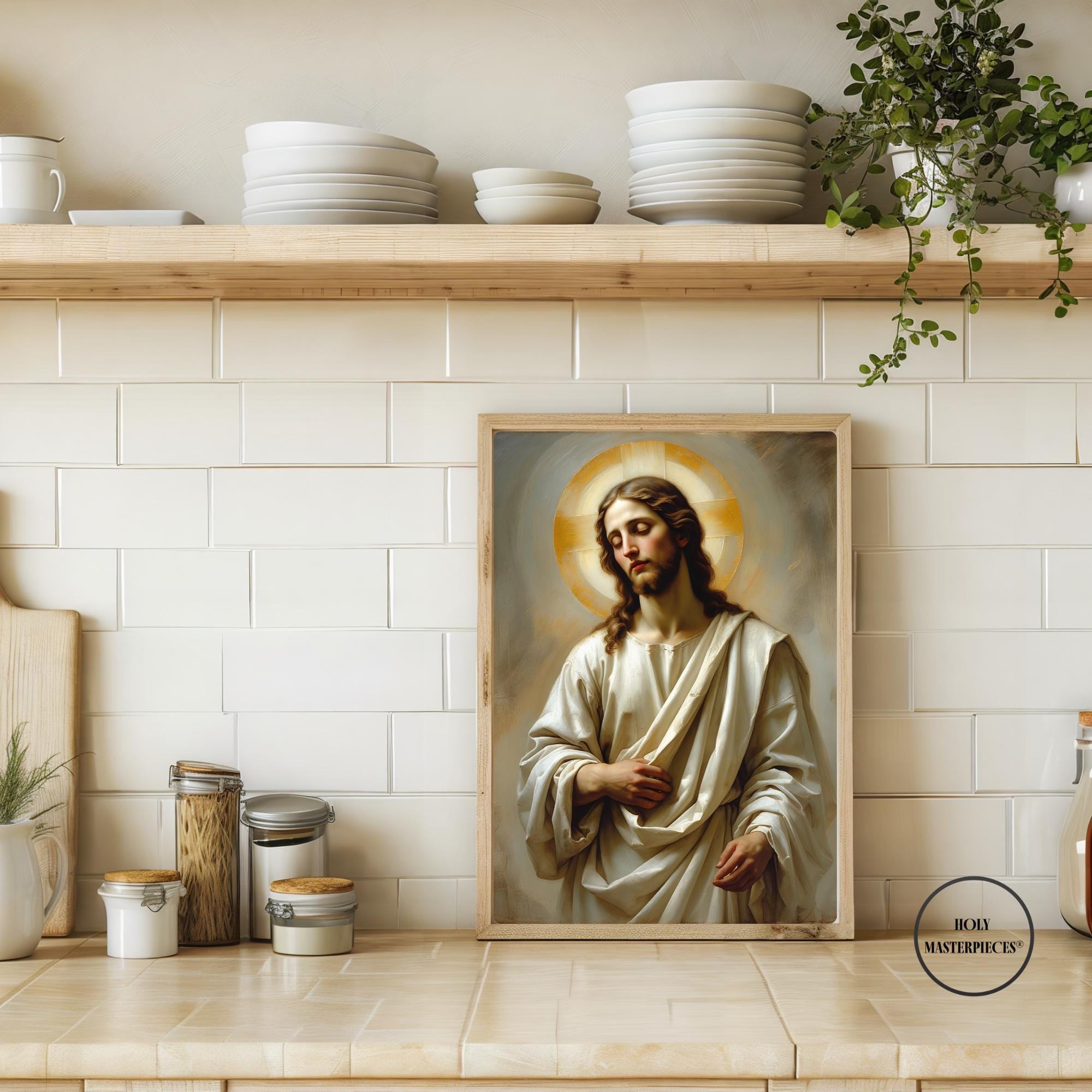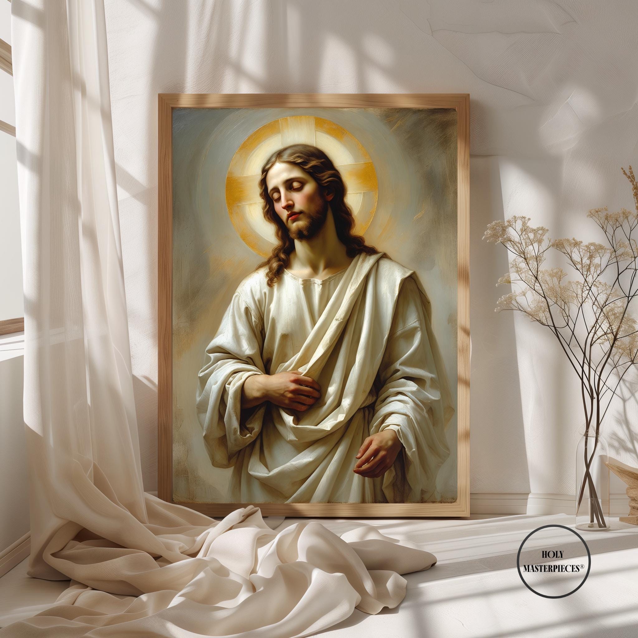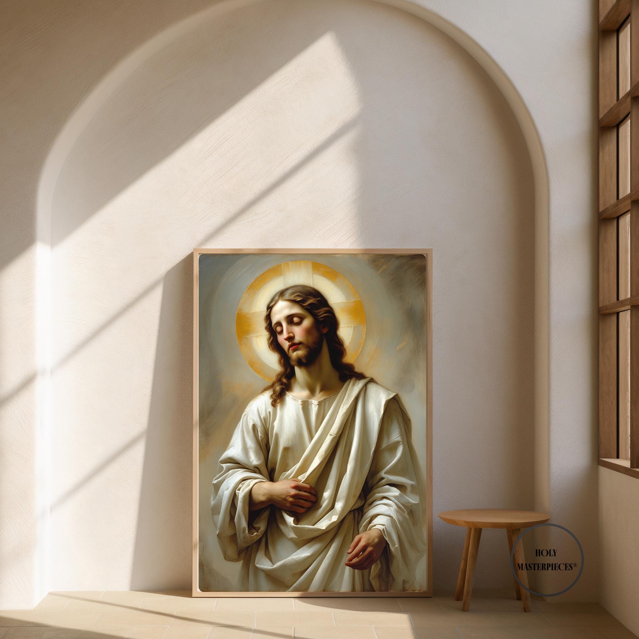 Inspired by classical 17th-century Western sacred oil painting, the artwork features softened edges, refined painterly texture, and smooth tonal transitions. The museum-like finish and tactile brushwork make this piece especially suited for prayer rooms, chapels, bedrooms, and reflective Christian interiors seeking calm and sacred stillness.