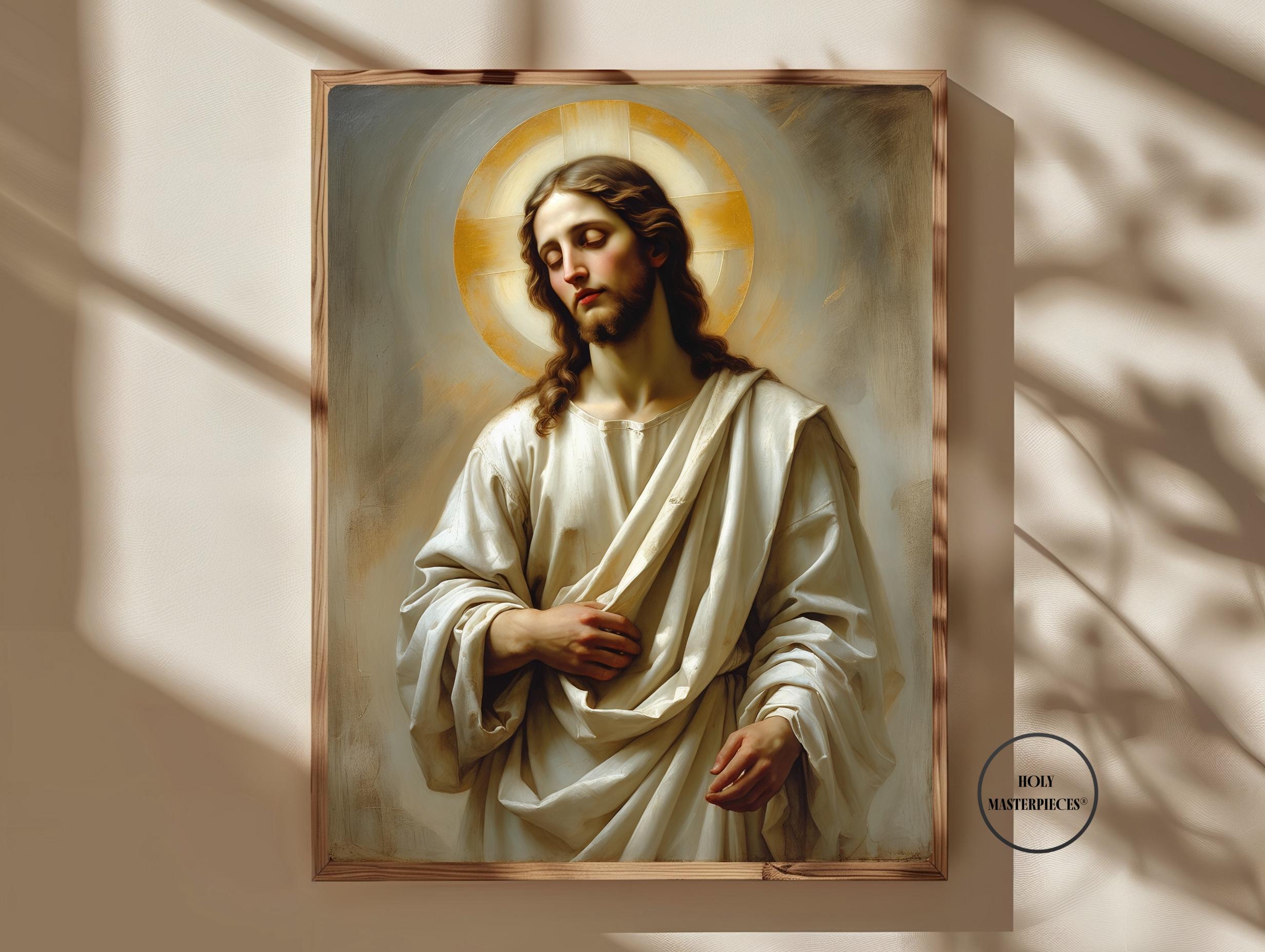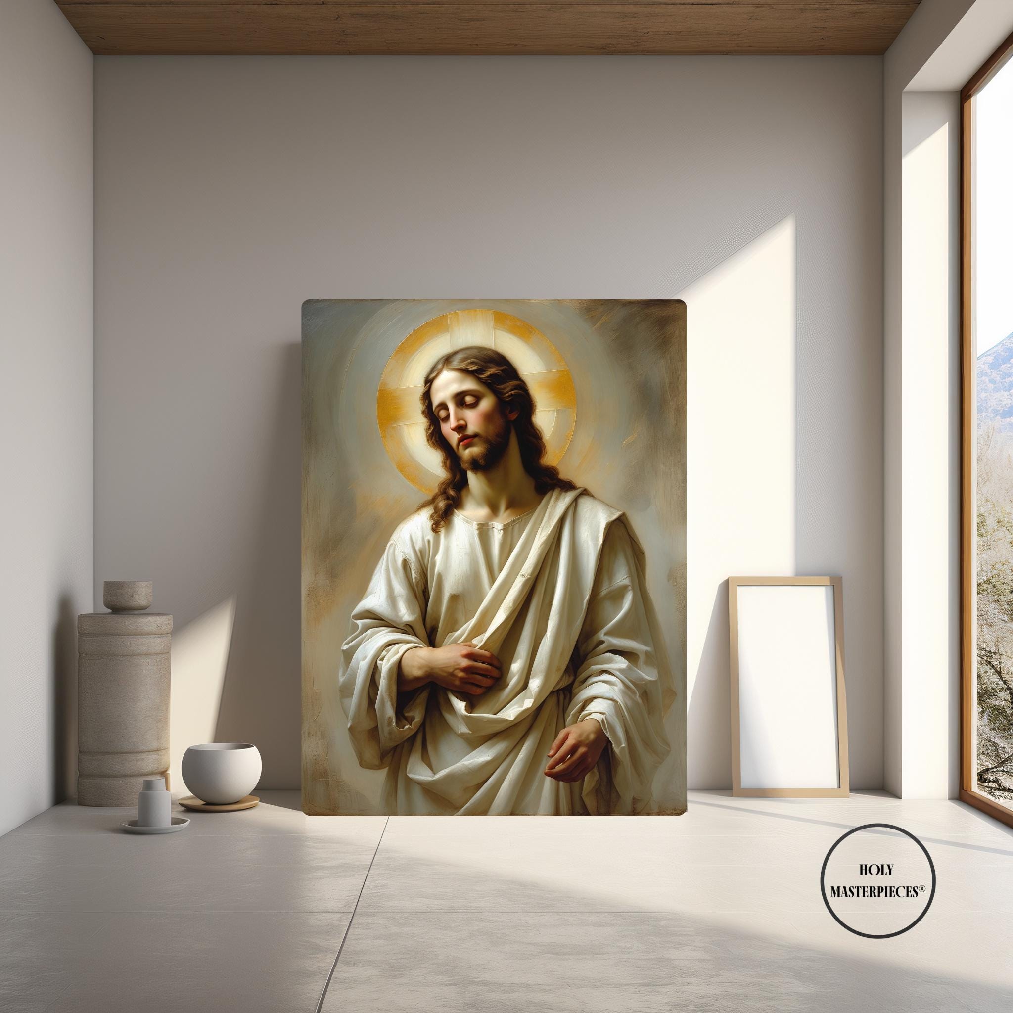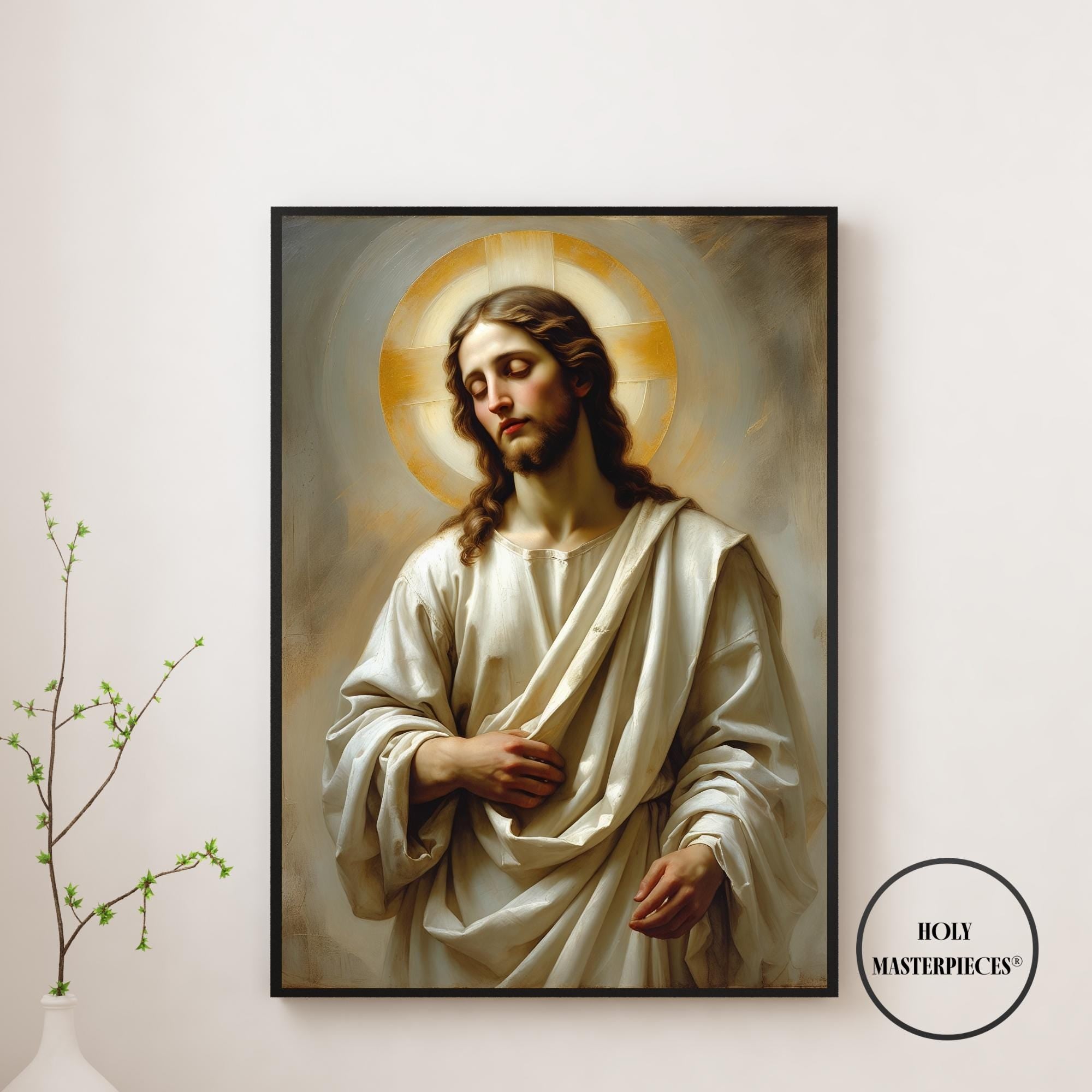Christ in White Robes portrays Christ standing in serene stillness, clothed in flowing white garments that symbolize purity, humility, and divine peace. His head is gently inclined and His expression calm and contemplative, inviting the viewer into a quiet moment of reverence. This Catholic Jesus wall art emphasizes presence and interior devotion rather than narrative action.