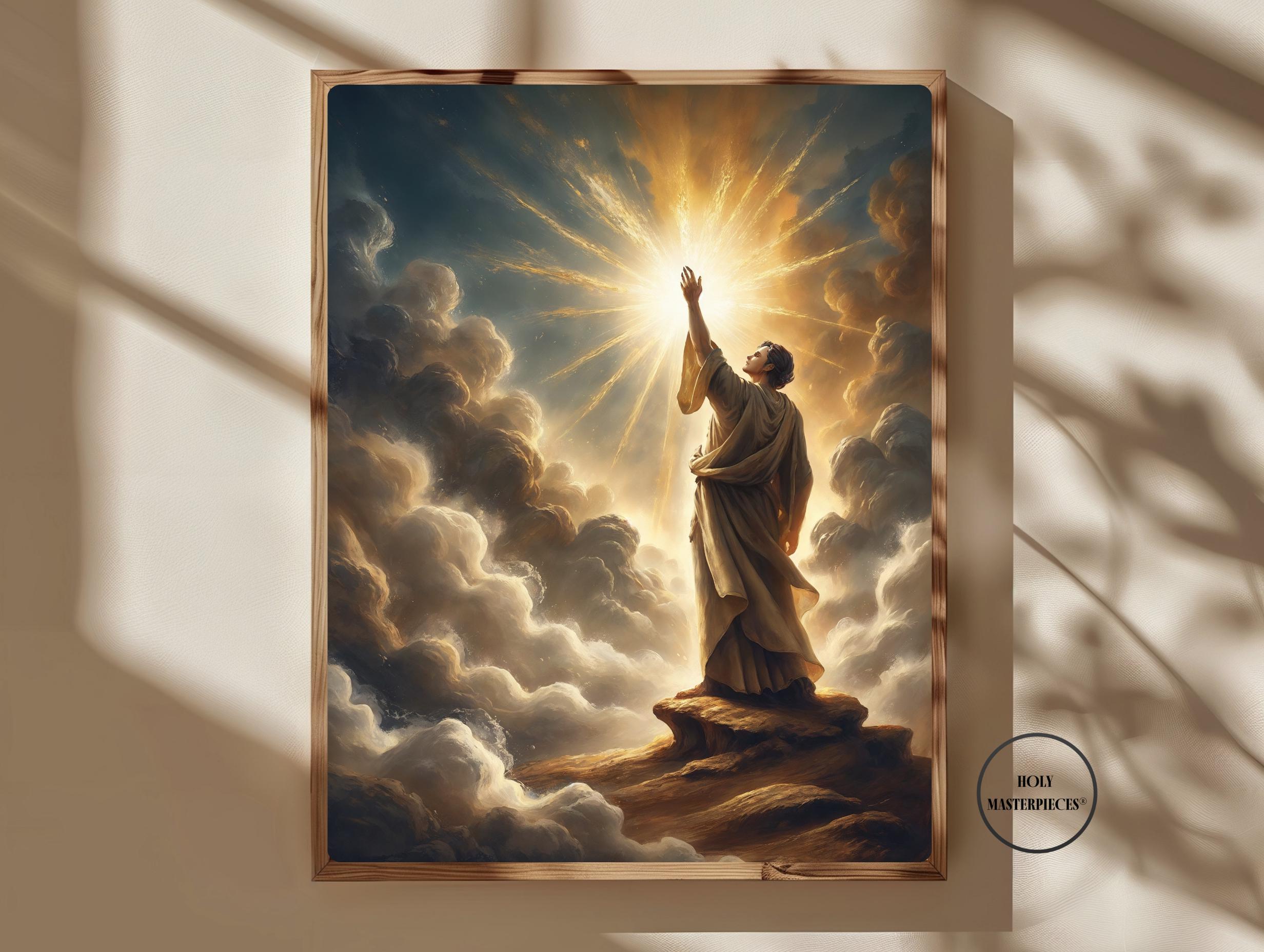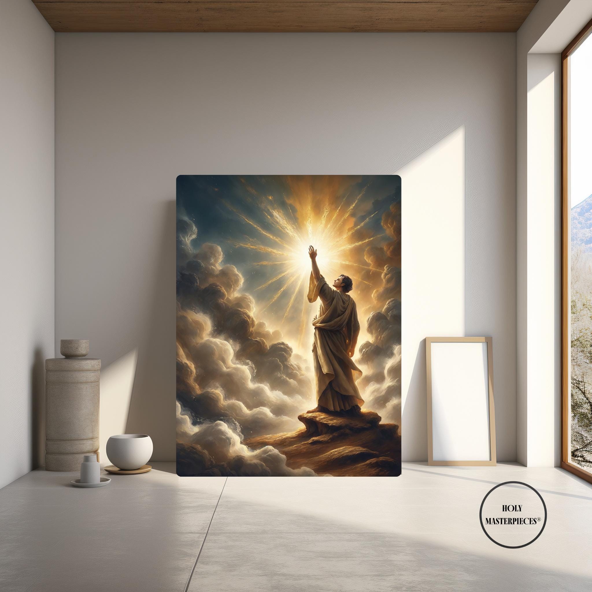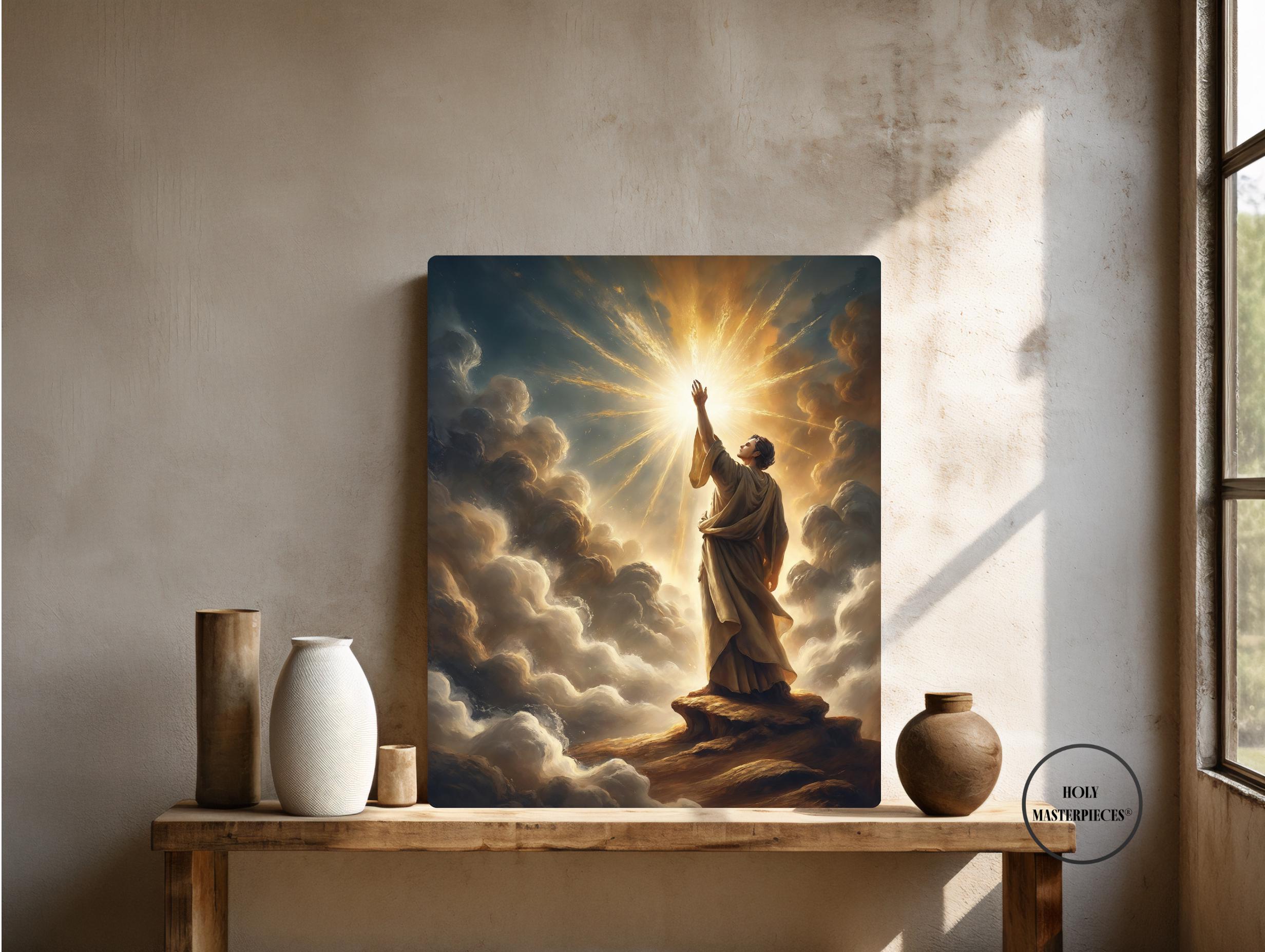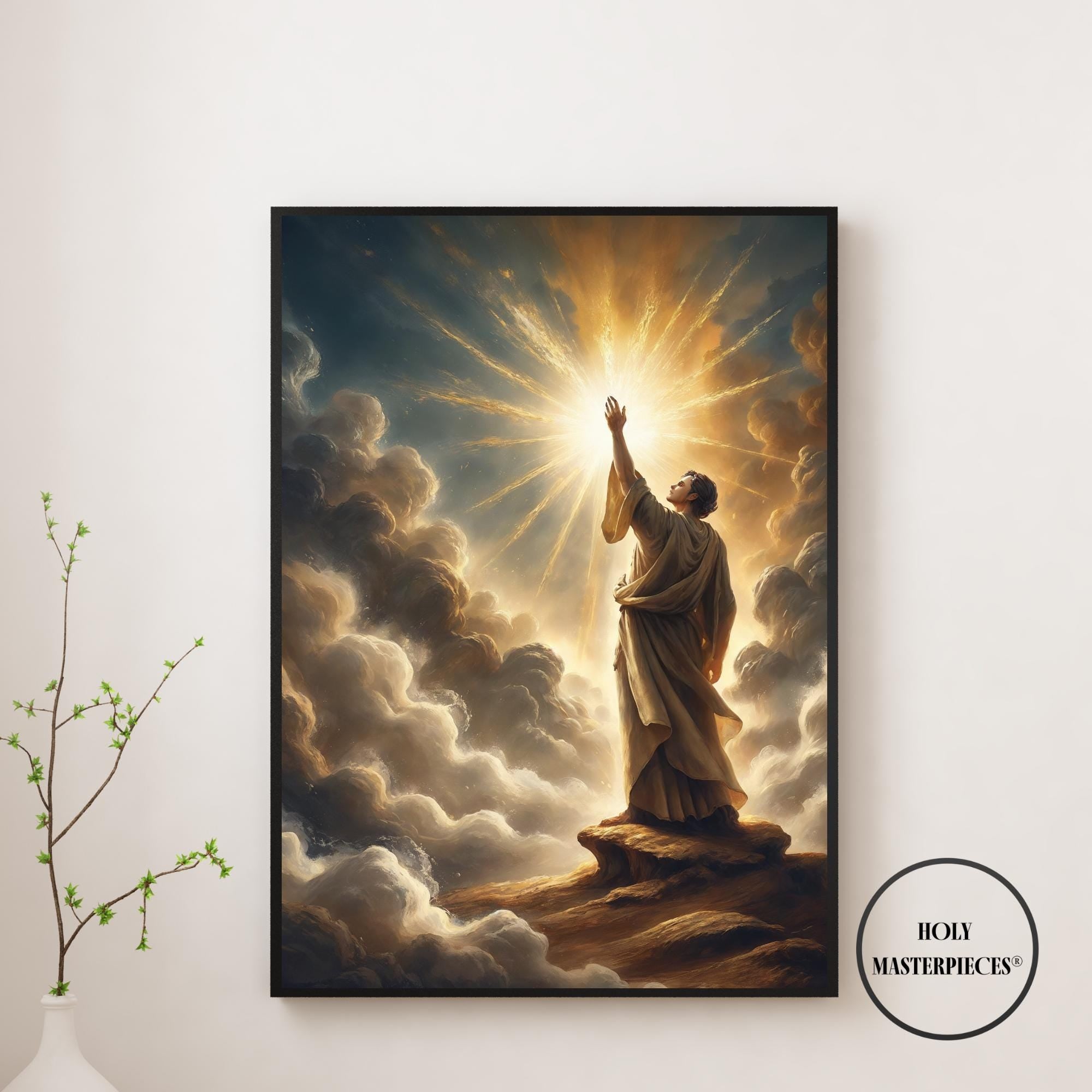 Creation of Light presents the biblical moment of divine illumination emerging from darkness, rendered with solemn authority and contemplative restraint. A robed figure stands amid swirling clouds, one arm raised as radiant light bursts forth behind Him. The gesture is deliberate rather than dramatic, conveying order, intention, and sacred command. Facial features remain softened and partially obscured by light and shadow, preserving reverence and mystery within this Old Testament Catholic wall art composition.
