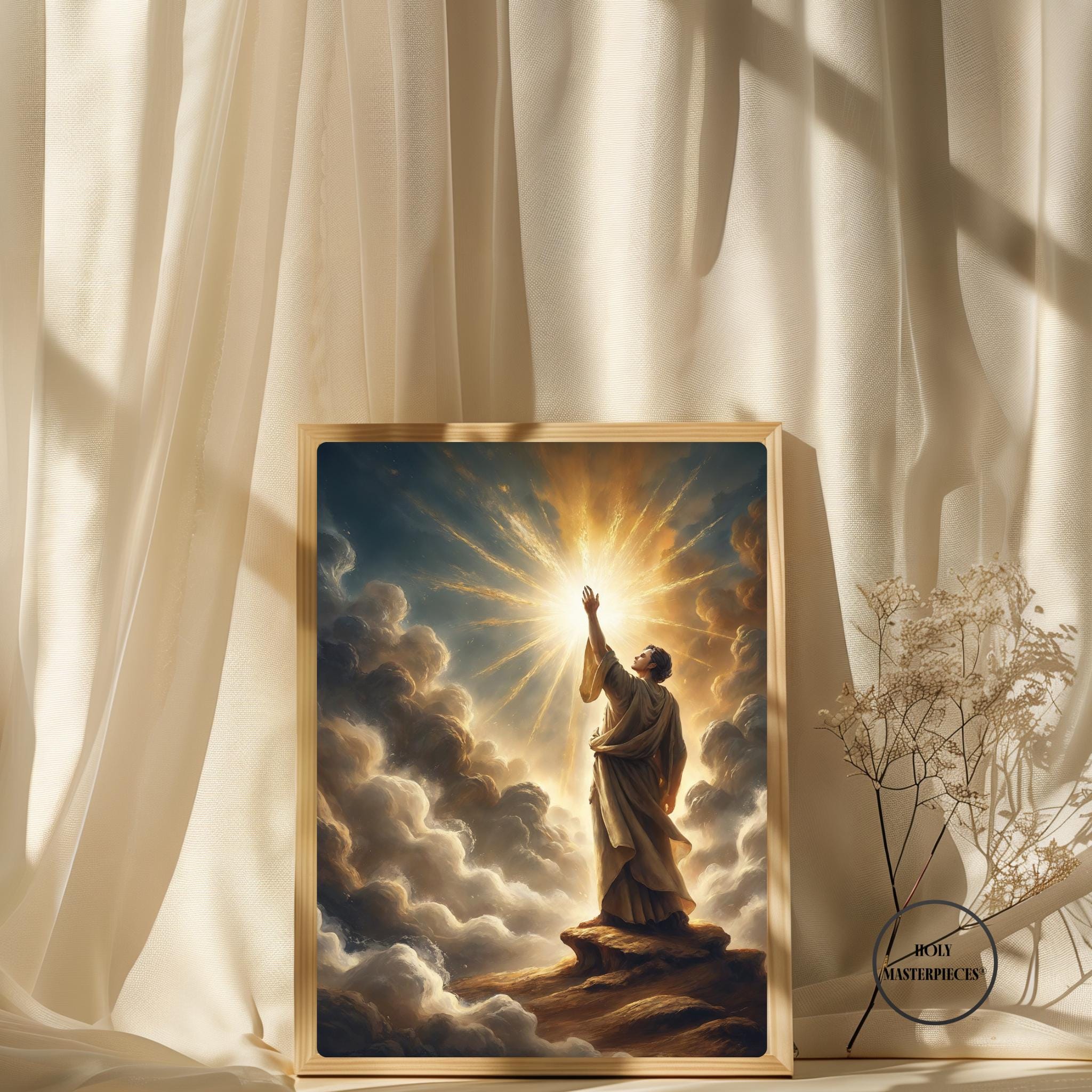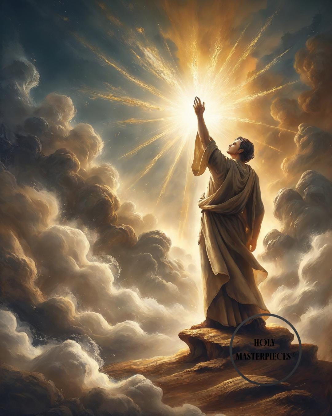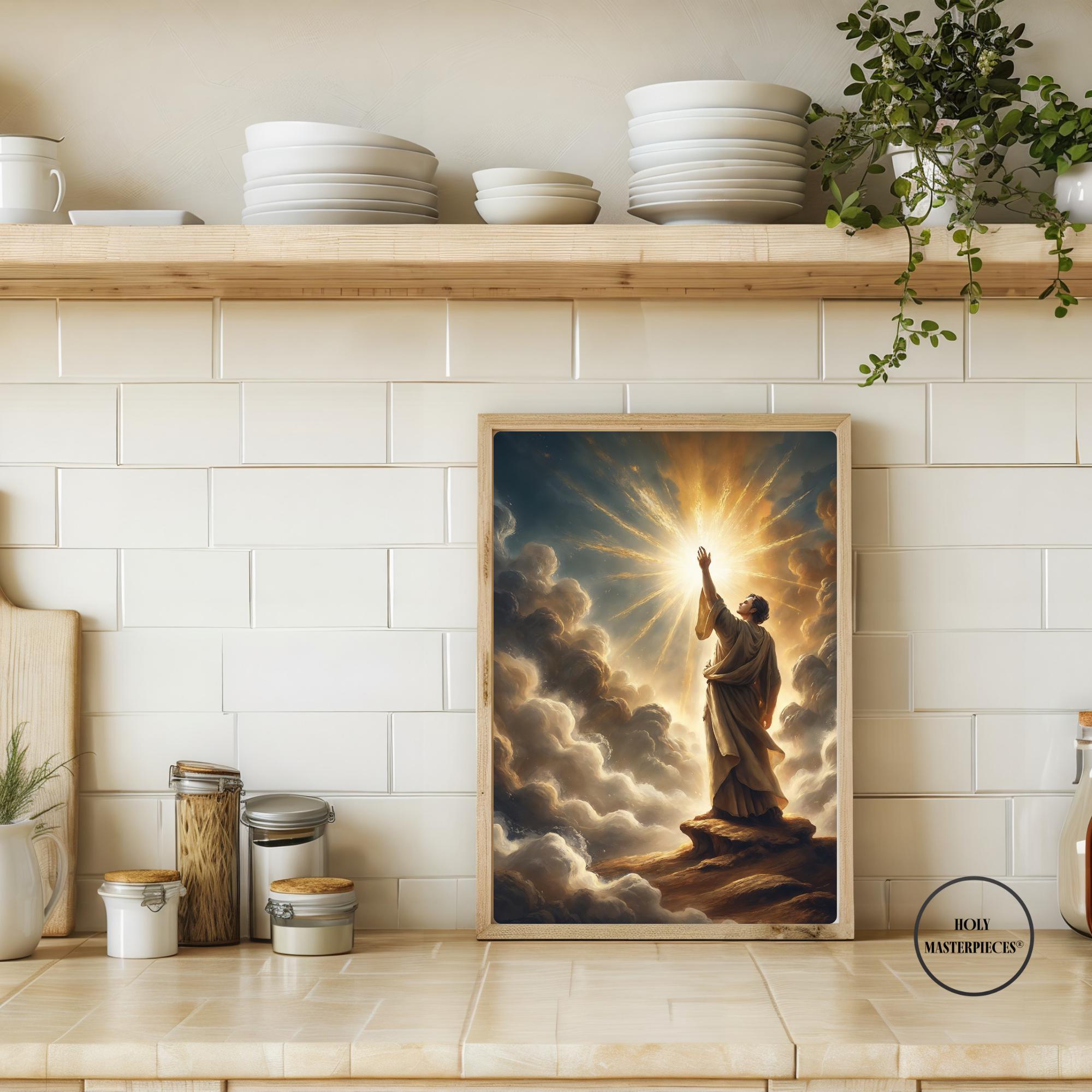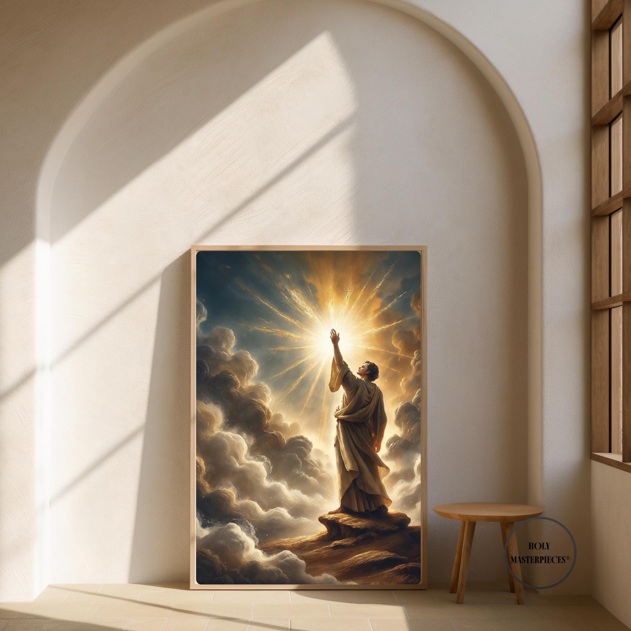 Creation of Light presents the biblical moment of divine illumination emerging from darkness, rendered with solemn authority and contemplative restraint. A robed figure stands amid swirling clouds, one arm raised as radiant light bursts forth behind Him. The gesture is deliberate rather than dramatic, conveying order, intention, and sacred command. Facial features remain softened and partially obscured by light and shadow, preserving reverence and mystery within this Old Testament Catholic wall art composition.
