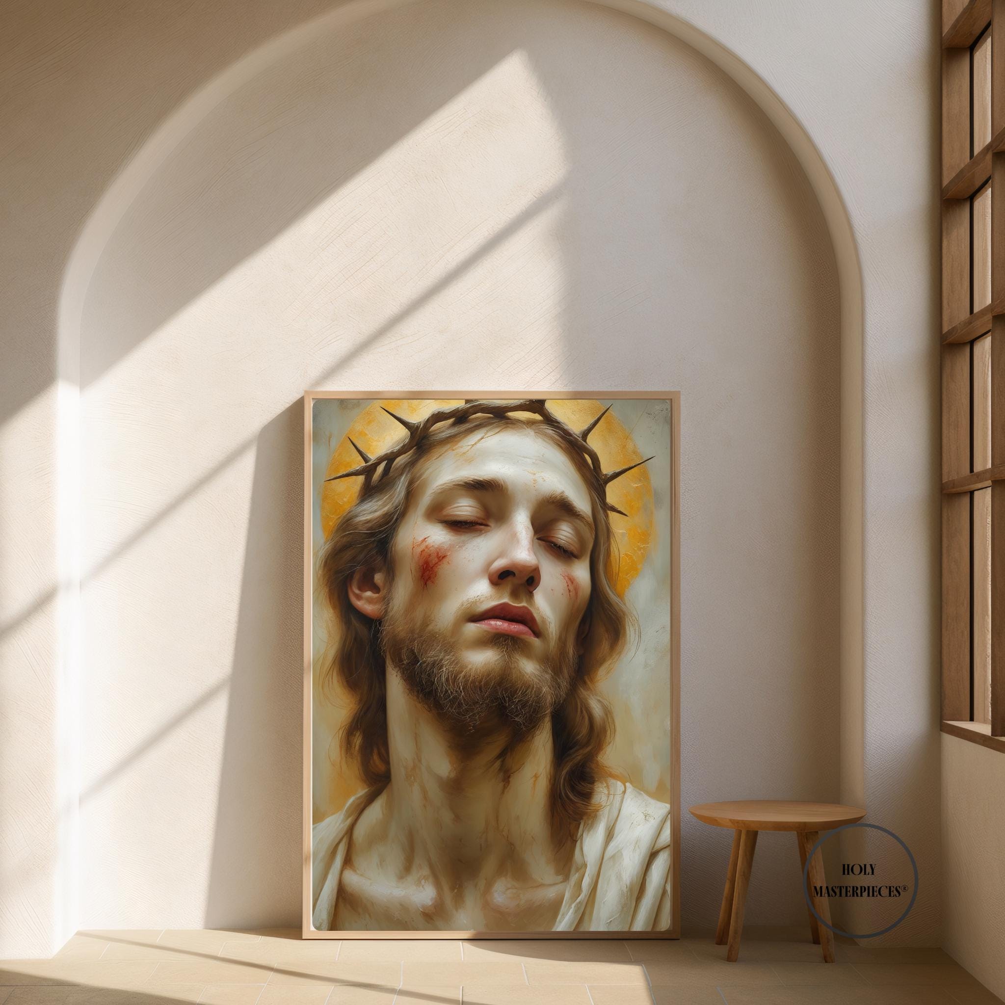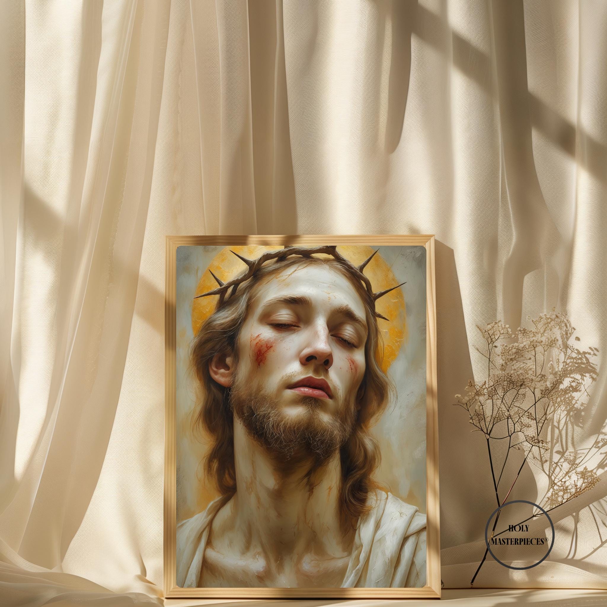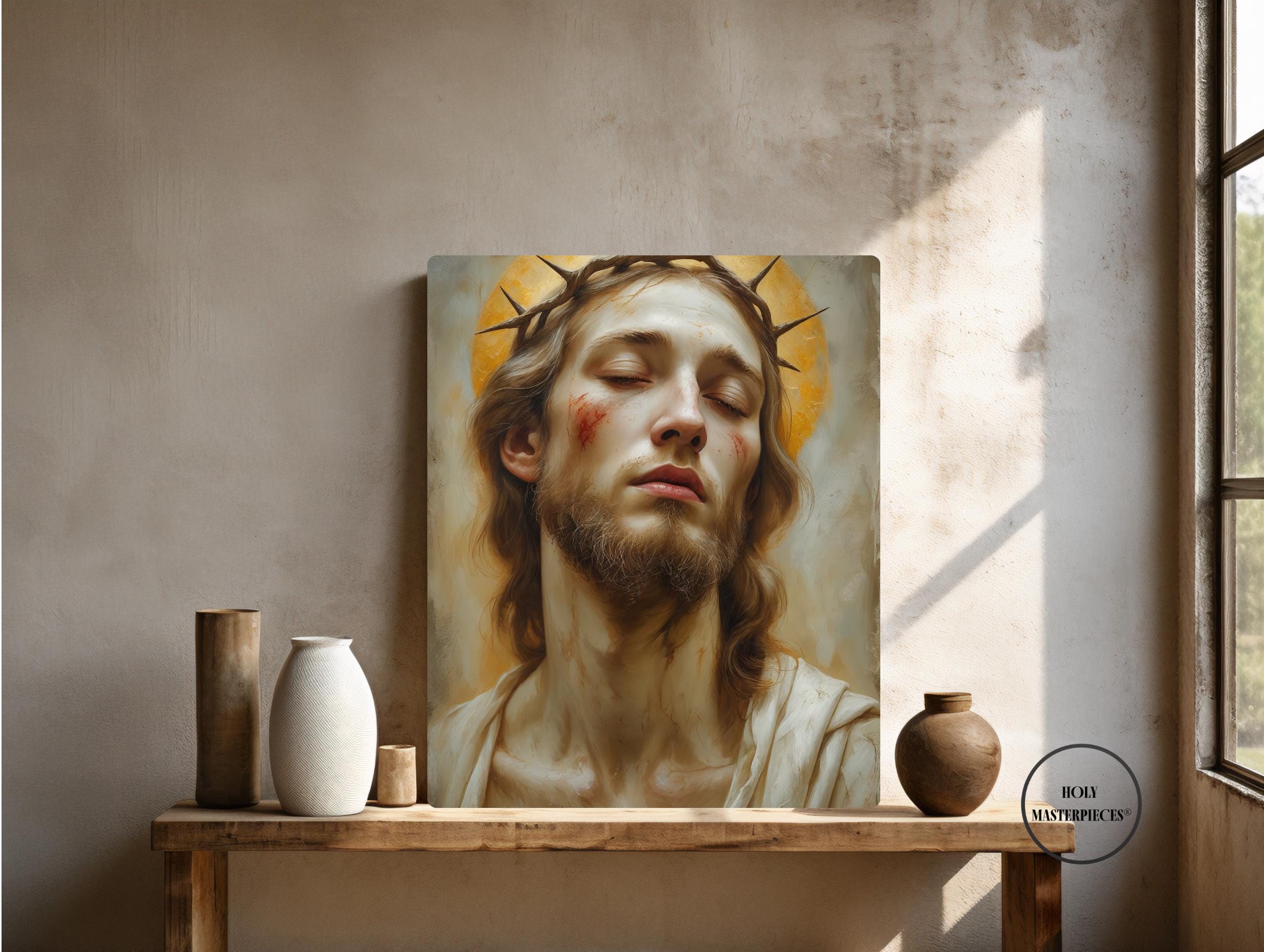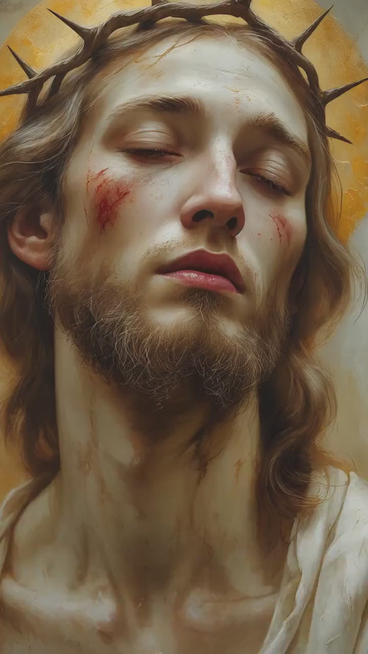Ecce Homo presents a solemn and intimate portrait of Christ, His head gently inclined and eyes lowered in quiet resignation. A crown of thorns rests upon His brow, rendered with restrained realism rather than dramatic intensity. His expression is tender and inward, conveying humility, sorrow, and silent endurance. This Catholic Jesus wall art focuses on contemplation rather than spectacle, inviting a deeply personal moment of reflection.