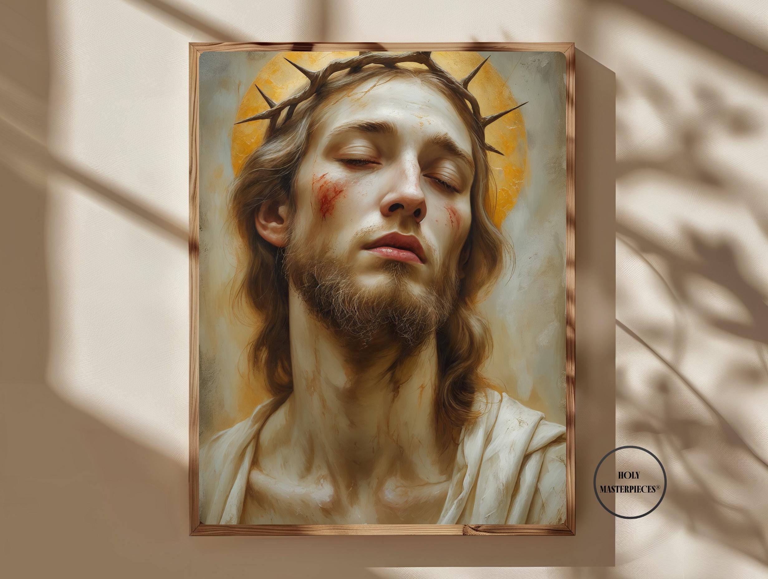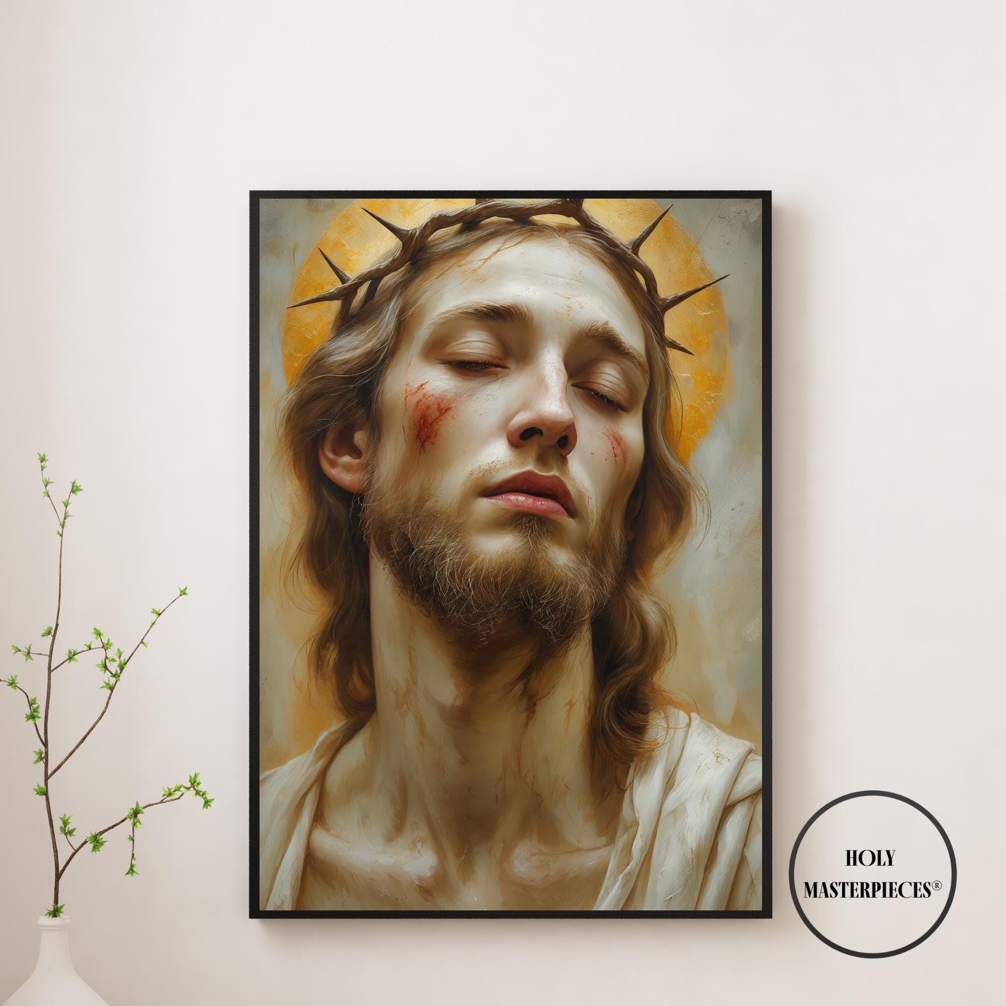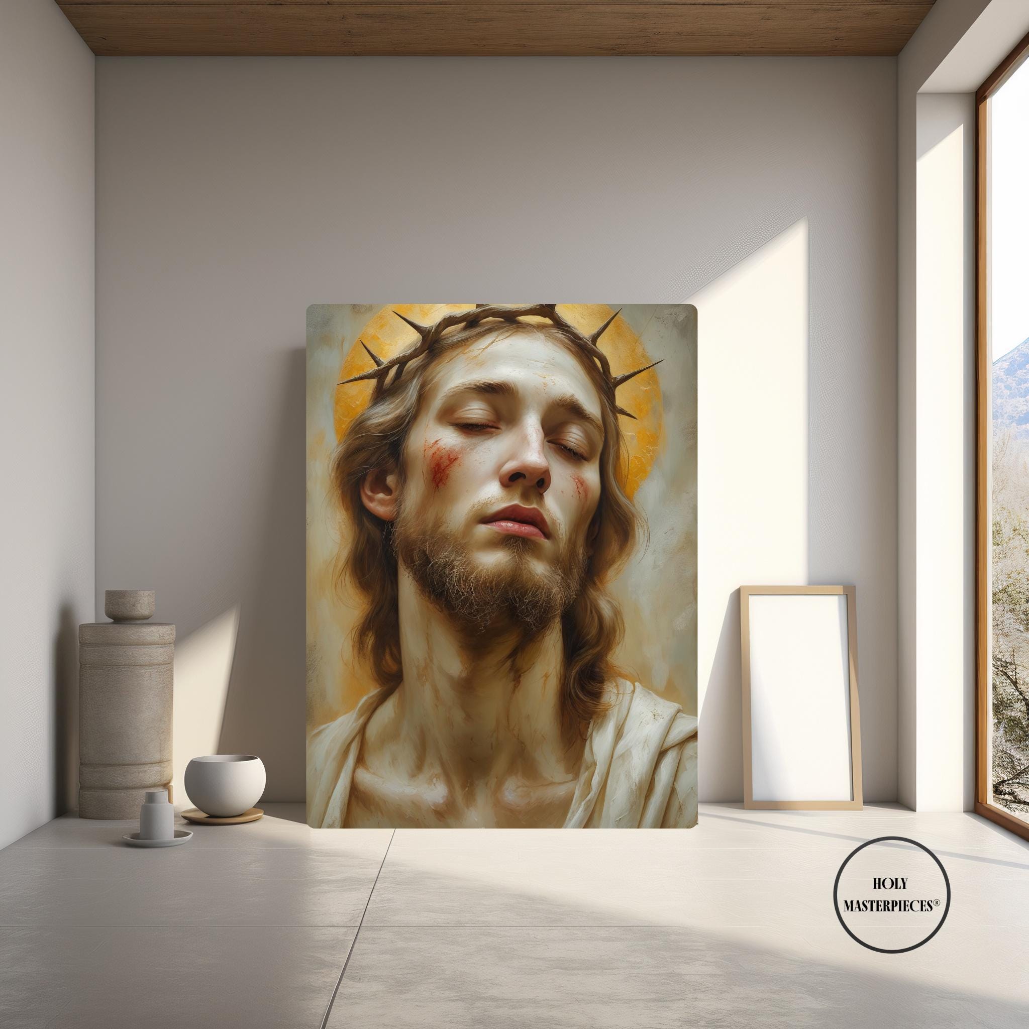Ecce Homo presents a solemn and intimate portrait of Christ, His head gently inclined and eyes lowered in quiet resignation. A crown of thorns rests upon His brow, rendered with restrained realism rather than dramatic intensity. His expression is tender and inward, conveying humility, sorrow, and silent endurance. This Catholic Jesus wall art focuses on contemplation rather than spectacle, inviting a deeply personal moment of reflection.