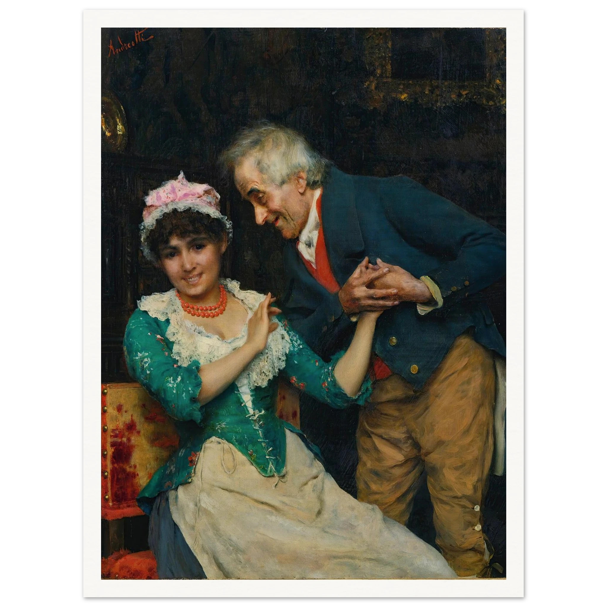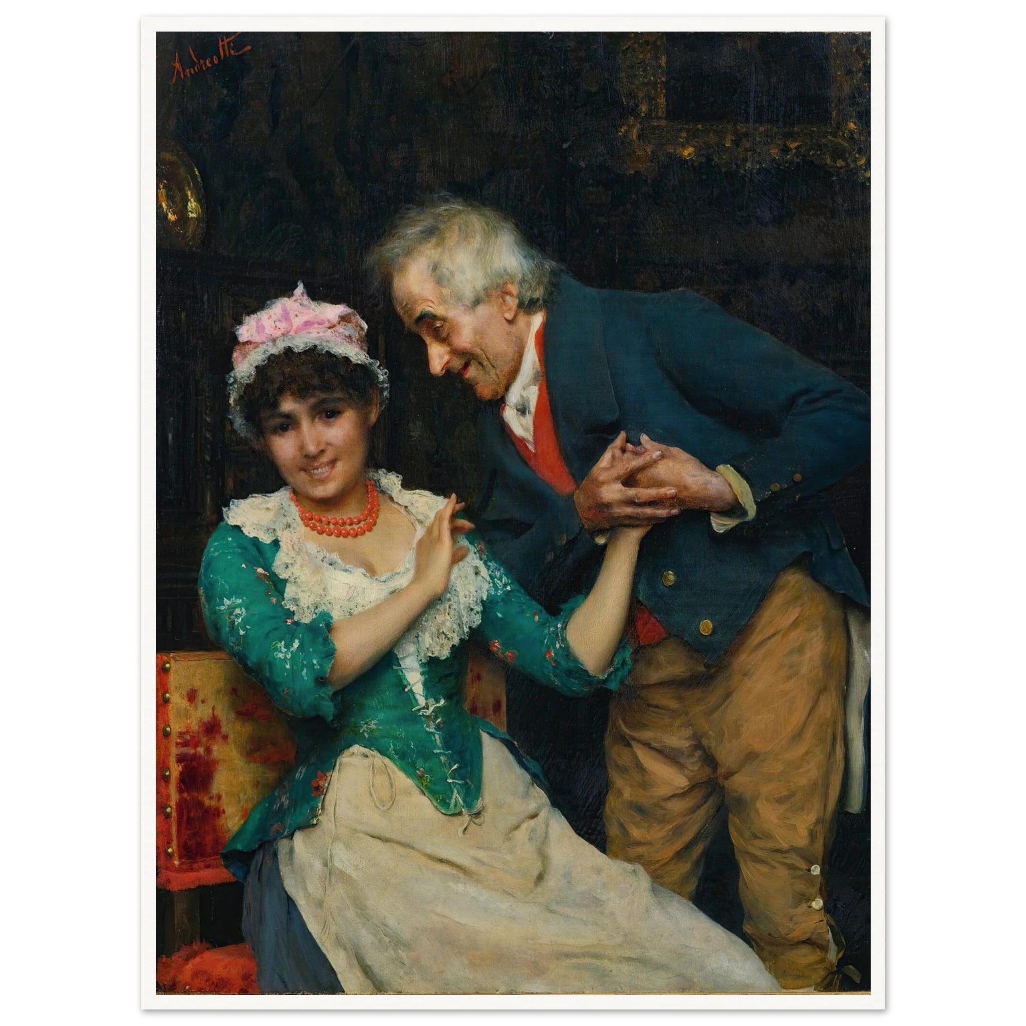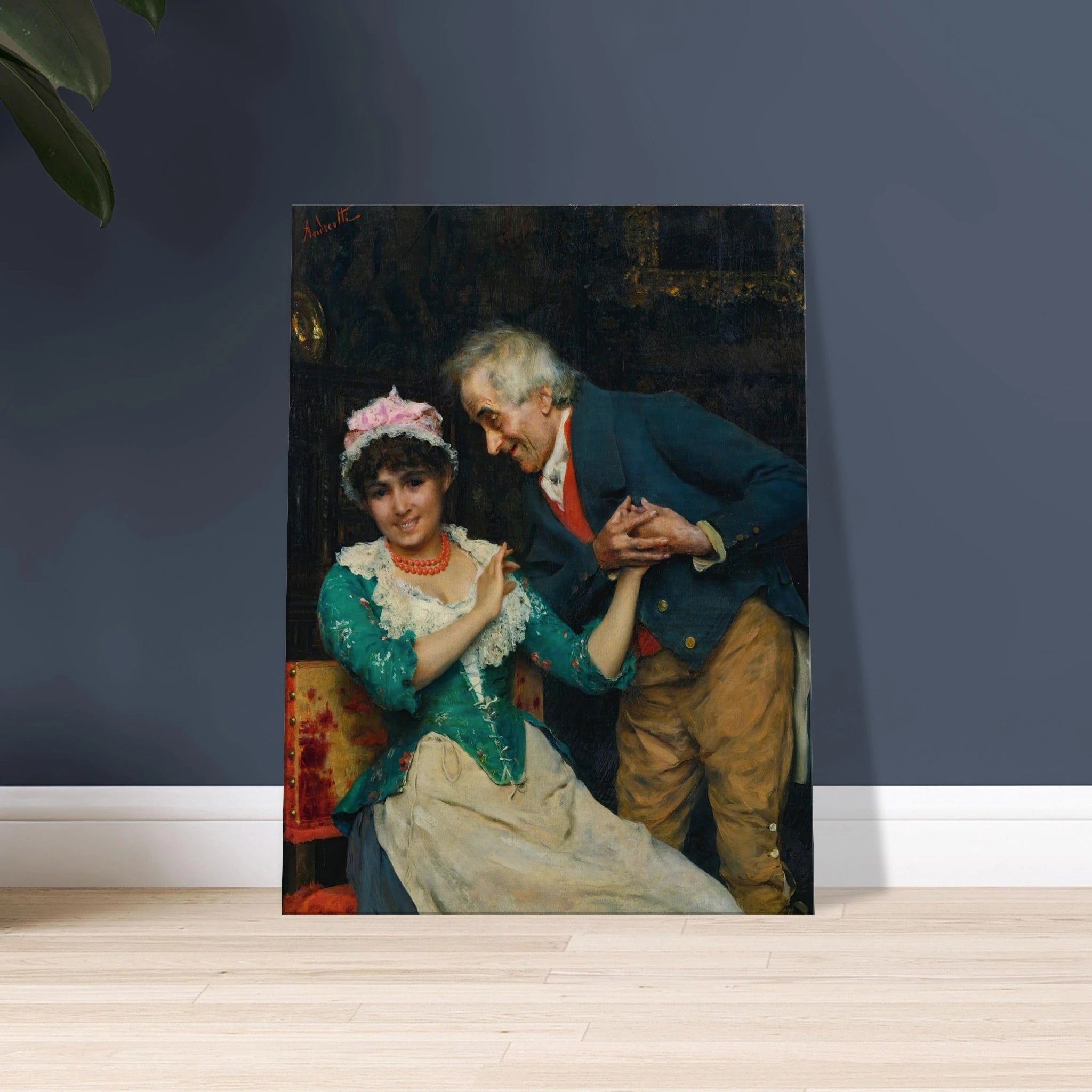 Esta pintura del siglo XIX, "Desde el corazón" de Federico Andreotti, es un ejemplo sorprendente del estilo romántico del artista. Con detalles intrincados y colores intensos, esta pieza captura la esencia del amor y la devoción. Una obra imprescindible para cualquier coleccionista de arte y amante del Romanticismo.