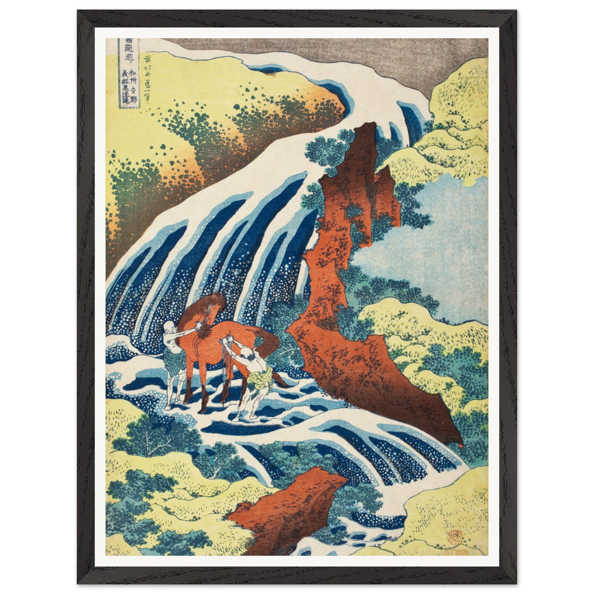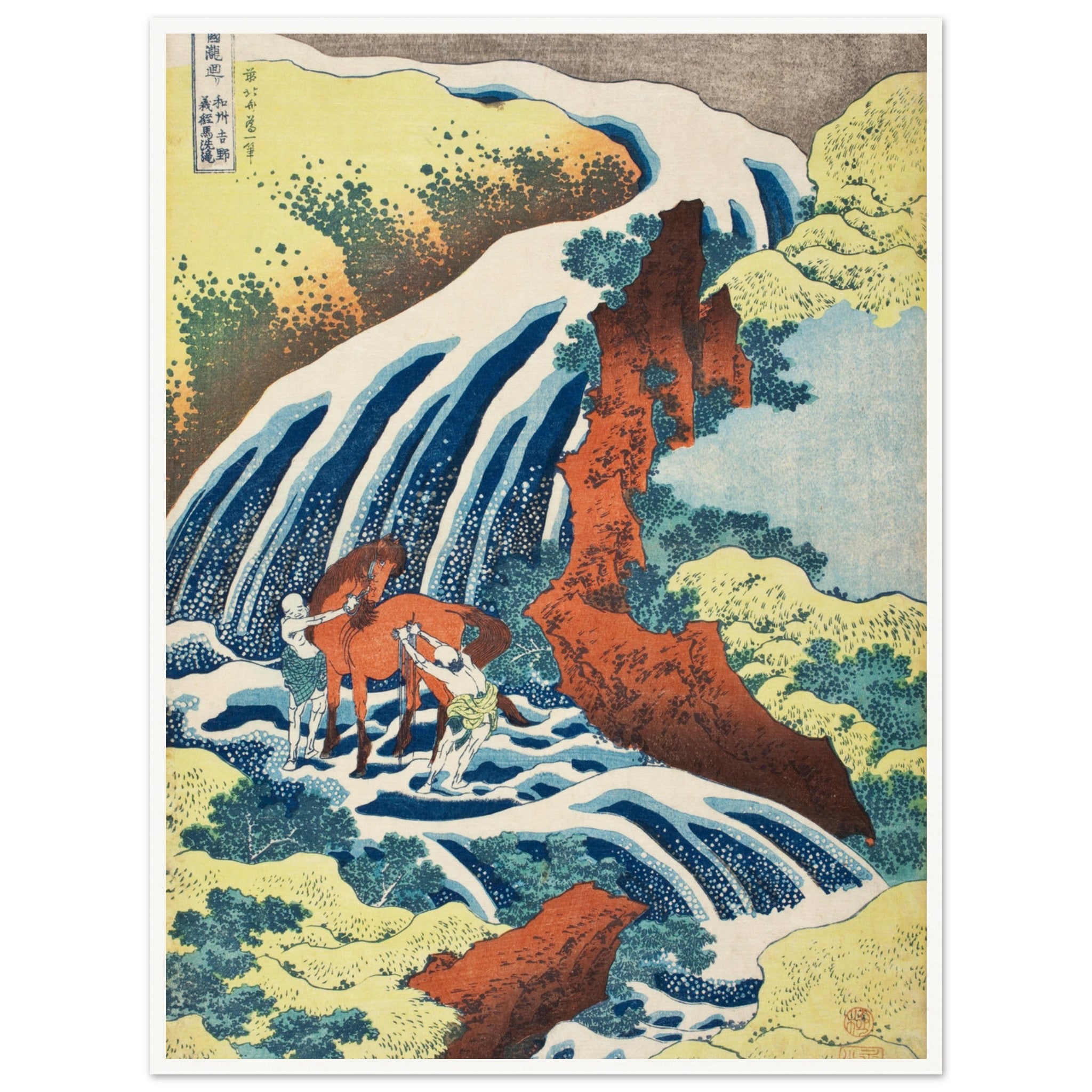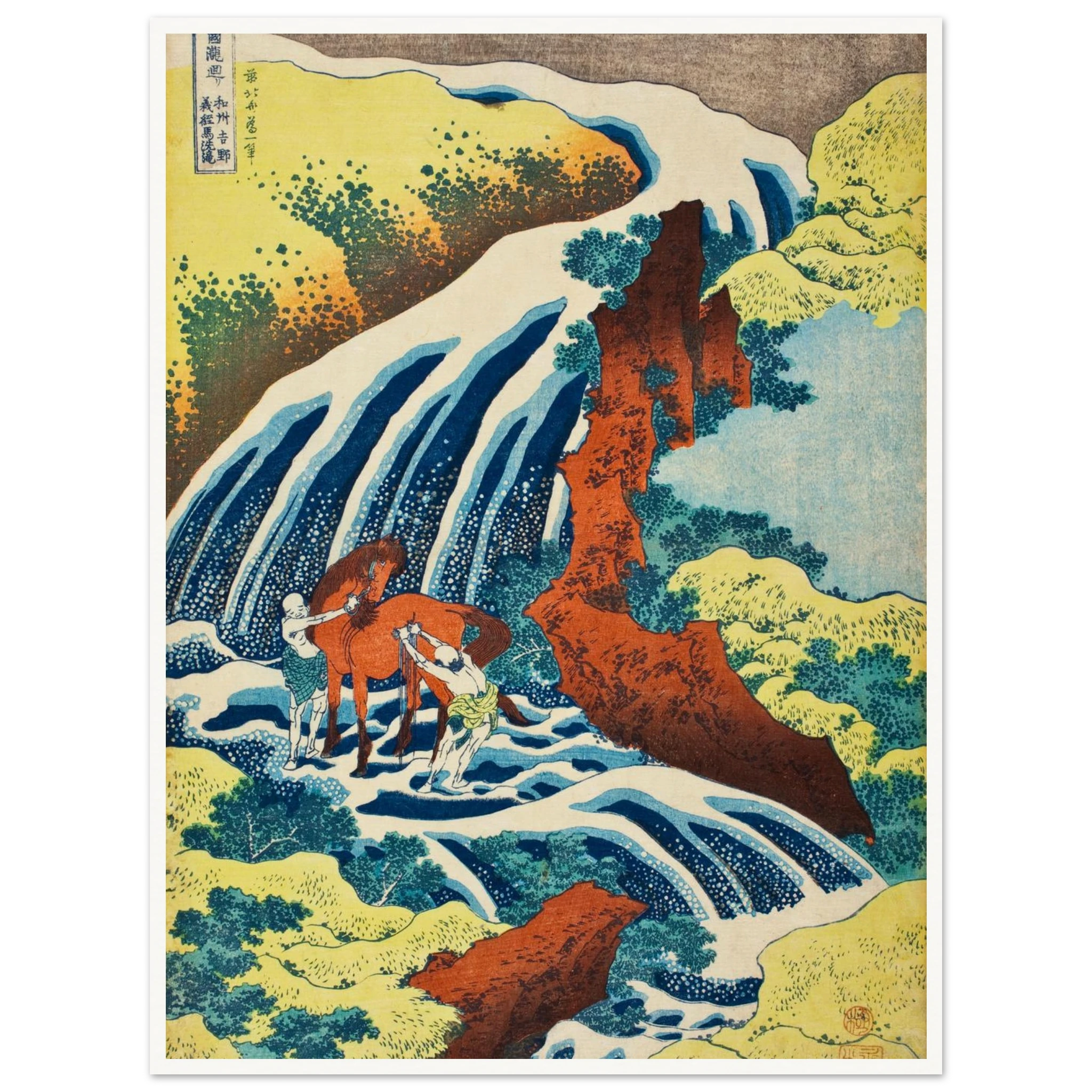 Experimente la belleza del arte japonés con la cascada de Yoshitsune para lavar caballos en Yoshino, 1833, de Hokusai. Esta obra maestra captura la tranquilidad de la naturaleza y la habilidad del artista, transportándolo a la impresionante escena con cada mirada. Agregue un toque de elegancia a su espacio con esta pieza única y atemporal.