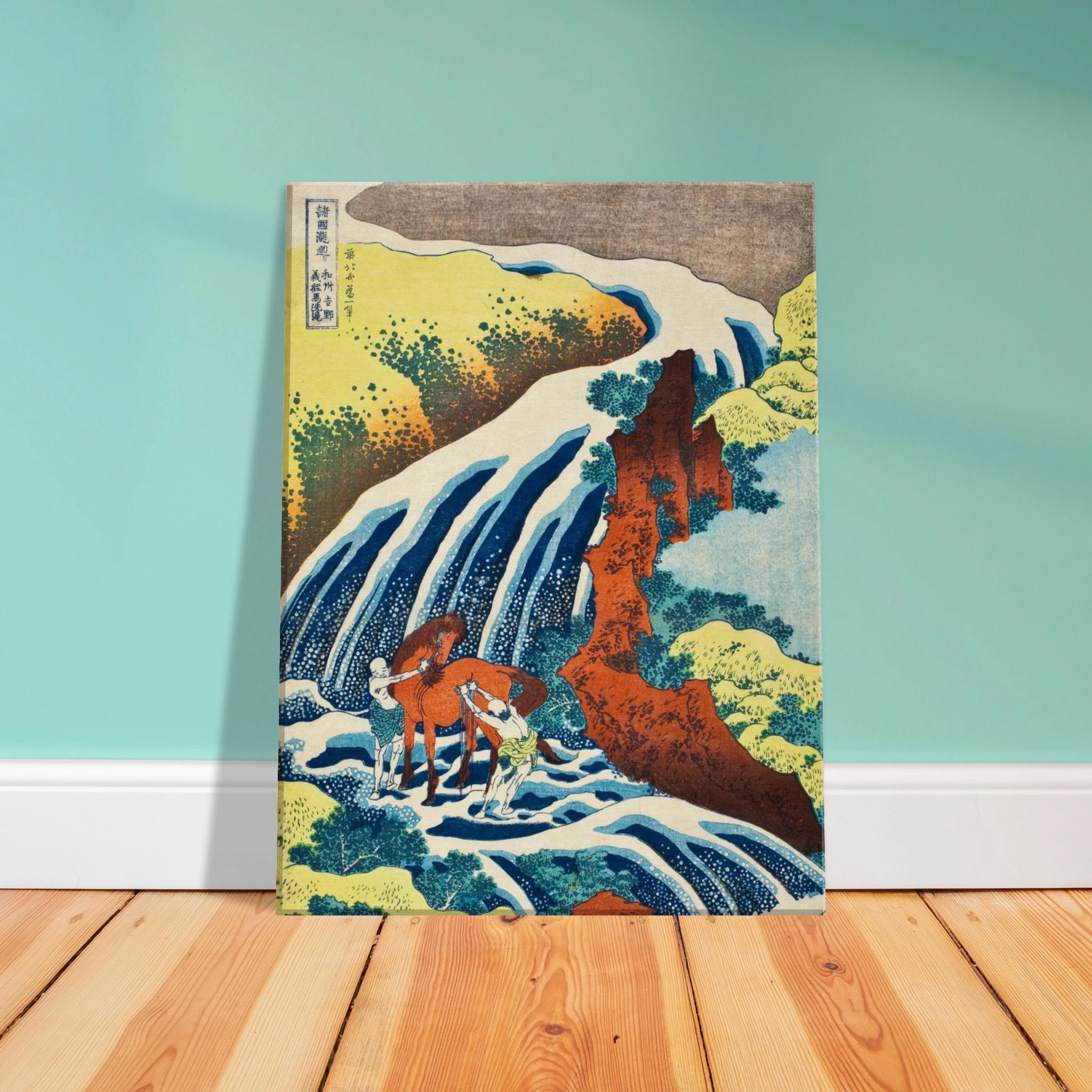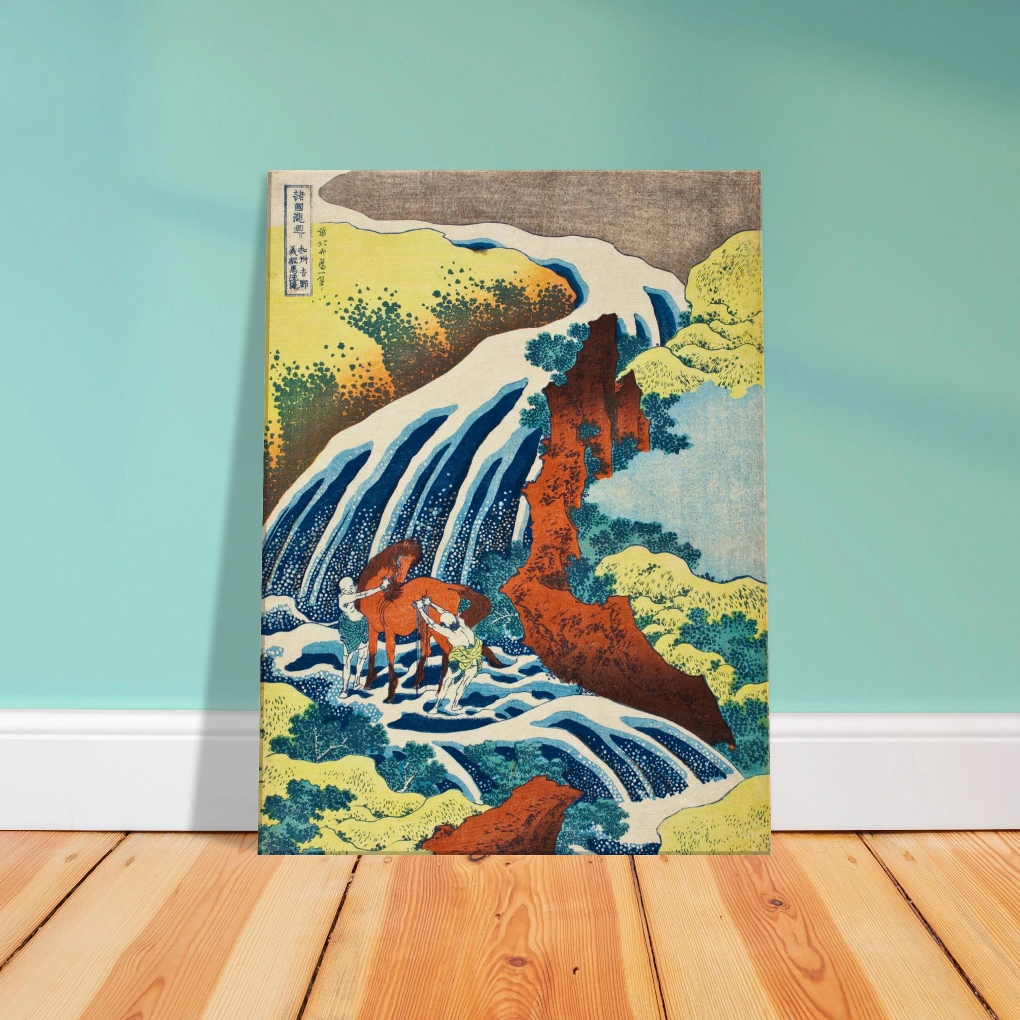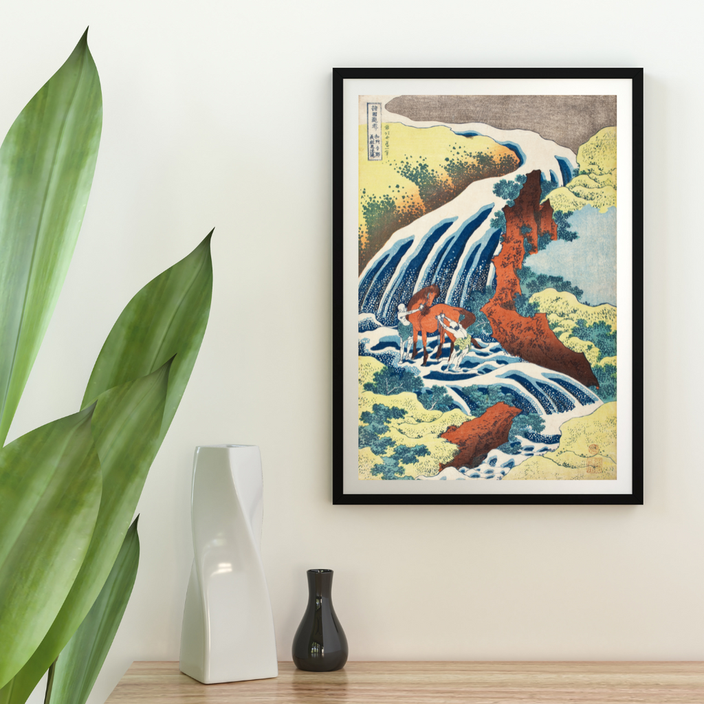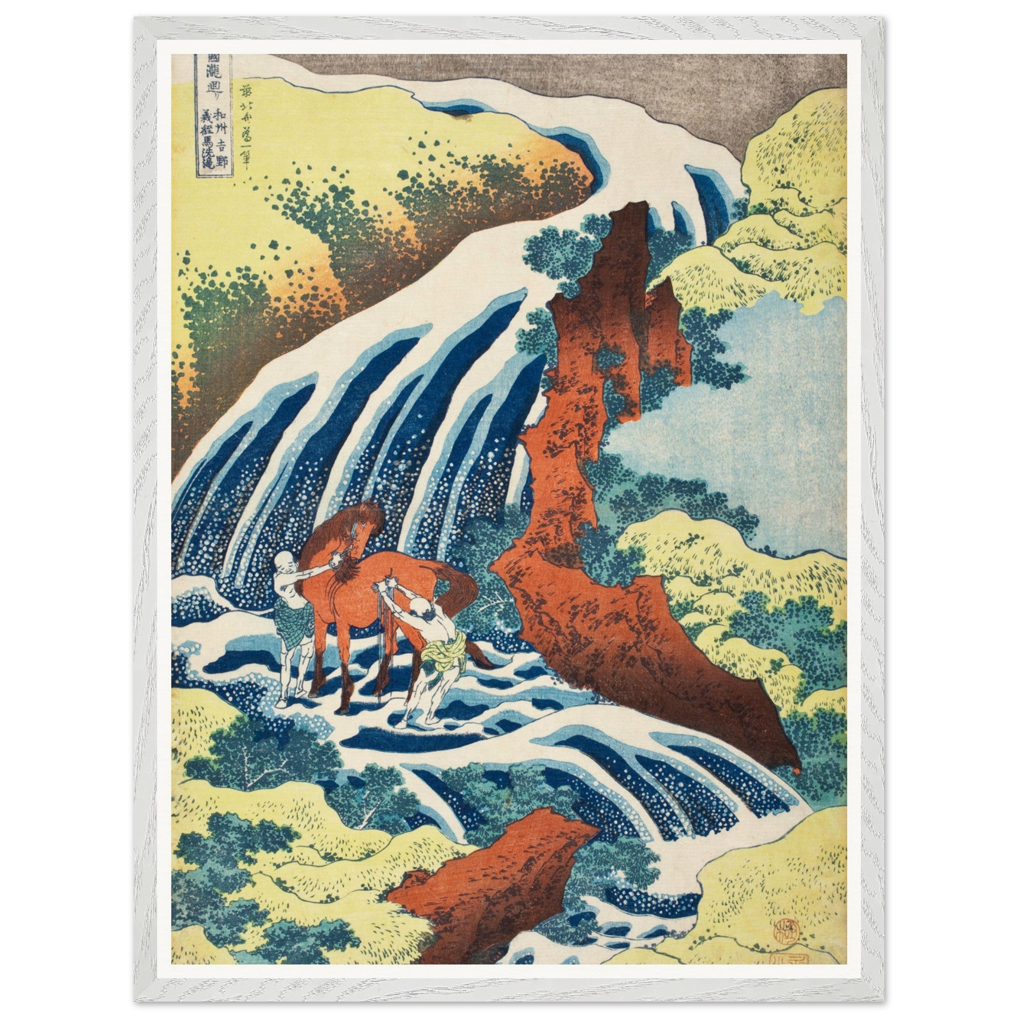Experimente la belleza del arte japonés con la cascada de Yoshitsune para lavar caballos en Yoshino, 1833, de Hokusai. Esta obra maestra captura la tranquilidad de la naturaleza y la habilidad del artista, transportándolo a la impresionante escena con cada mirada. Agregue un toque de elegancia a su espacio con esta pieza única y atemporal.