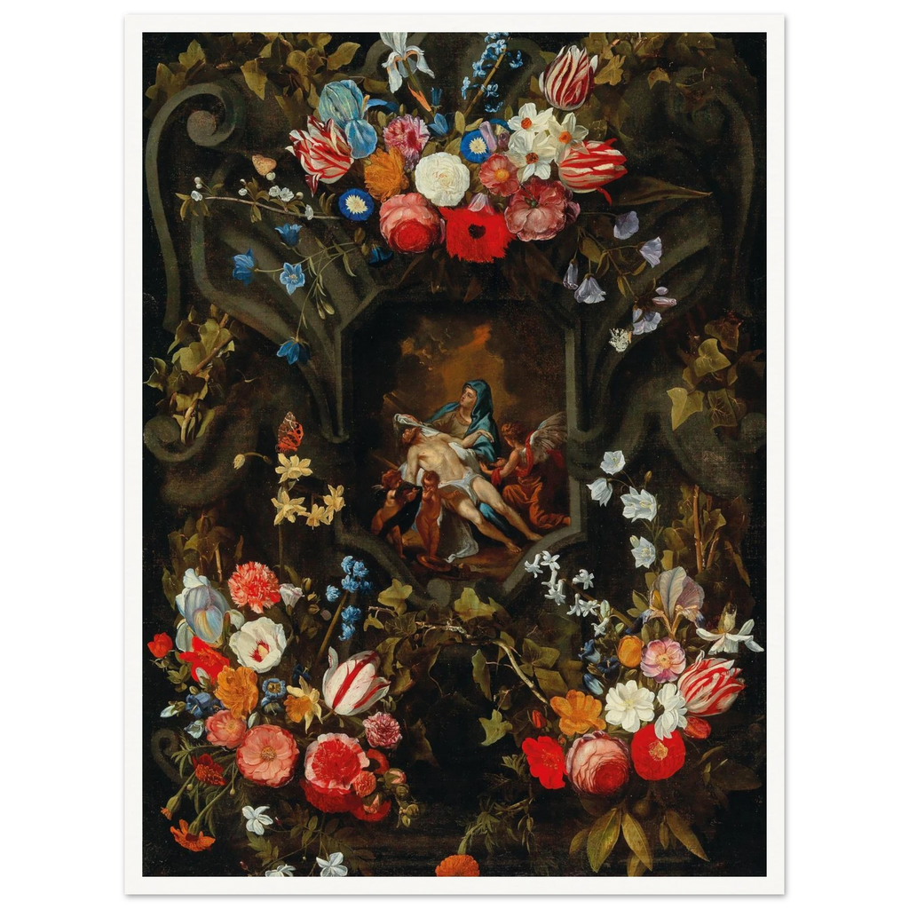 Experience the beauty of the 17th century with Jan Philips van Thielen's intricate masterpiece, "A garland of flowers surrounding a cartouche with a Pietà." Behold the expertly crafted flowers and the detailed Pietà, all enclosed in a stunning cartouche. This work of art is sure to add elegance and sophistication to any space.