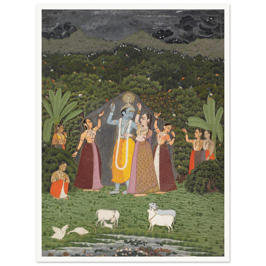 Experimente la belleza y la serenidad de esta impresionante obra maestra, "Krishna y las gopis se refugian de la lluvia, 1760". Sumérjase en la historia de Krishna y su amor por las gopis mientras buscan refugio de la lluvia. Con detalles intrincados y colores vibrantes, esta pintura lo transportará a un mundo de devoción y amor.