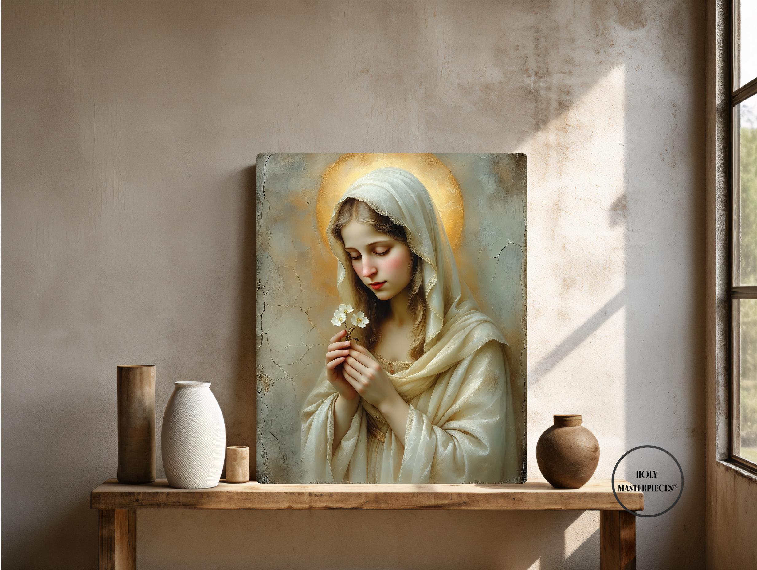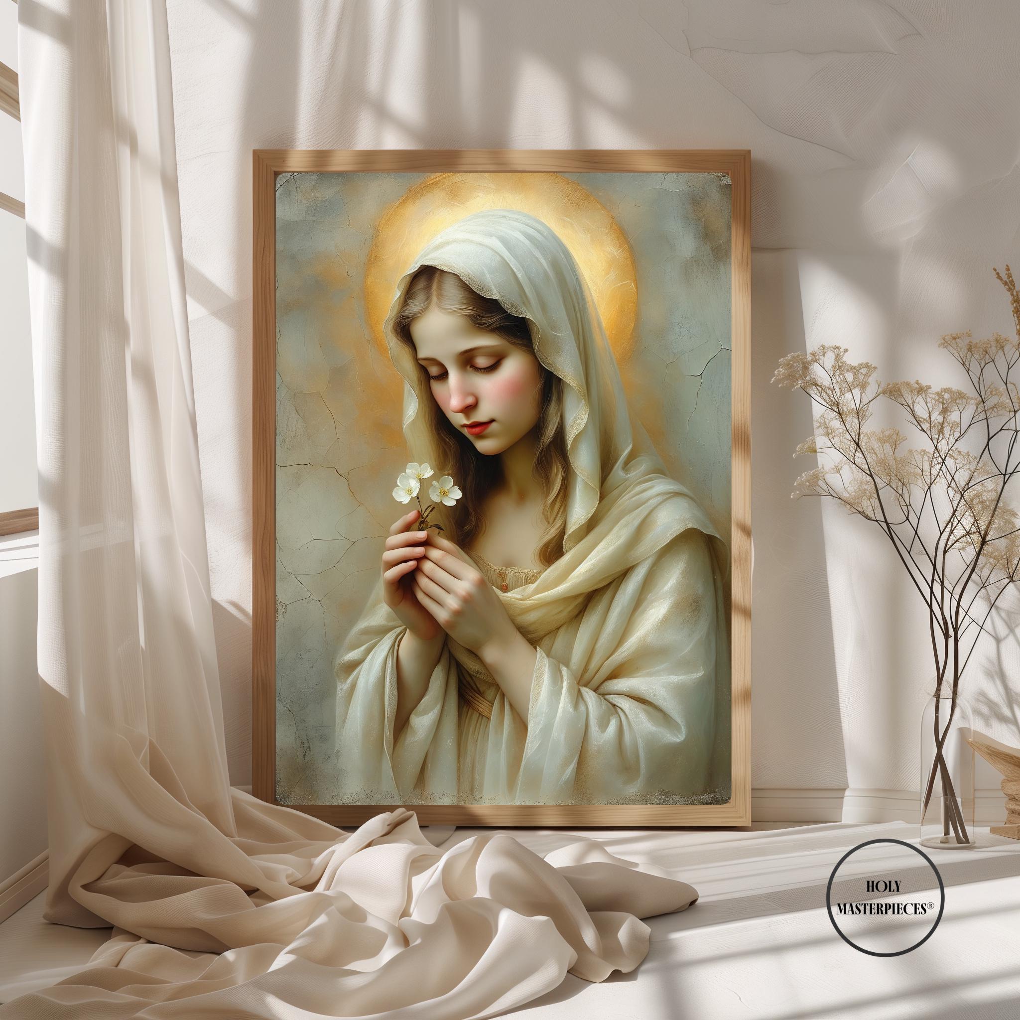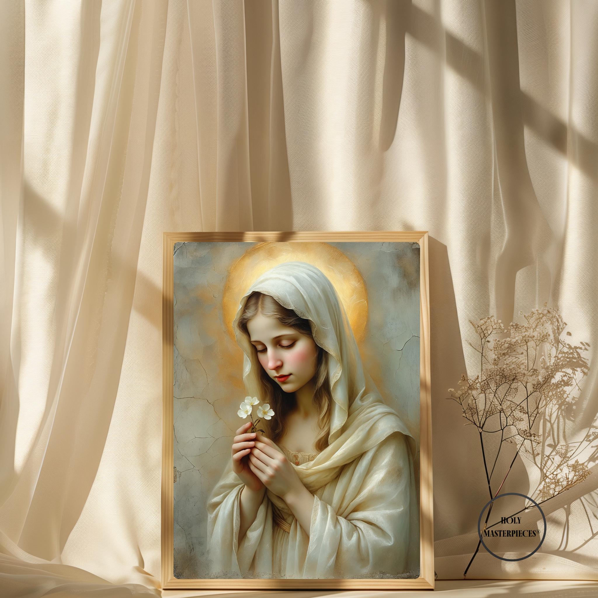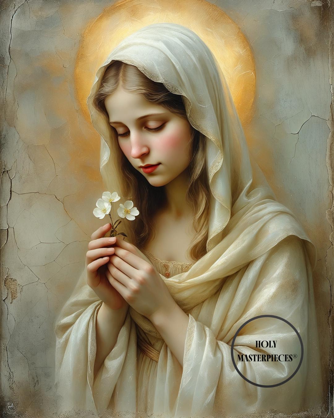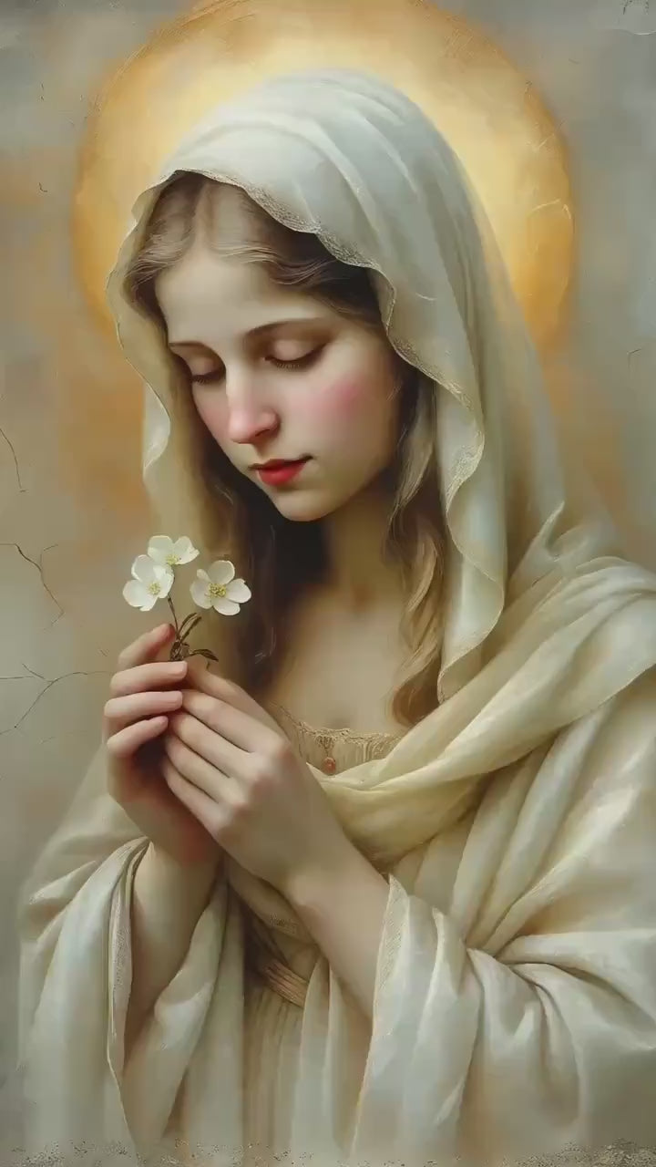 This sacred Marian artwork portrays the Blessed Virgin in quiet tenderness, holding a delicate blossom that symbolizes purity, humility, and the gentle unfolding of God’s grace. Her eyes are softly lowered in prayerful stillness, inviting the viewer into a moment of calm devotion and interior peace.