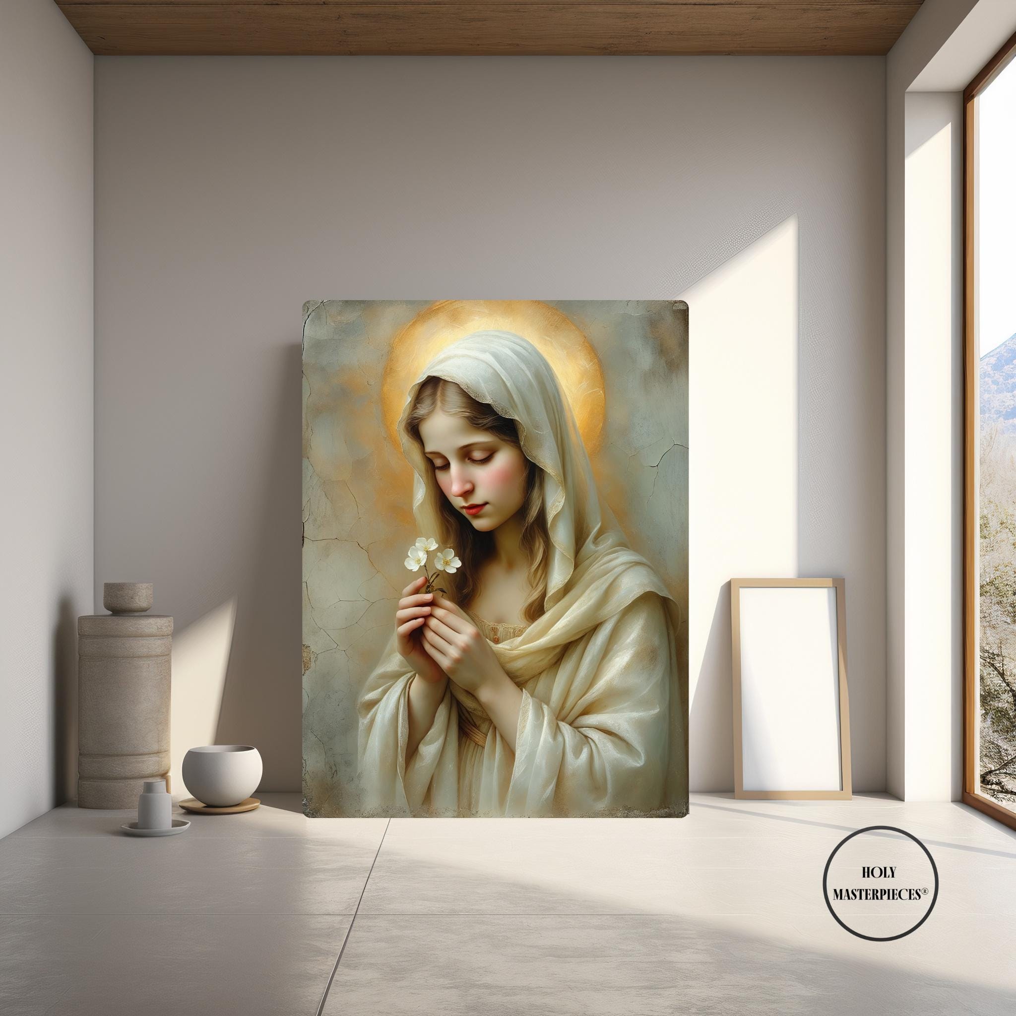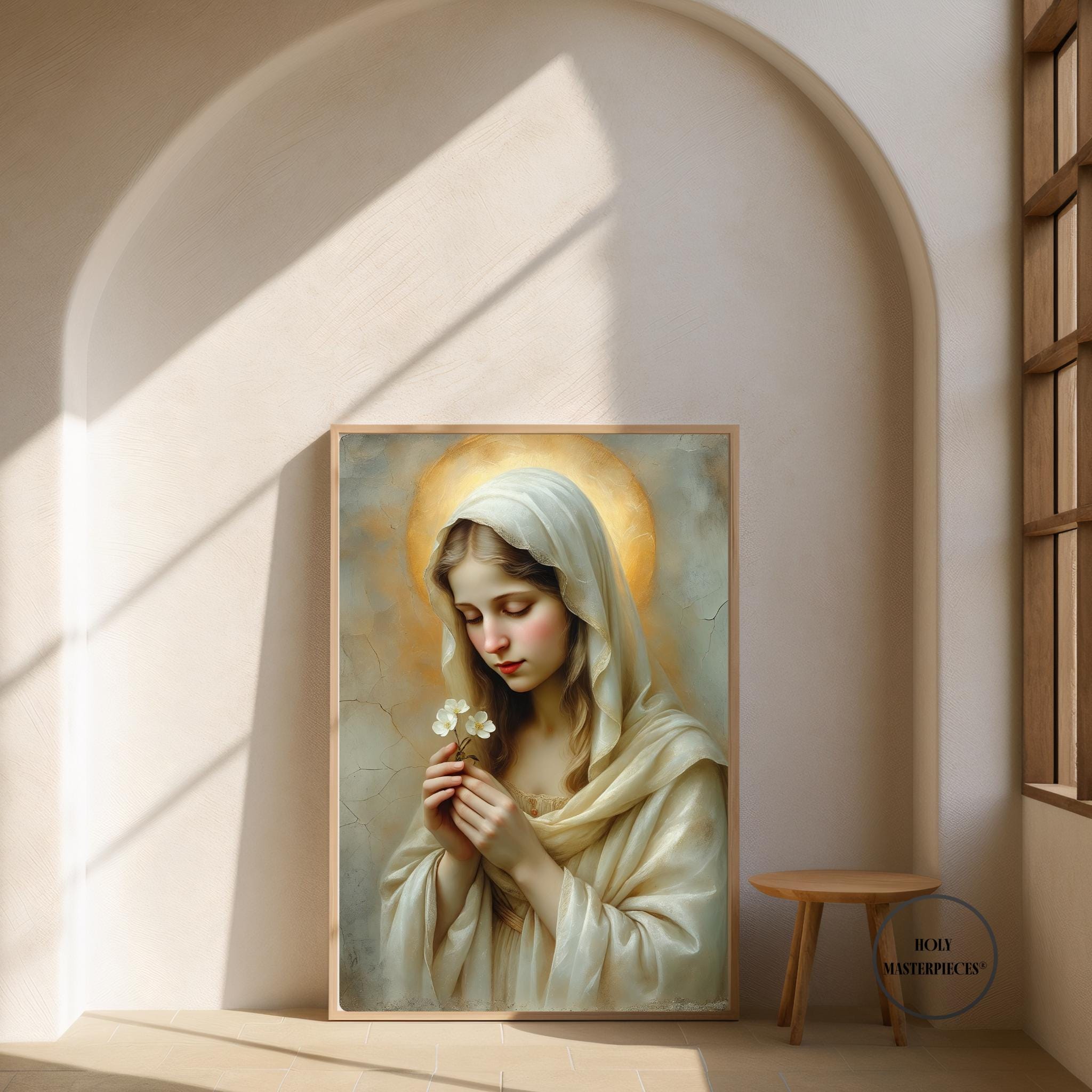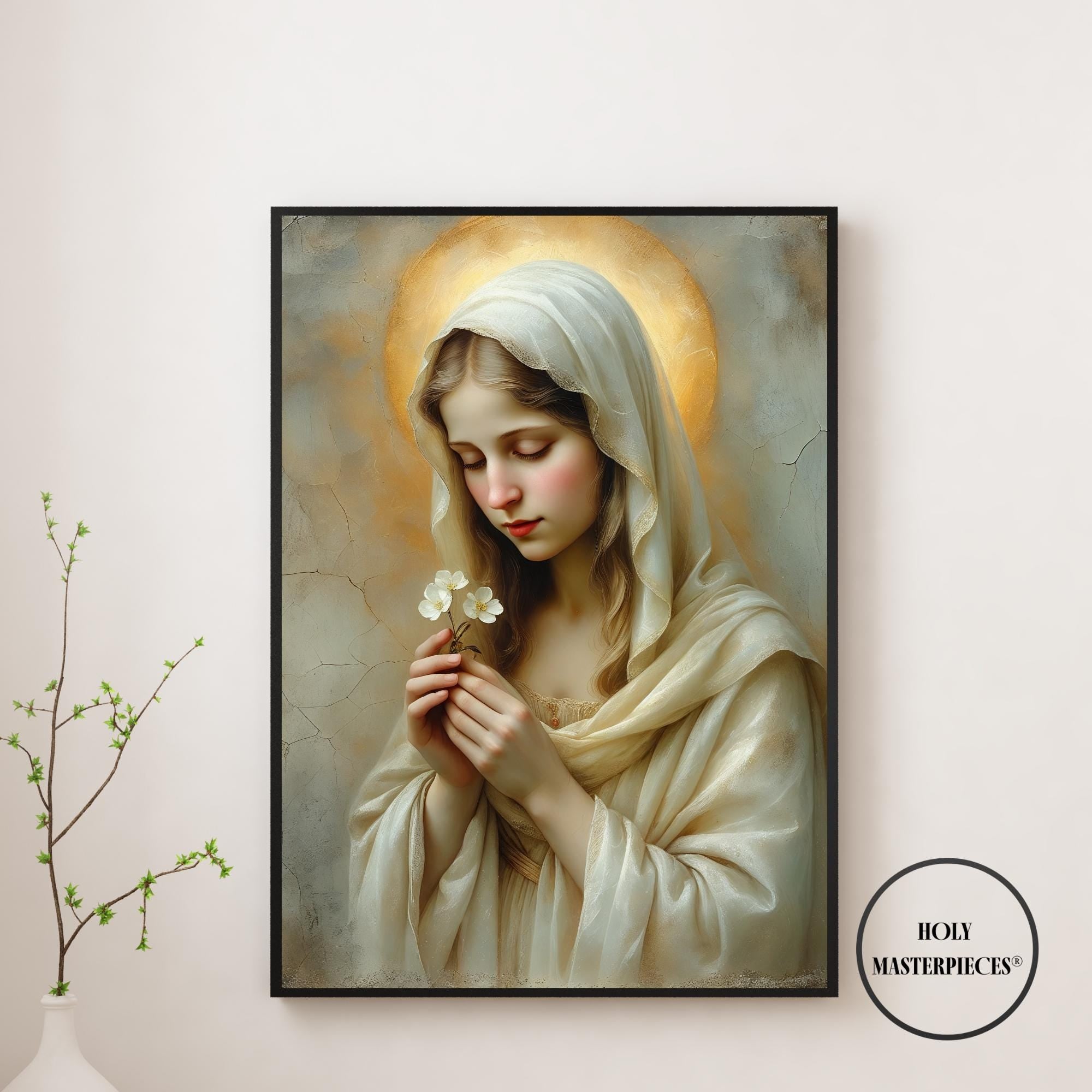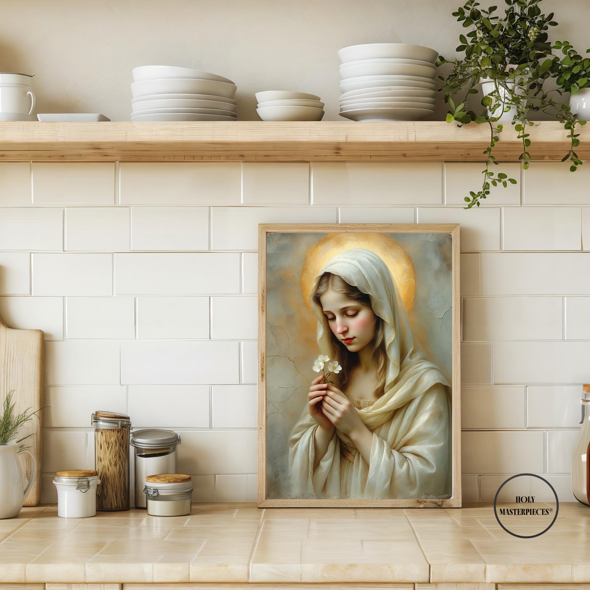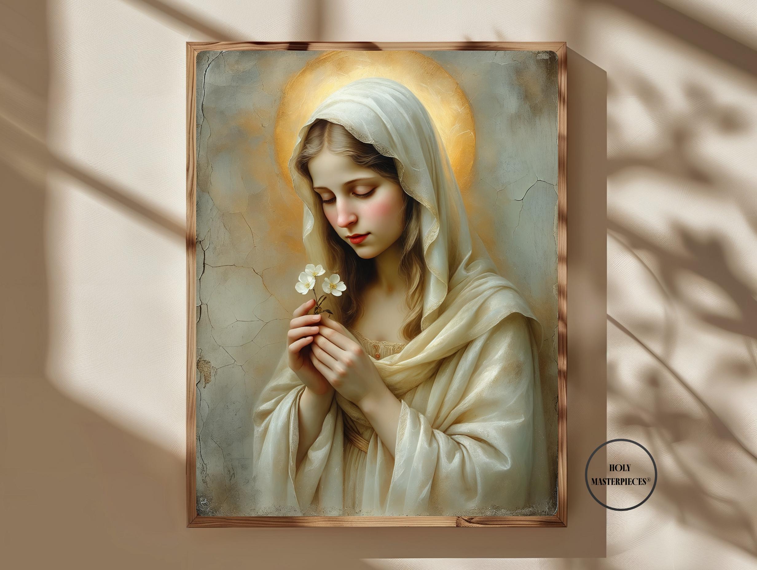 This sacred Marian artwork portrays the Blessed Virgin in quiet tenderness, holding a delicate blossom that symbolizes purity, humility, and the gentle unfolding of God’s grace. Her eyes are softly lowered in prayerful stillness, inviting the viewer into a moment of calm devotion and interior peace.