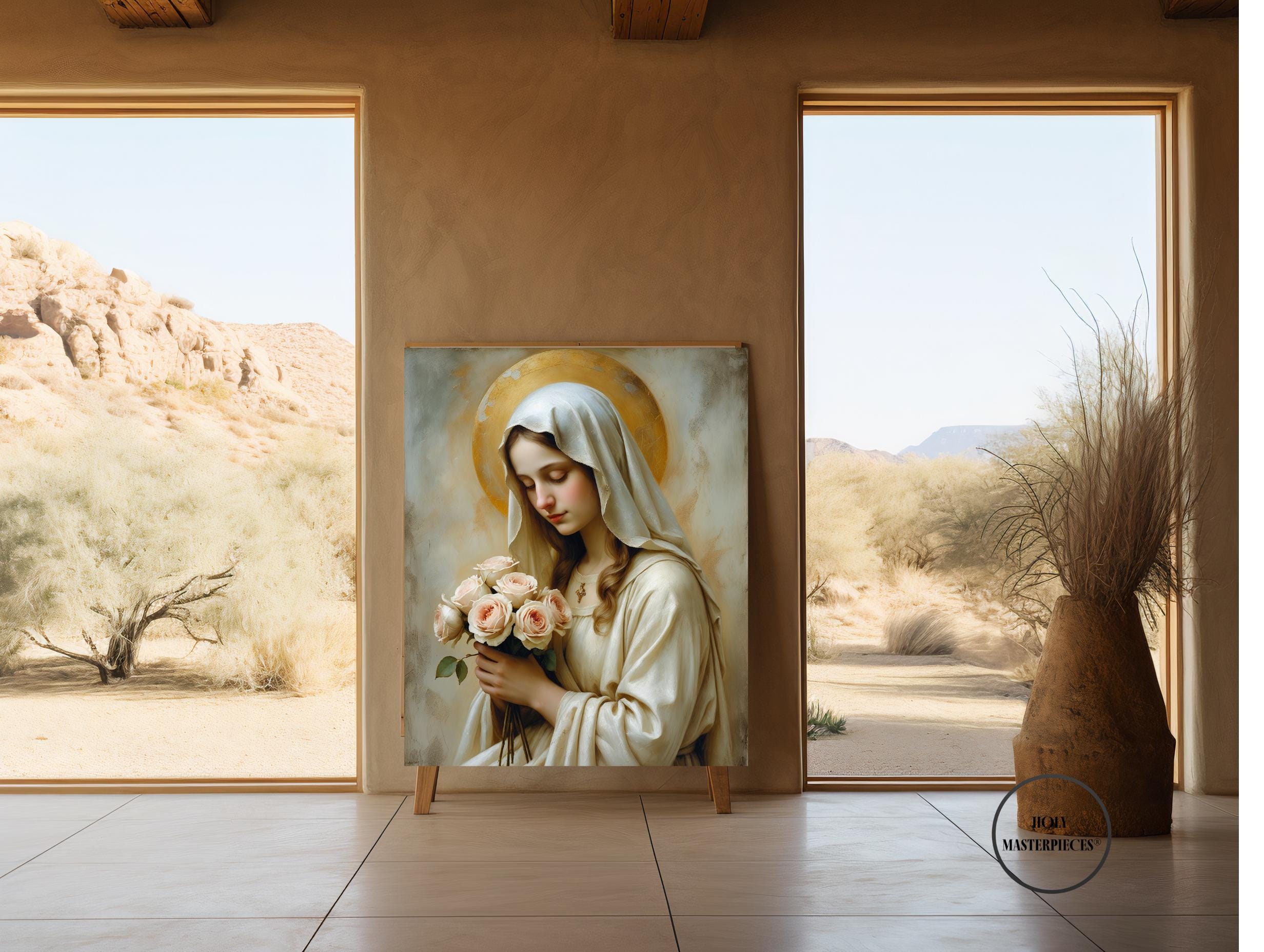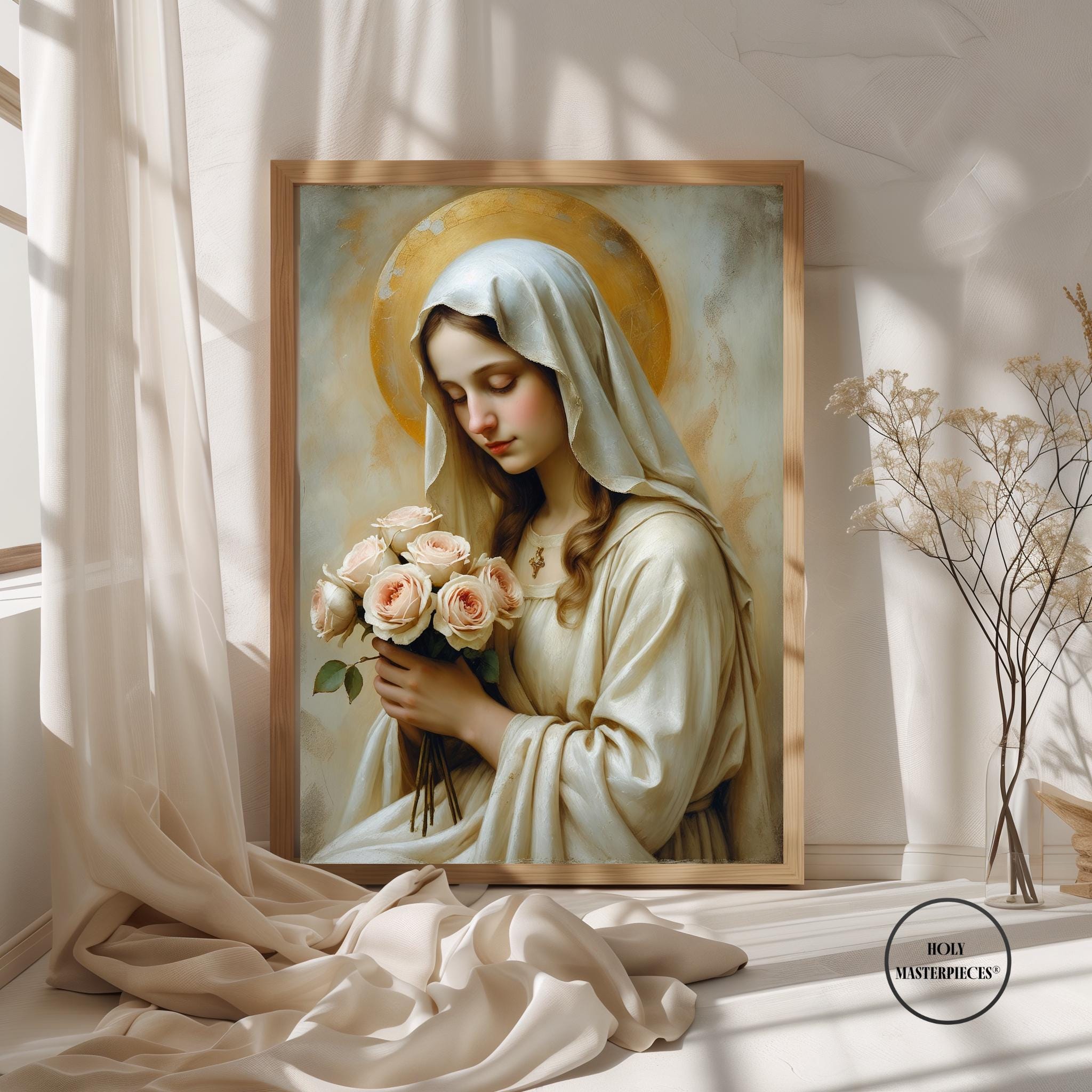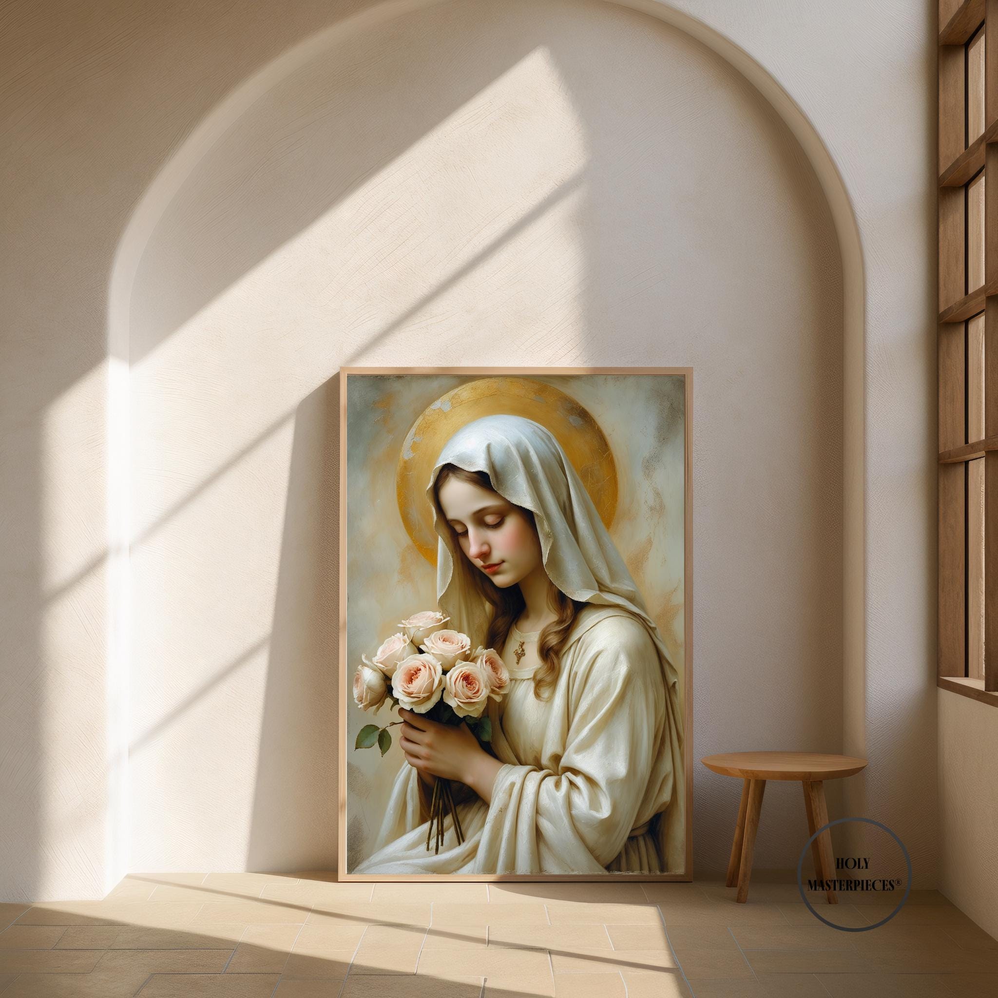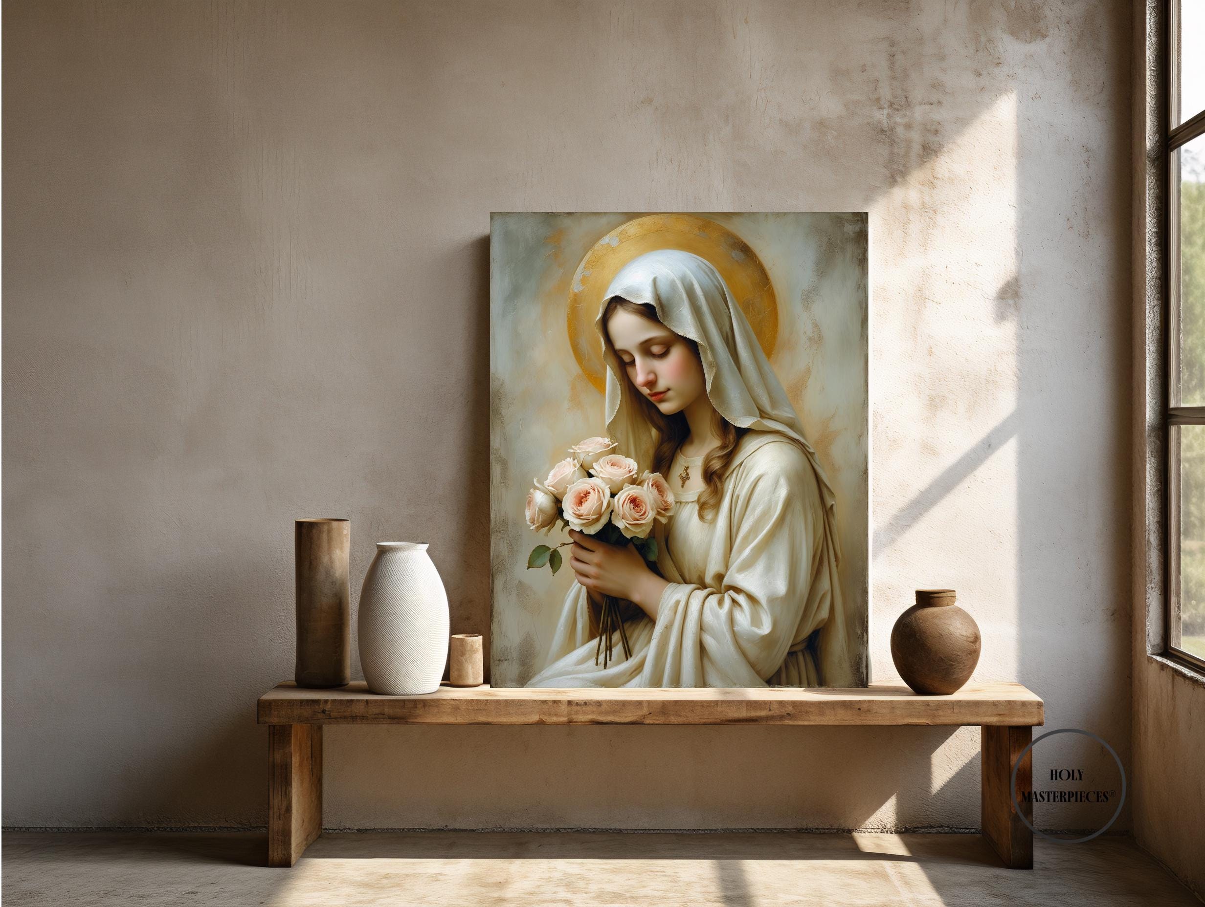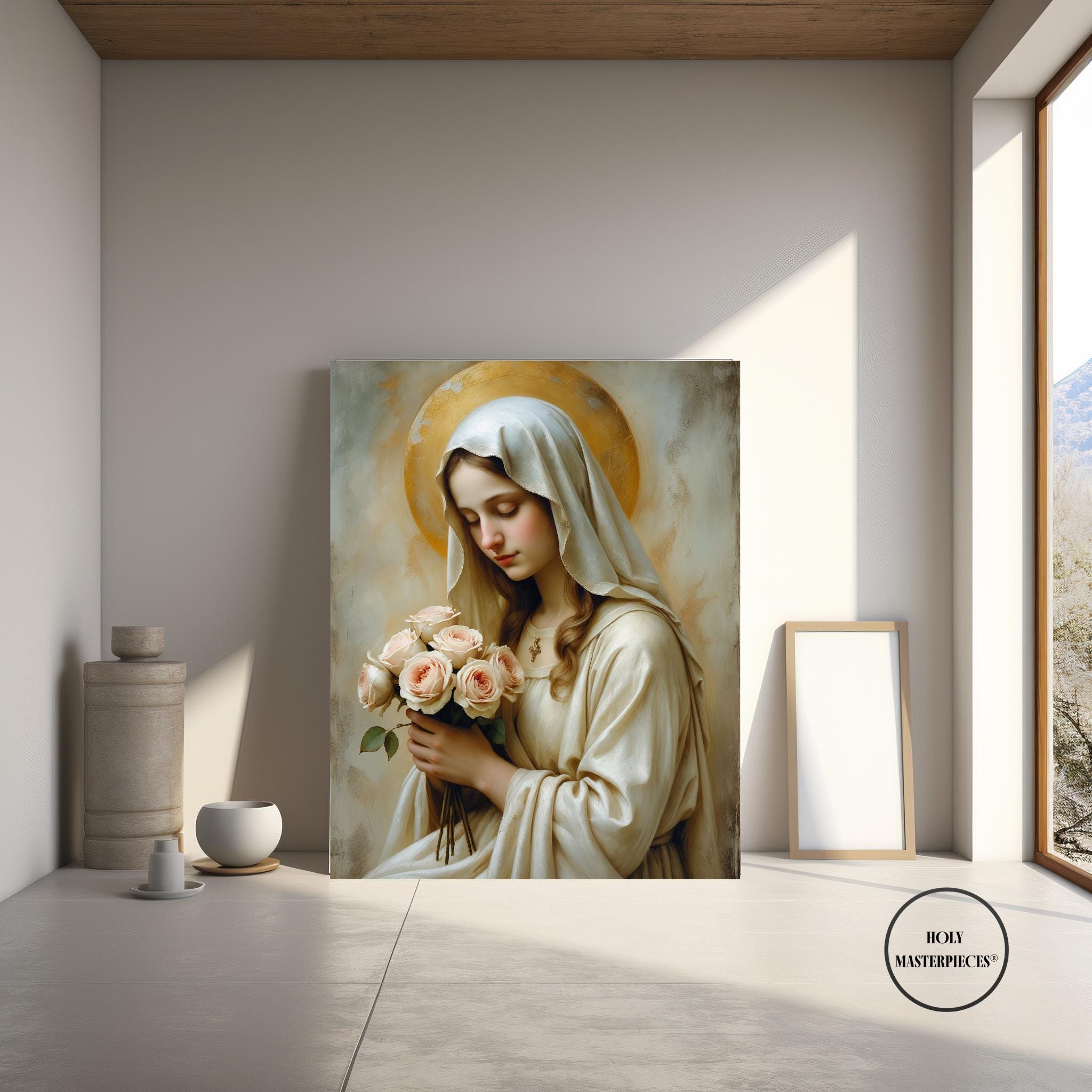 A peaceful Christian artwork for prayer spaces, Catholic homes, and Marian devotional decor. Part of the Holy Masterpieces® collection.