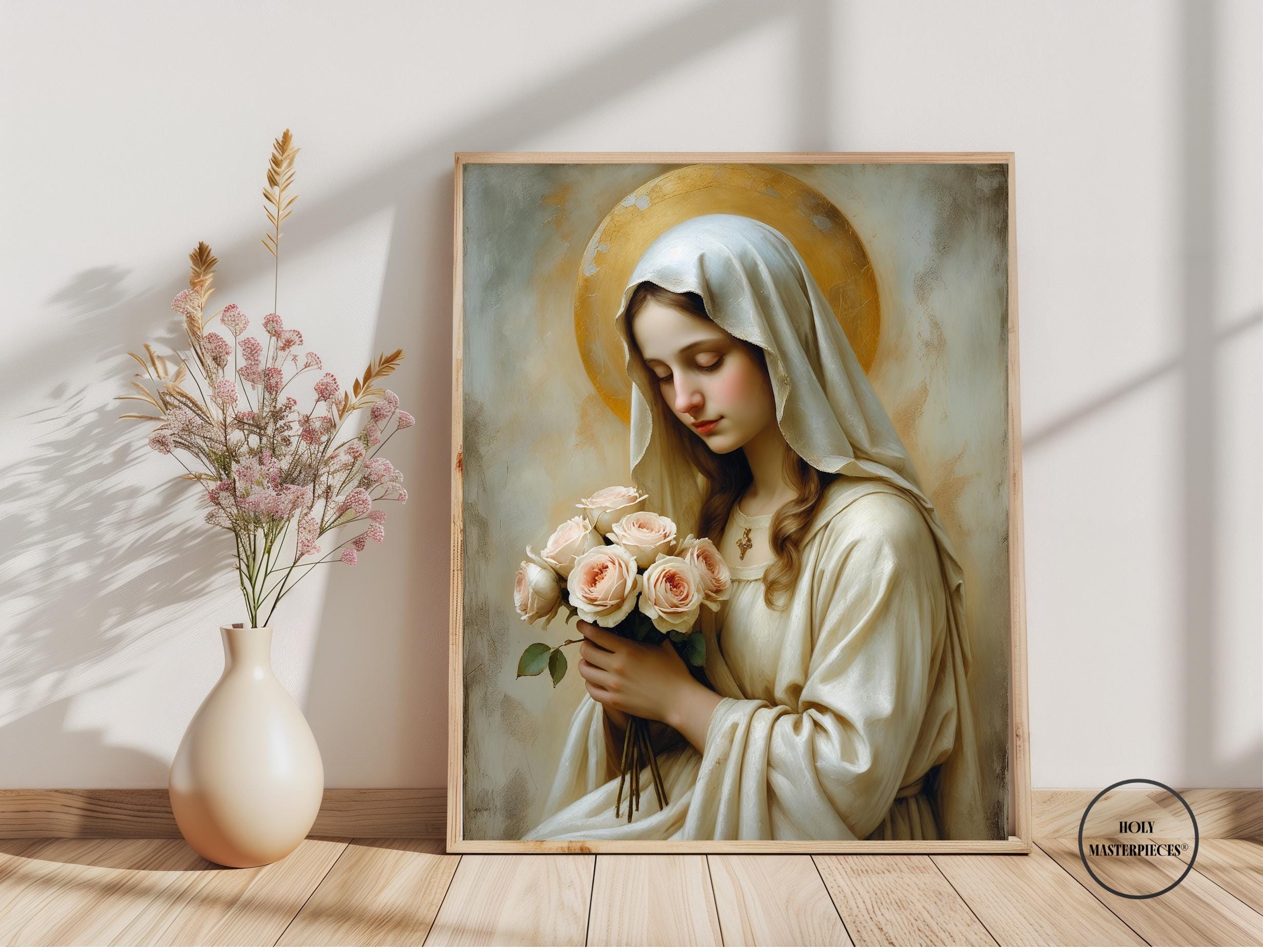 A serene and devotional depiction of the Madonna of the Roses, portraying the Virgin Mary in quiet contemplation as she gently holds a bouquet of roses — a timeless symbol of purity, love, and Marian grace. Her calm, prayerful expression invites stillness and reflection, drawing the viewer into a moment of sacred peace.