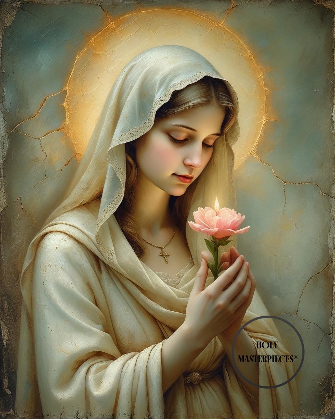 Painted in the tradition of a classical 17th-century Western sacred oil painting, the composition features a muted palette, soft painterly texture, and gentle chiaroscuro. Mary is veiled in warm ivory tones, her halo glowing softly against an aged cracked-plaster background. The delicate bloom reflects spiritual renewal and Marian humility, creating a timeless image suited for prayer and devotion.