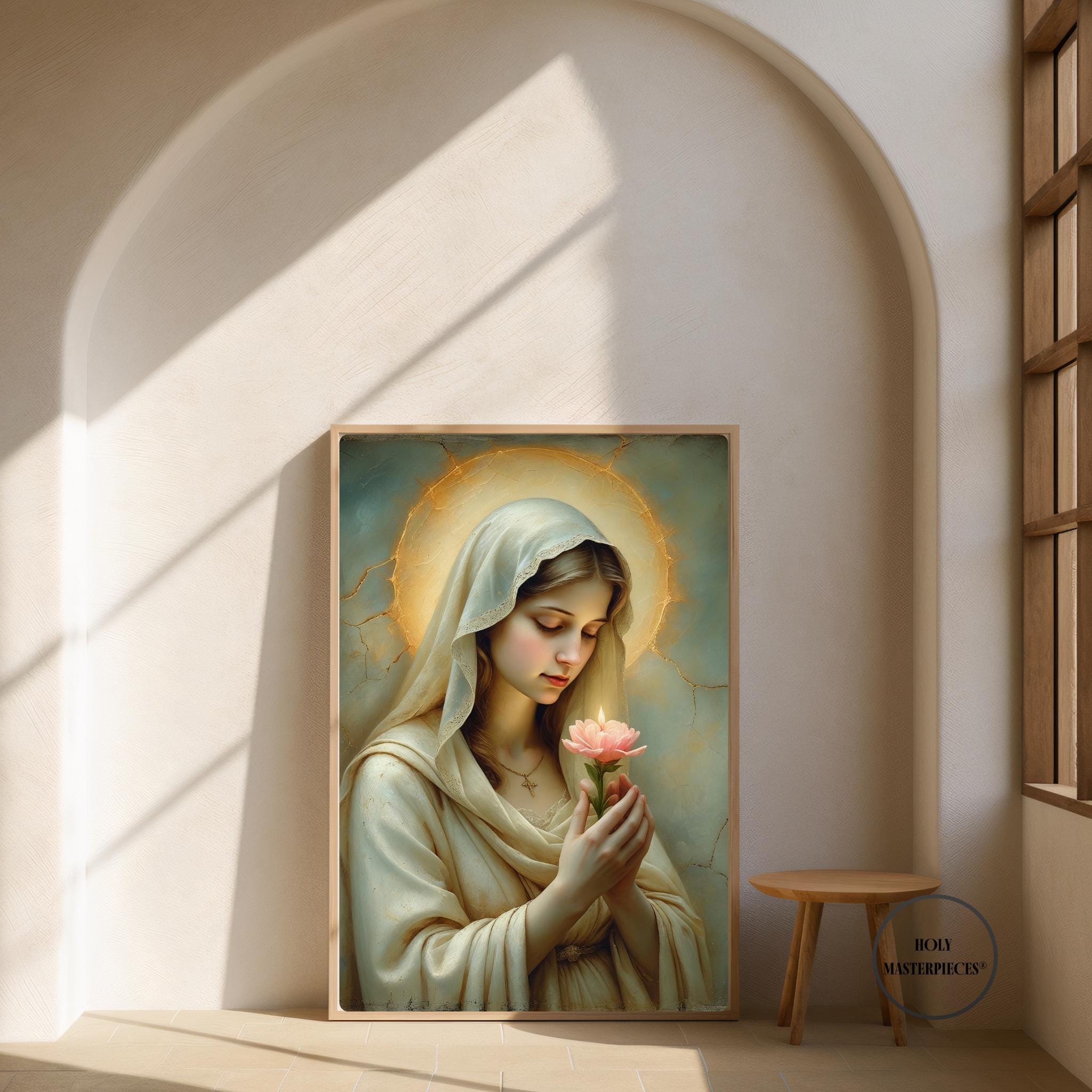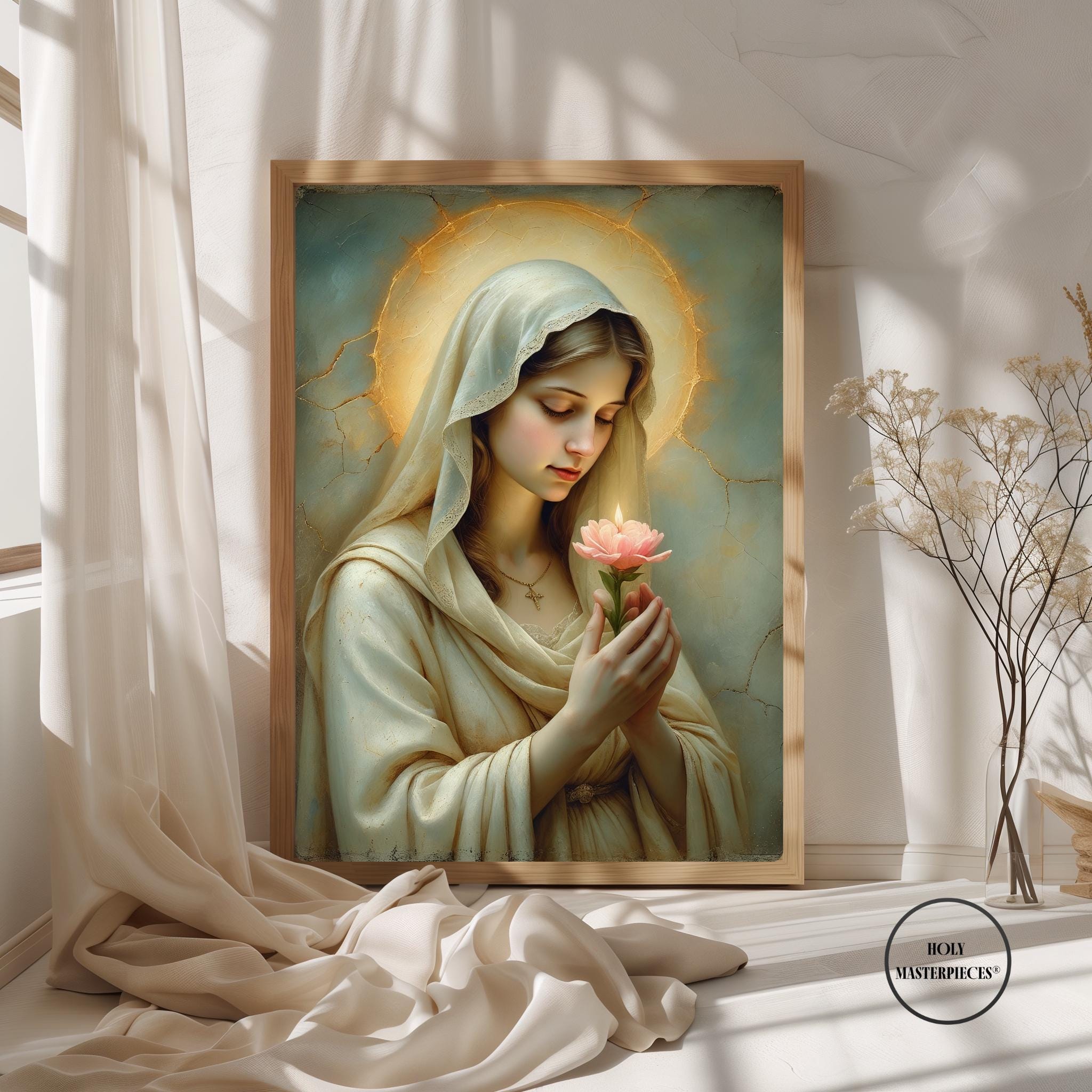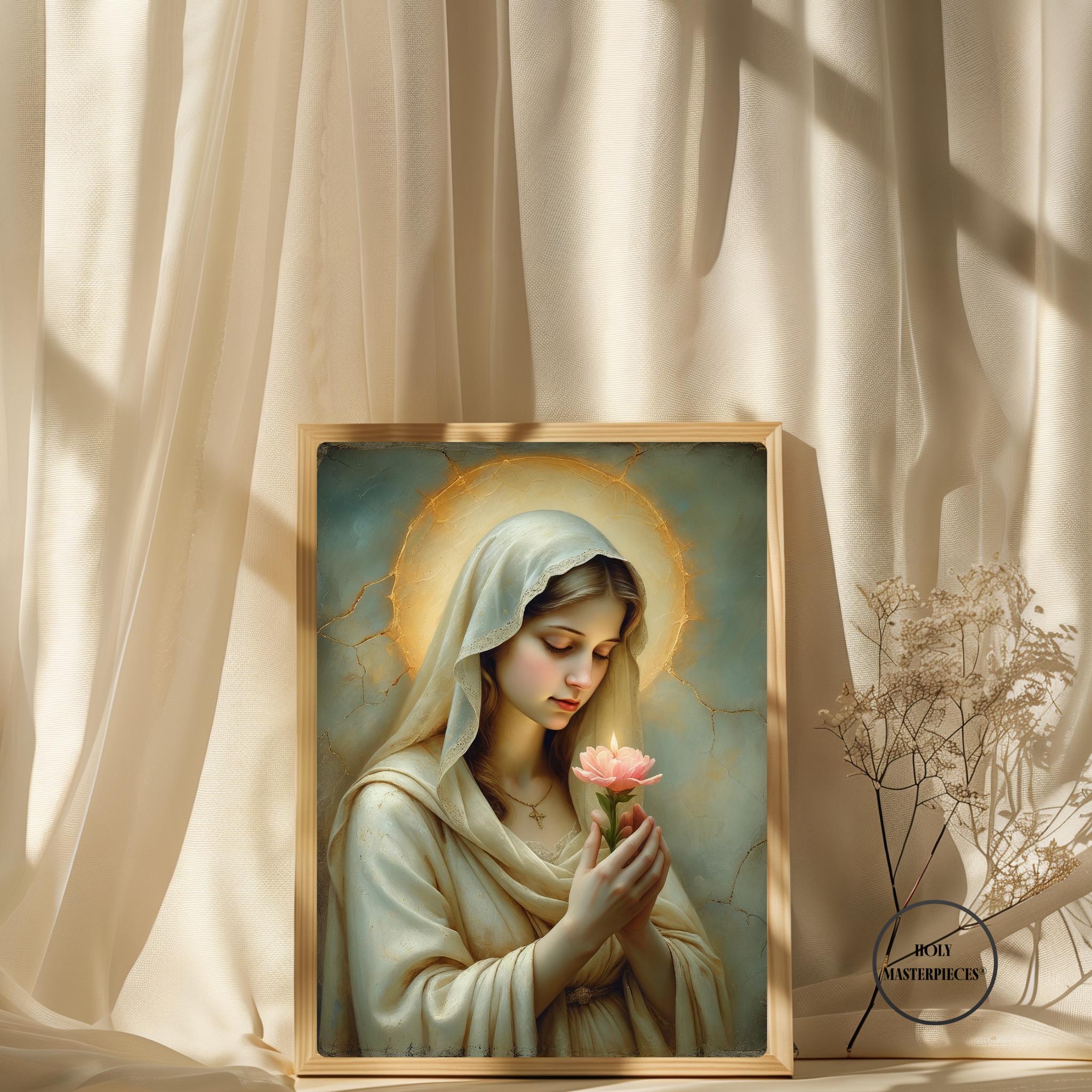 This devotional artwork presents the Blessed Virgin in quiet reverence, gently holding a blooming flower that symbolizes purity, grace, and the unfolding of God’s divine will. Her eyes are softly lowered in prayerful contemplation, inviting the viewer into a moment of interior stillness and sacred trust.