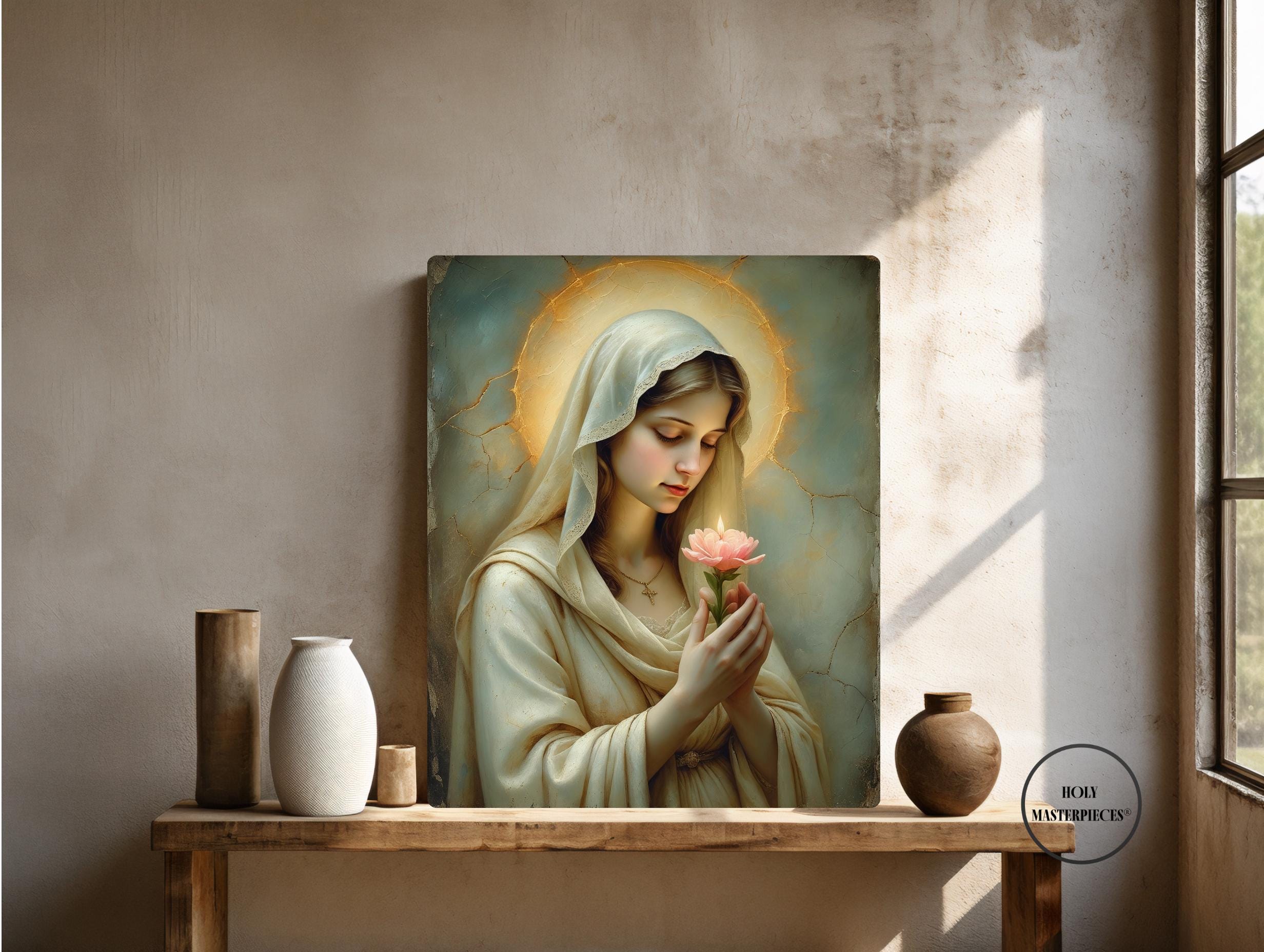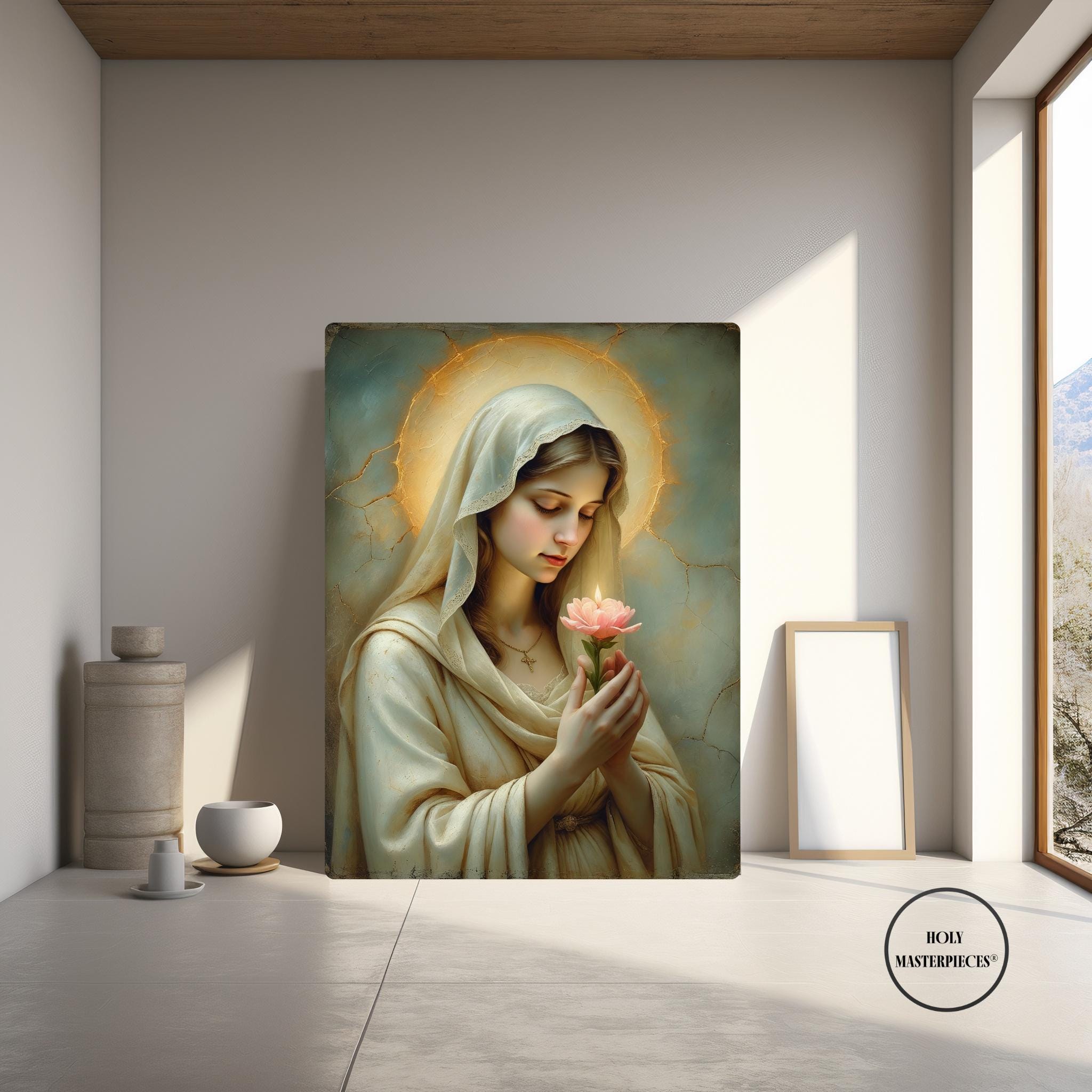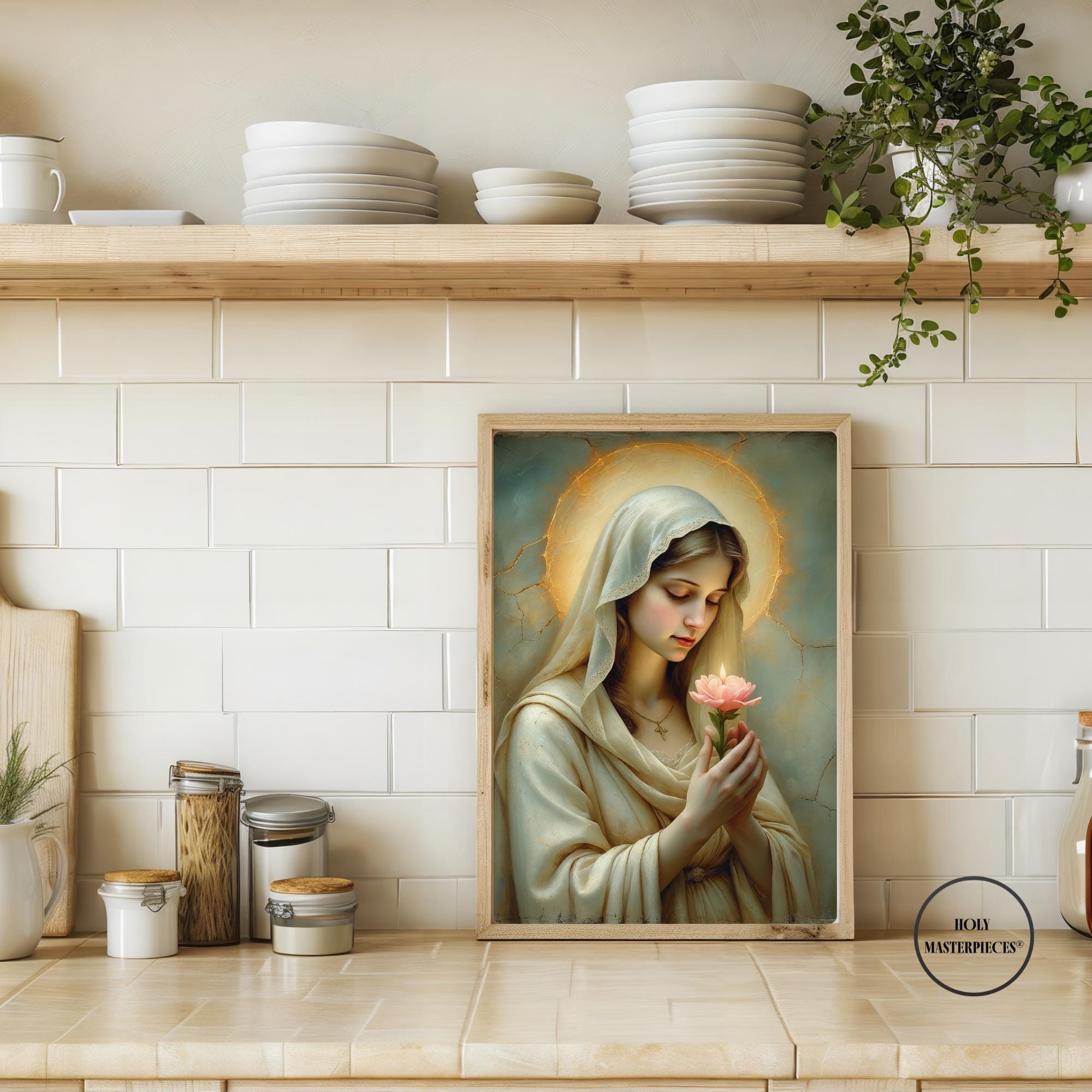 This devotional artwork presents the Blessed Virgin in quiet reverence, gently holding a blooming flower that symbolizes purity, grace, and the unfolding of God’s divine will. Her eyes are softly lowered in prayerful contemplation, inviting the viewer into a moment of interior stillness and sacred trust.