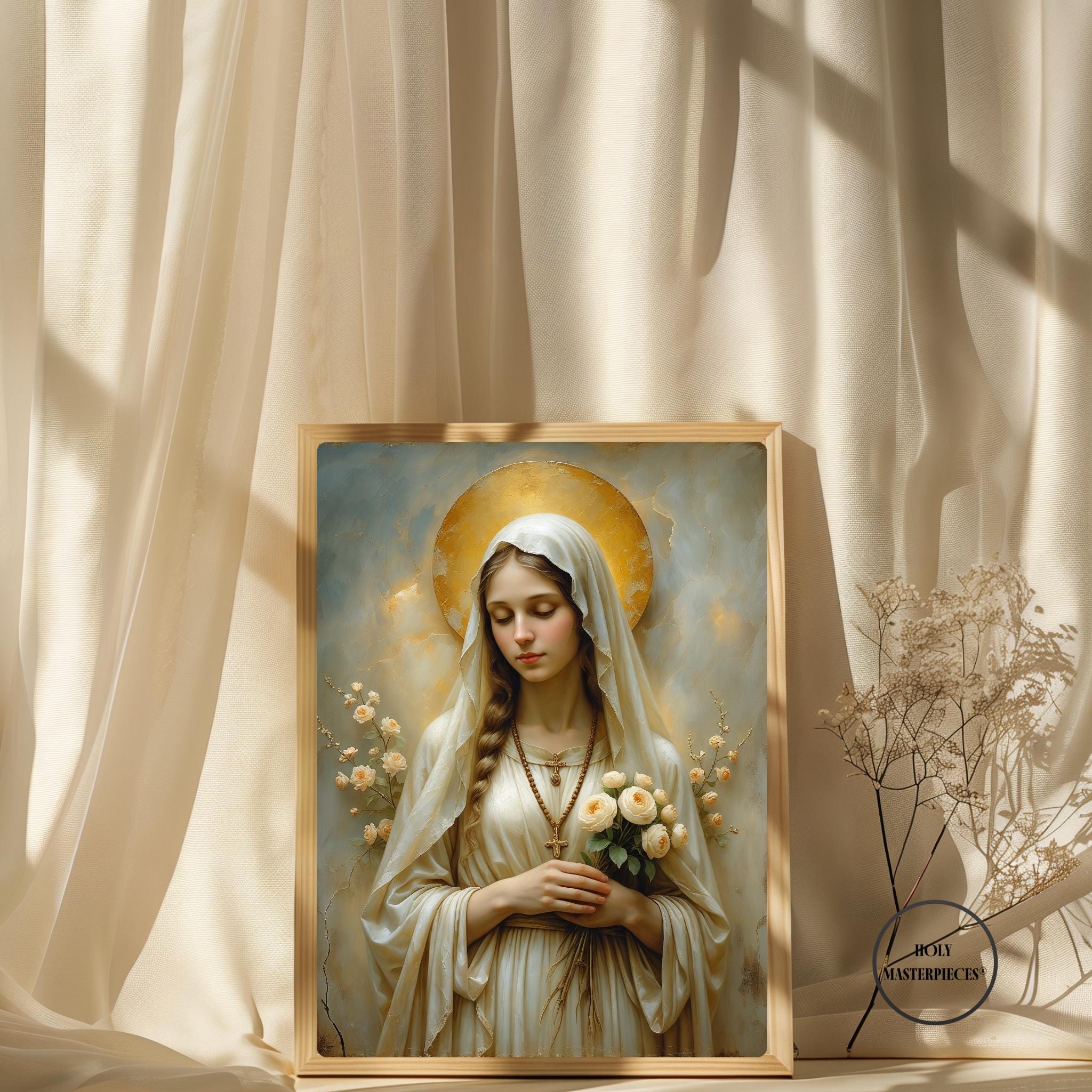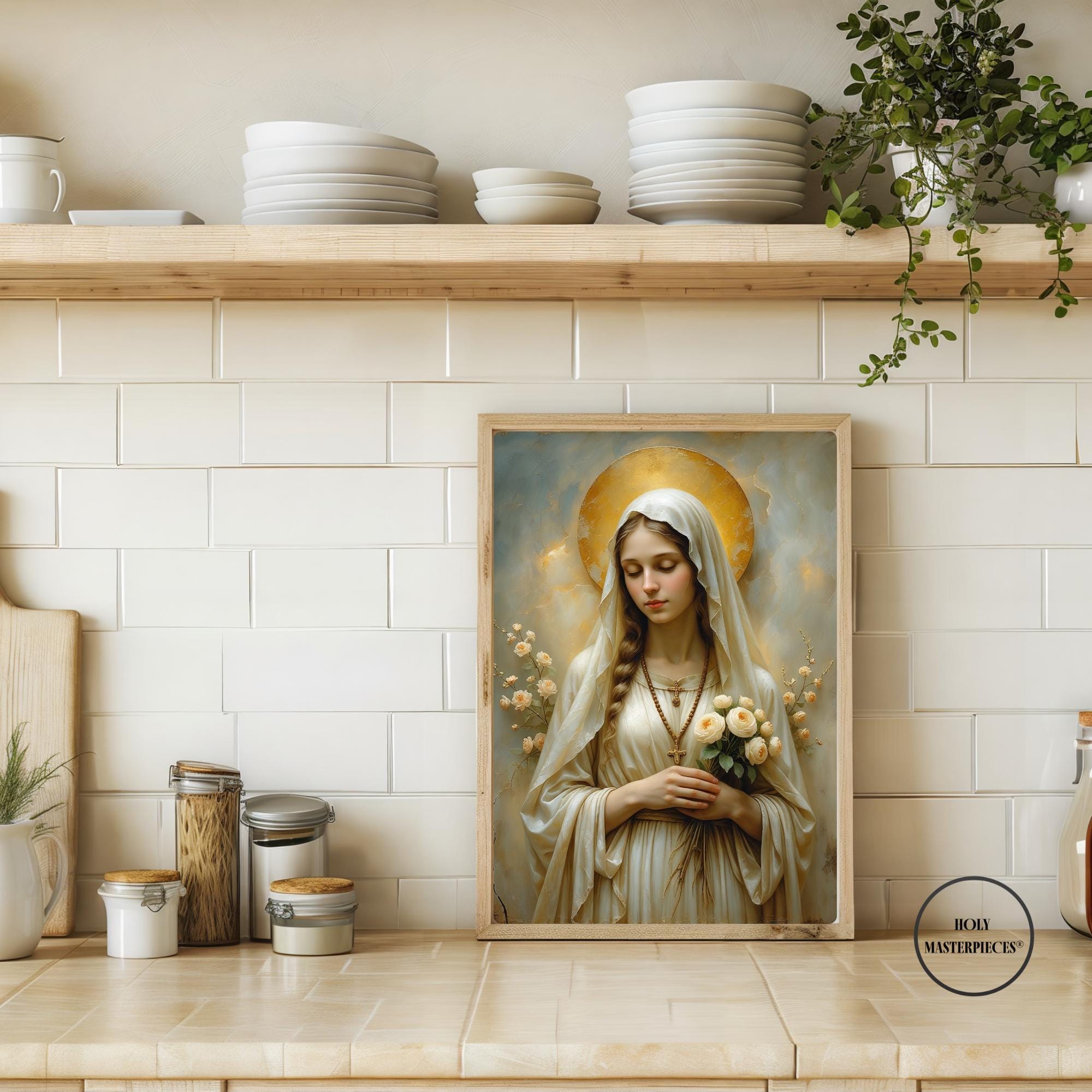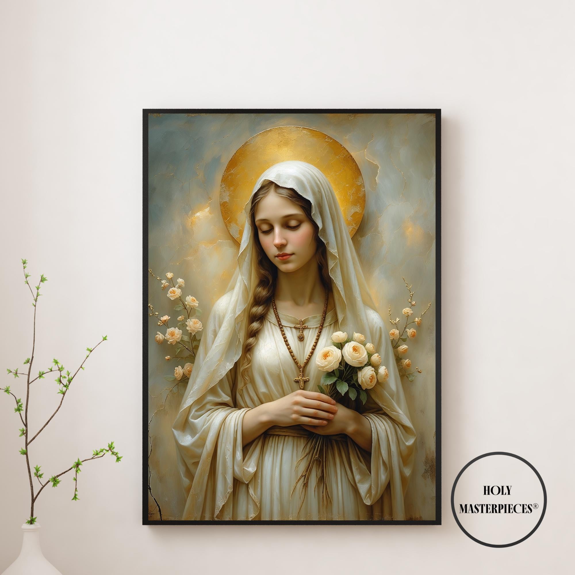This serene Marian artwork depicts the Blessed Virgin in gentle contemplation, holding a small bouquet of pale roses while a wooden rosary rests visibly around her neck. Her softly lowered gaze and calm posture convey humility, interior prayer, and quiet trust in God. The flowers symbolize purity, grace, and Marian devotion, while the rosary represents steadfast faith and contemplative prayer.