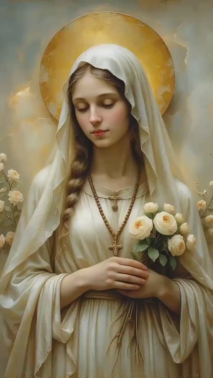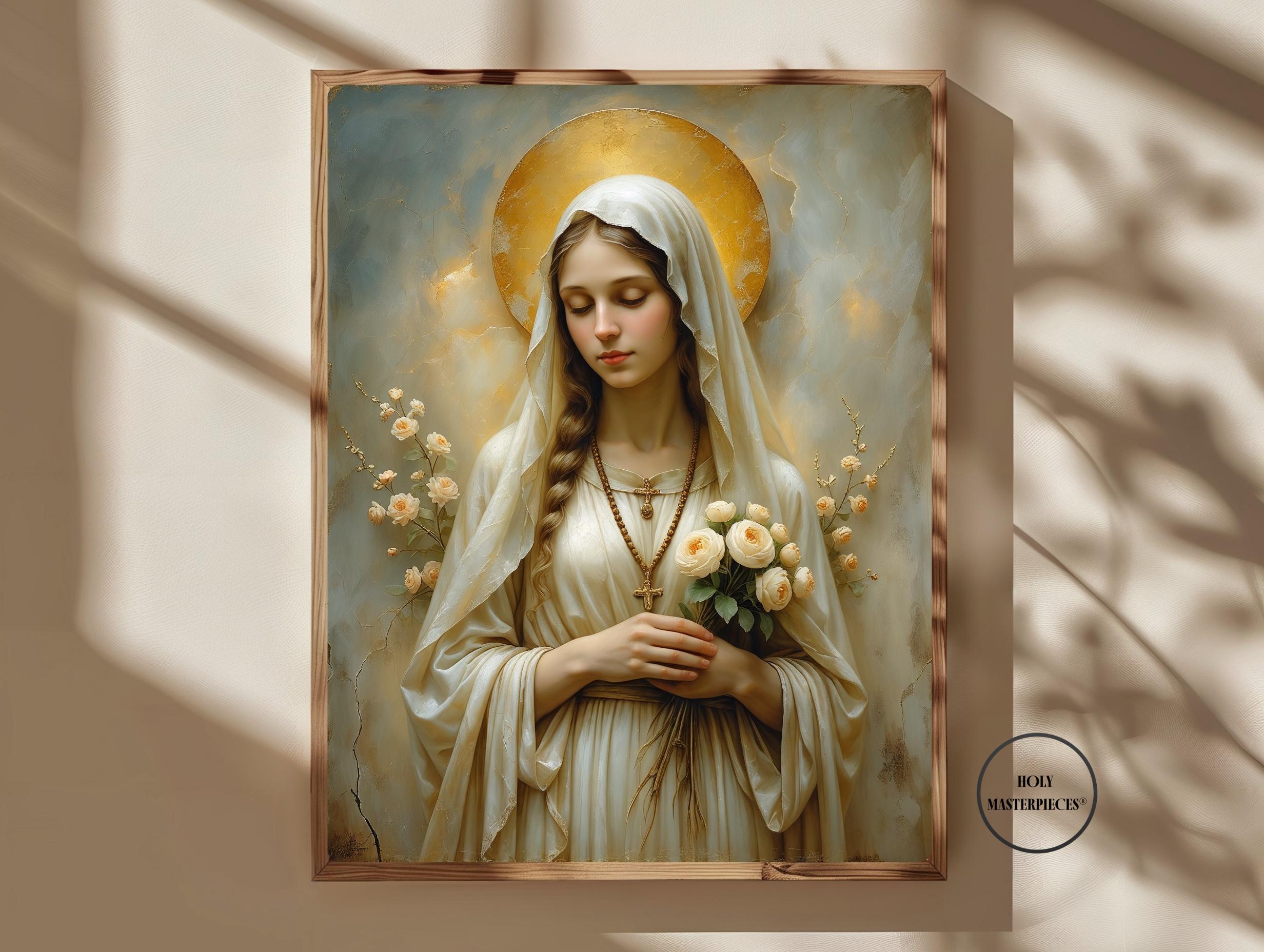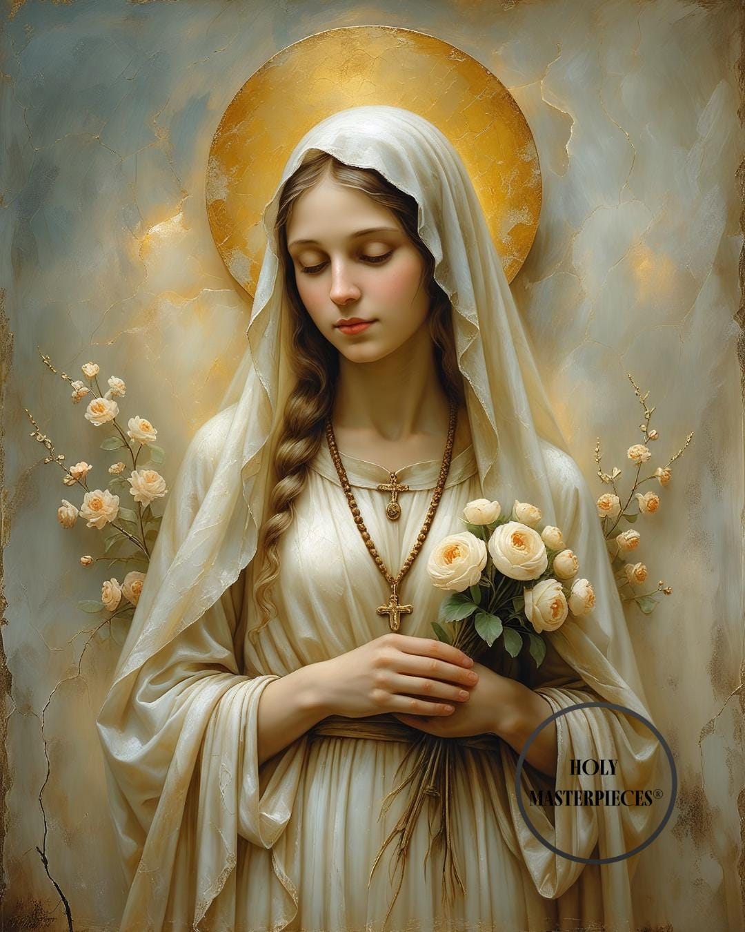 This serene Marian artwork depicts the Blessed Virgin in gentle contemplation, holding a small bouquet of pale roses while a wooden rosary rests visibly around her neck. Her softly lowered gaze and calm posture convey humility, interior prayer, and quiet trust in God. The flowers symbolize purity, grace, and Marian devotion, while the rosary represents steadfast faith and contemplative prayer.