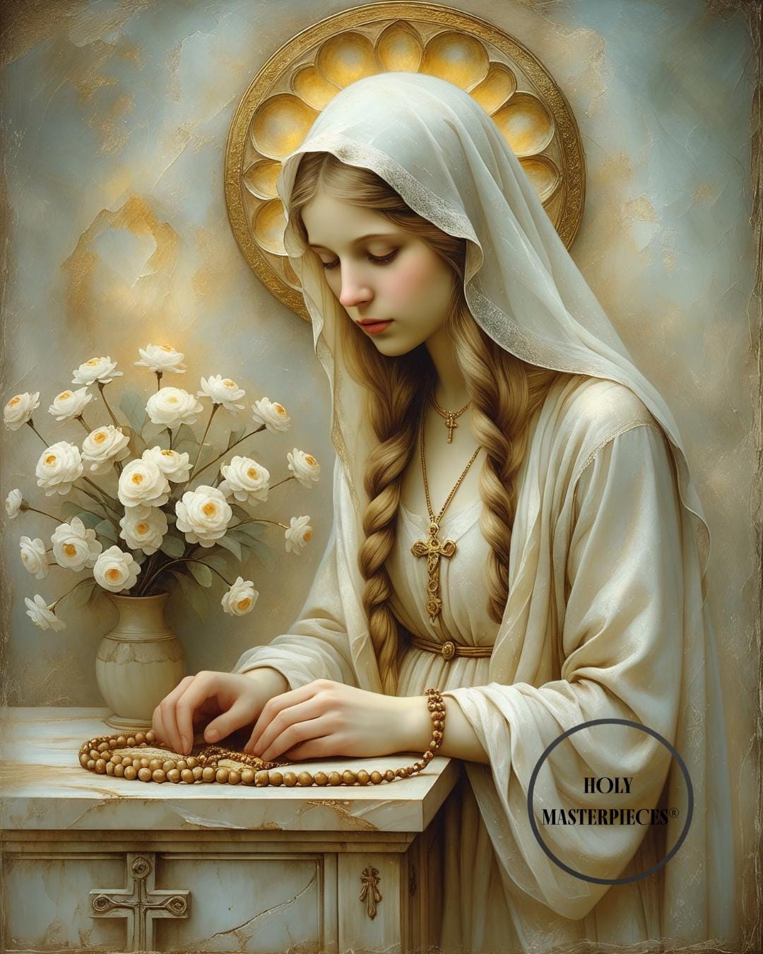 Mary is dressed in a flowing ivory robe with long sleeves, cinched lightly at the waist, and a pale veil draped over her head and shoulders. Her hair falls in two long braids over her chest. A warm golden halo encircles her head, softly blending into the textured background. Beside the altar sits a simple vessel holding white flowers. The setting is minimal and serene, with aged plaster textures and muted tones. Soft, warm light creates a gentle devotional glow, emphasizing the painterly surface and softened edges.