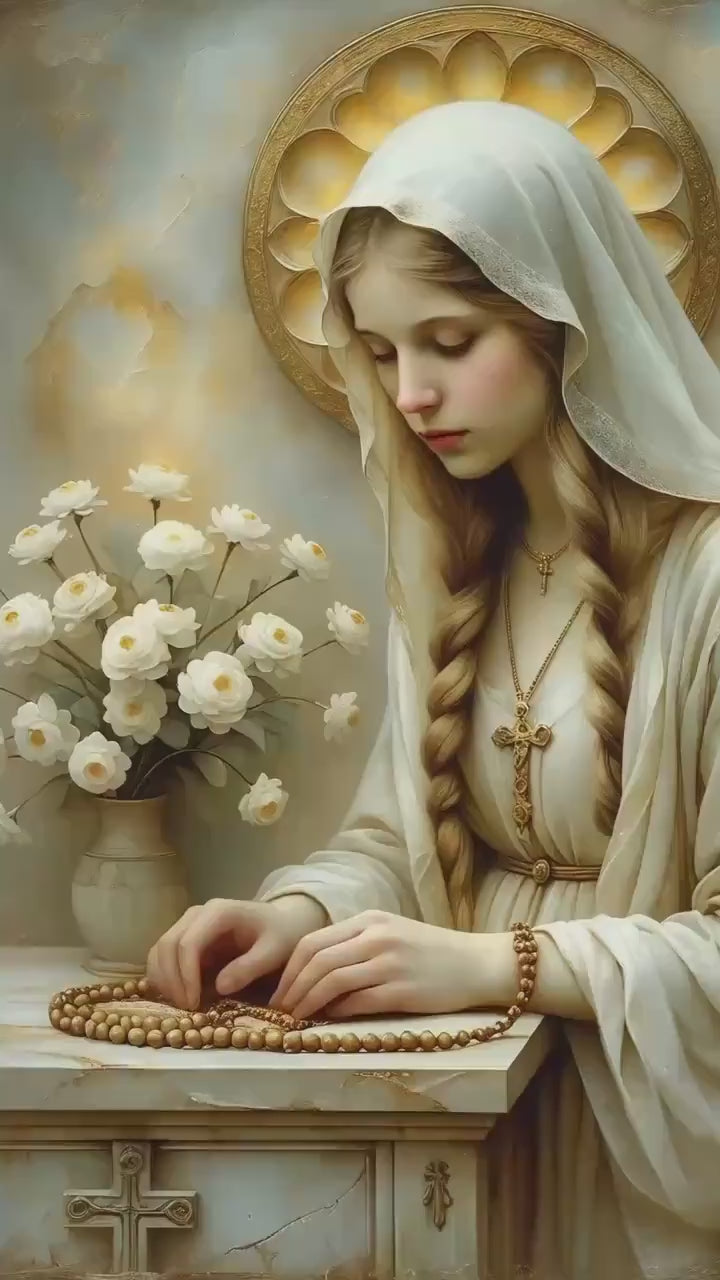 This artwork depicts the Virgin Mary seated quietly beside a small stone altar, her head gently inclined as she looks downward. Her hands rest softly upon an open rosary laid across the altar surface, the wooden beads arranged naturally beneath her fingers. A single crucifix hangs from the rosary, resting near the edge of the altar. Her posture is calm and composed, with no dramatic gesture or movement.