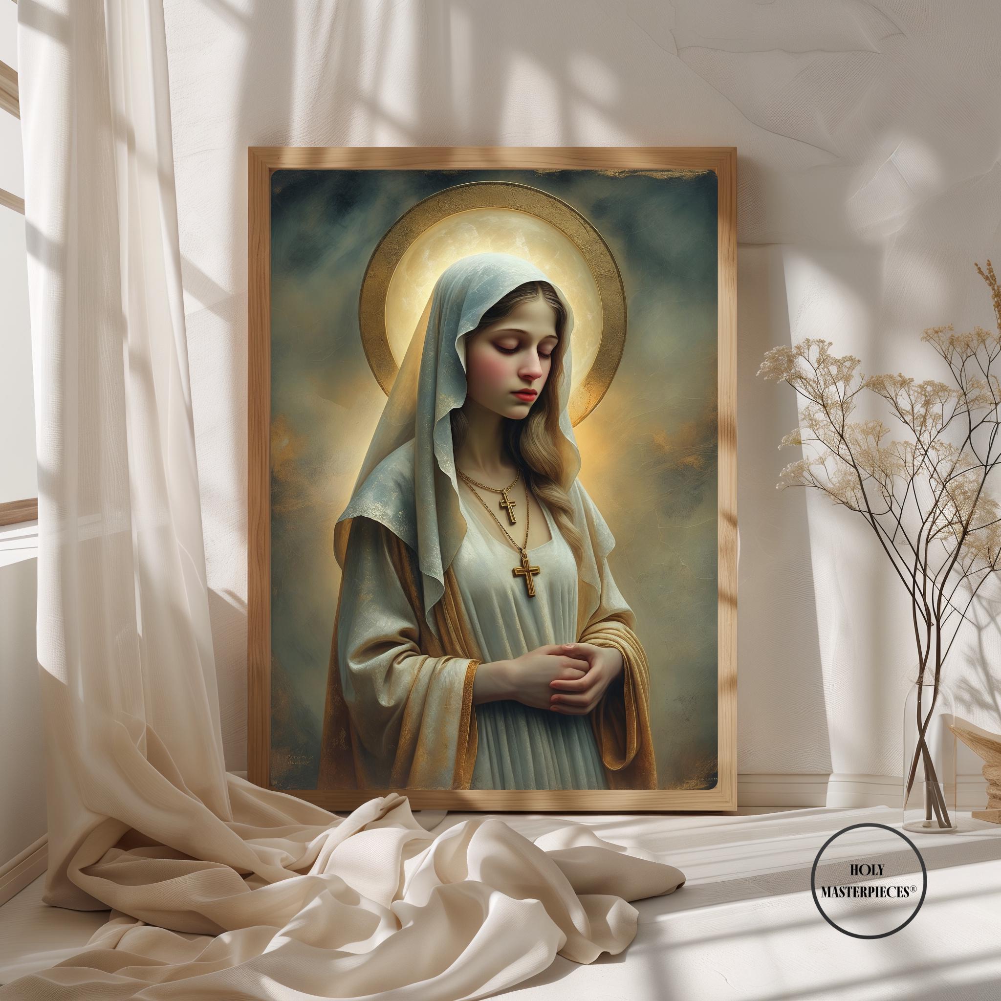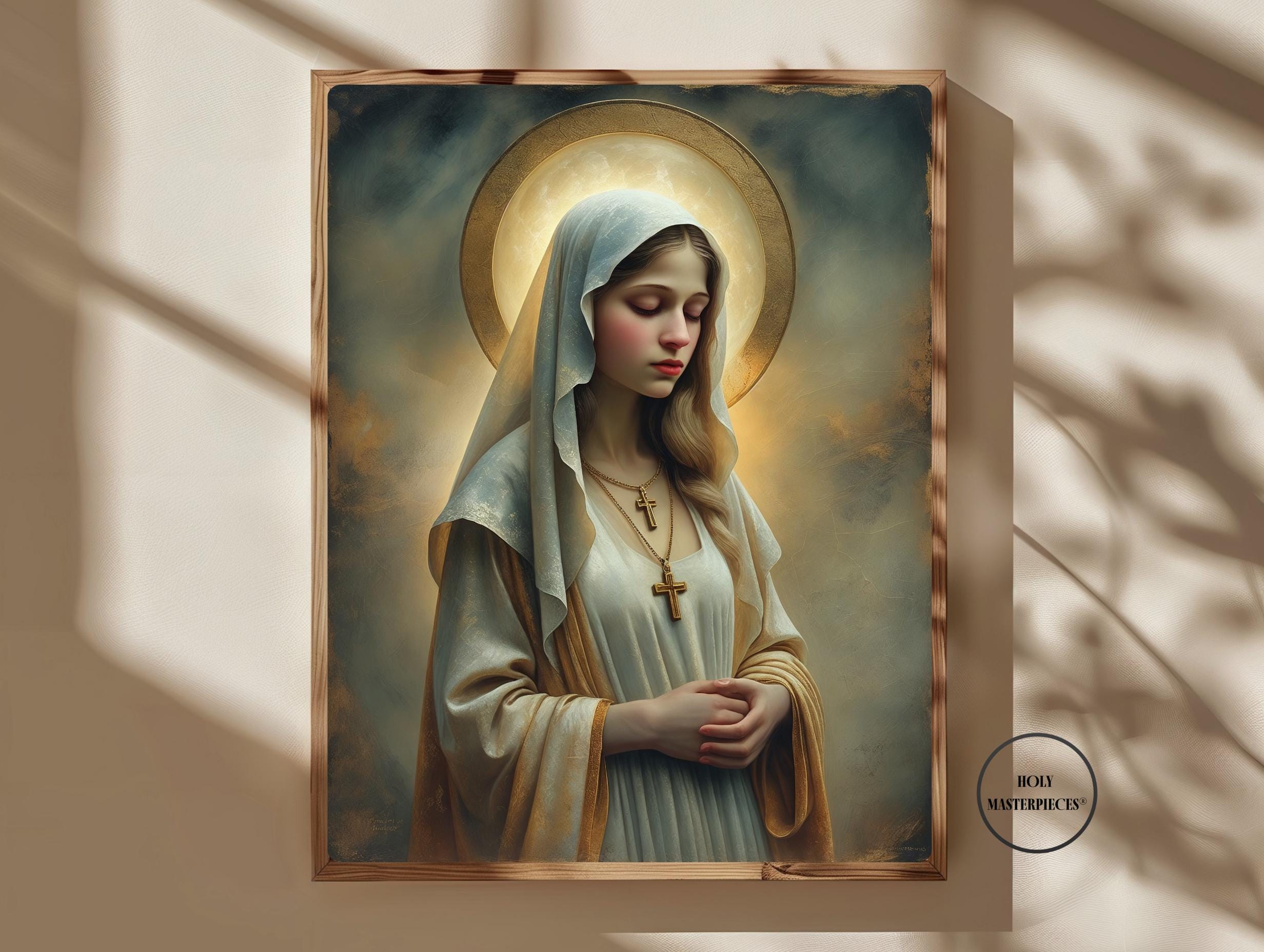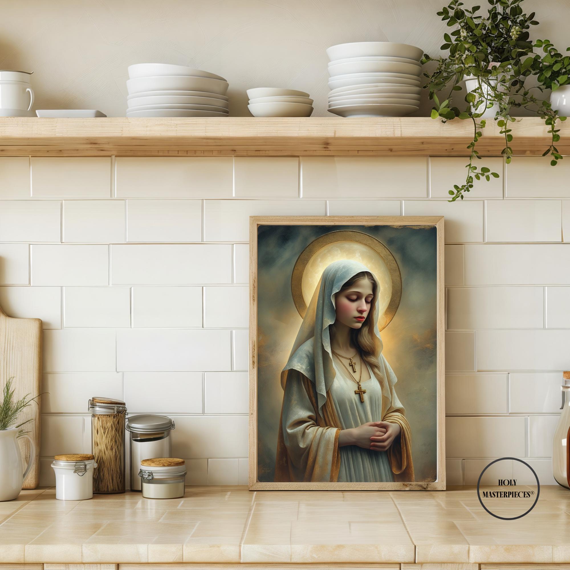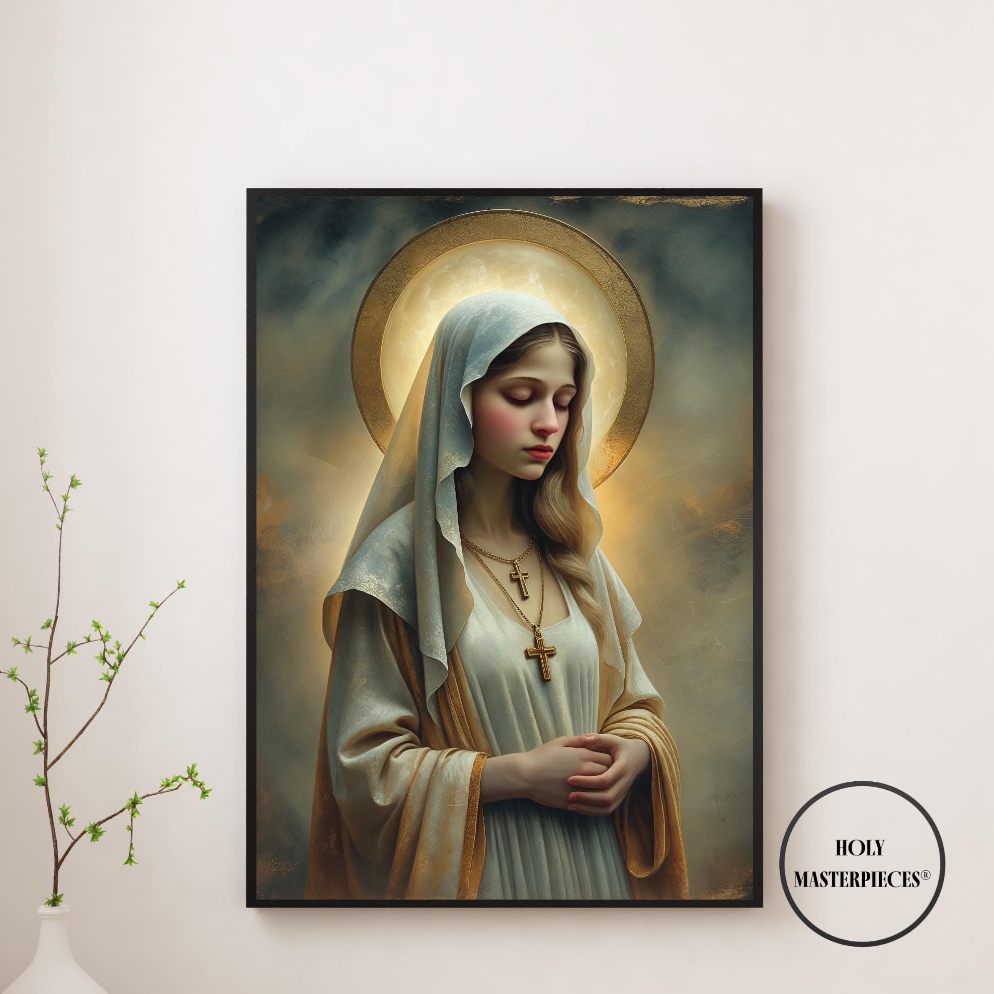 Rendered in a classical 17th-century sacred oil-painting style, the composition features a muted palette, gentle chiaroscuro, and a warm devotional glow. Mary’s pale blue-grey veil and softly draped golden mantle are painted with delicate restraint, while two simple crucifix necklaces rest quietly at her chest — symbols of faith, devotion, and trust. The overall atmosphere is reverent, timeless, and contemplative, inviting peace and stillness into any prayer space.