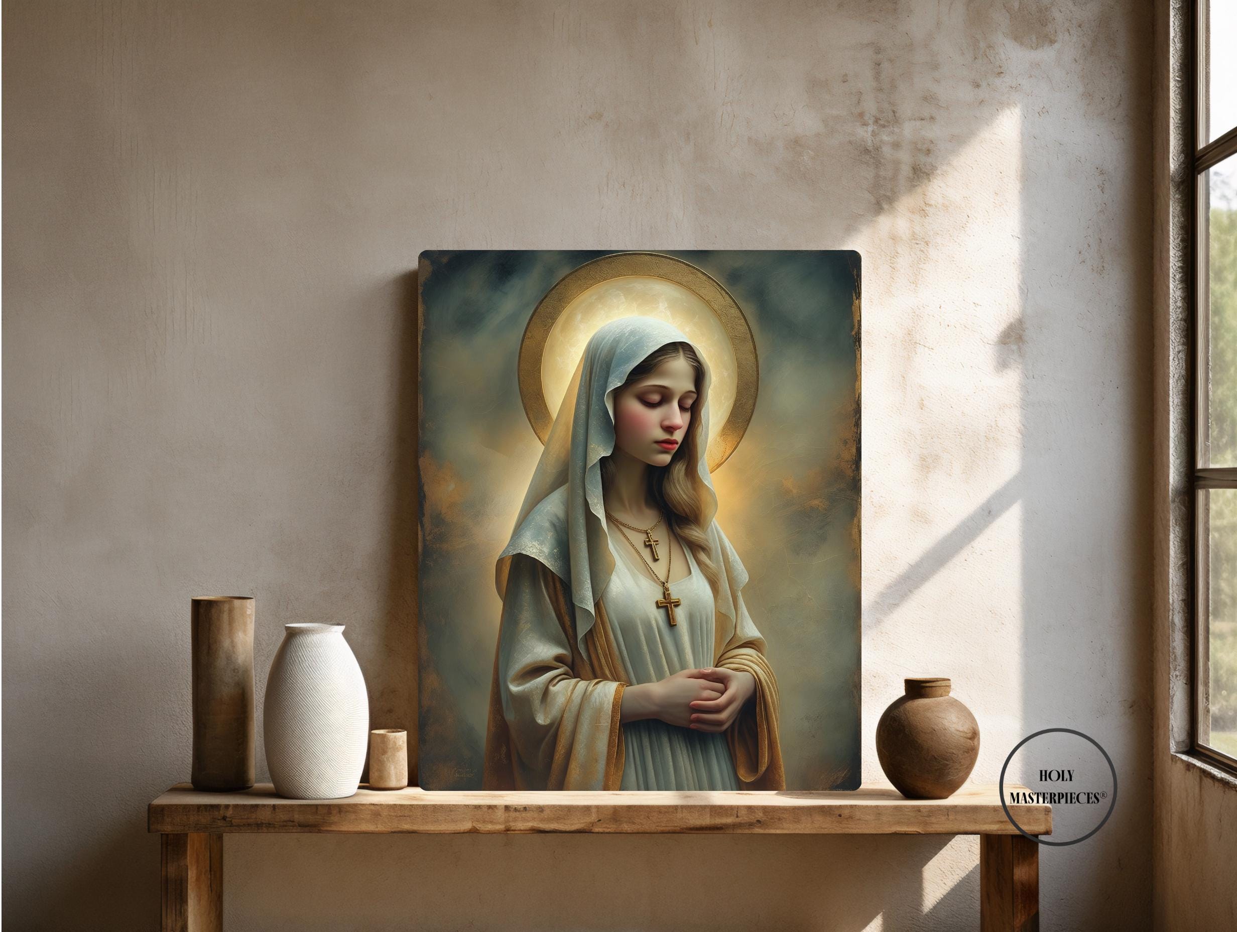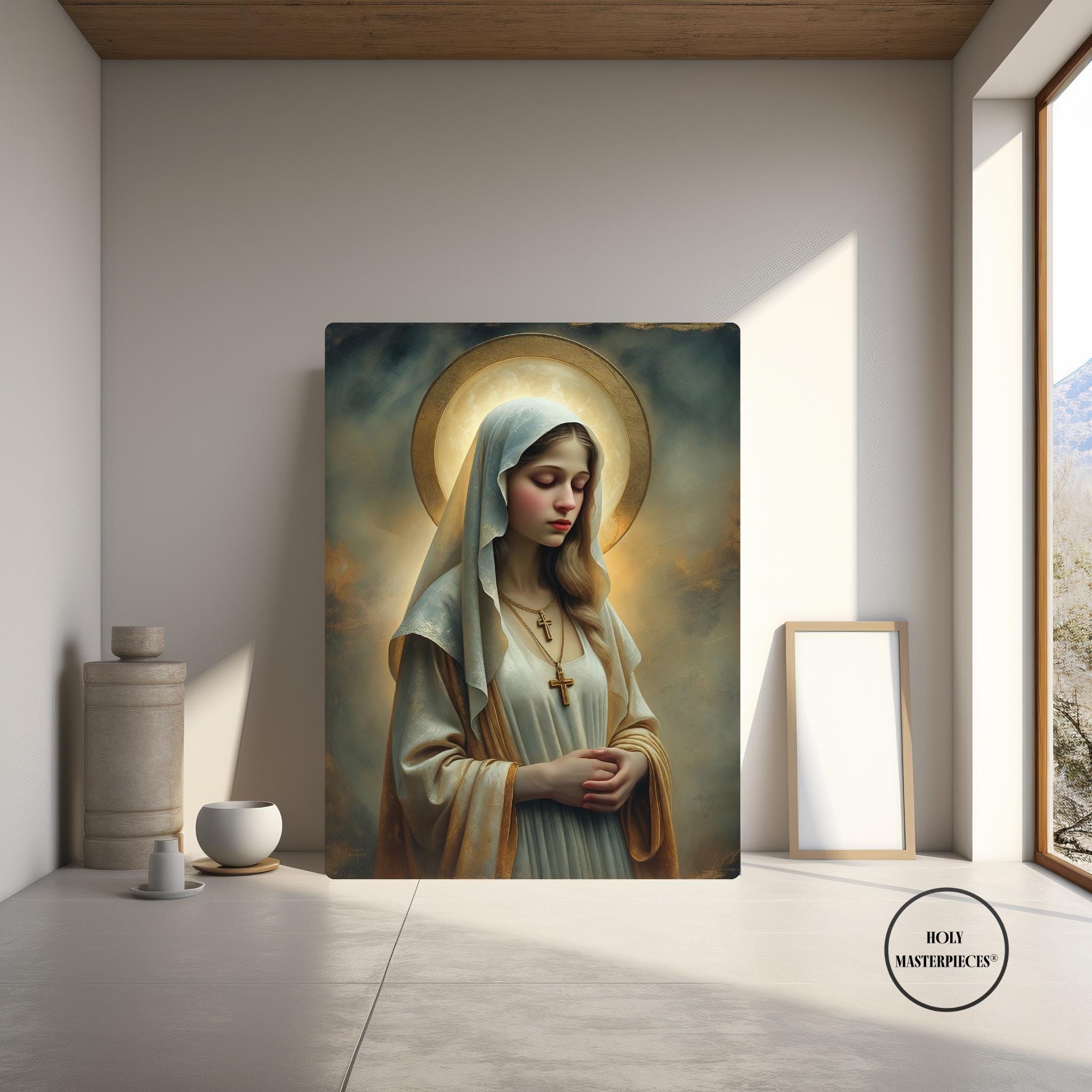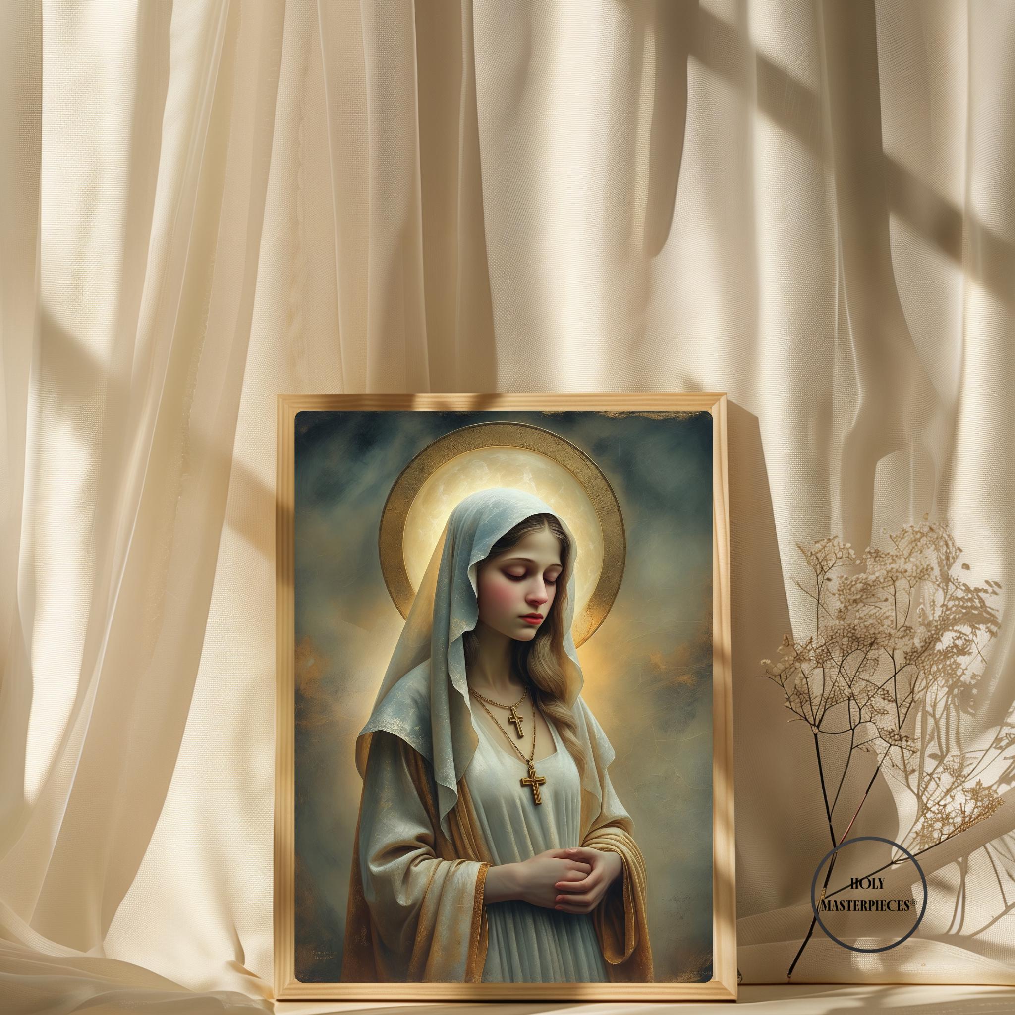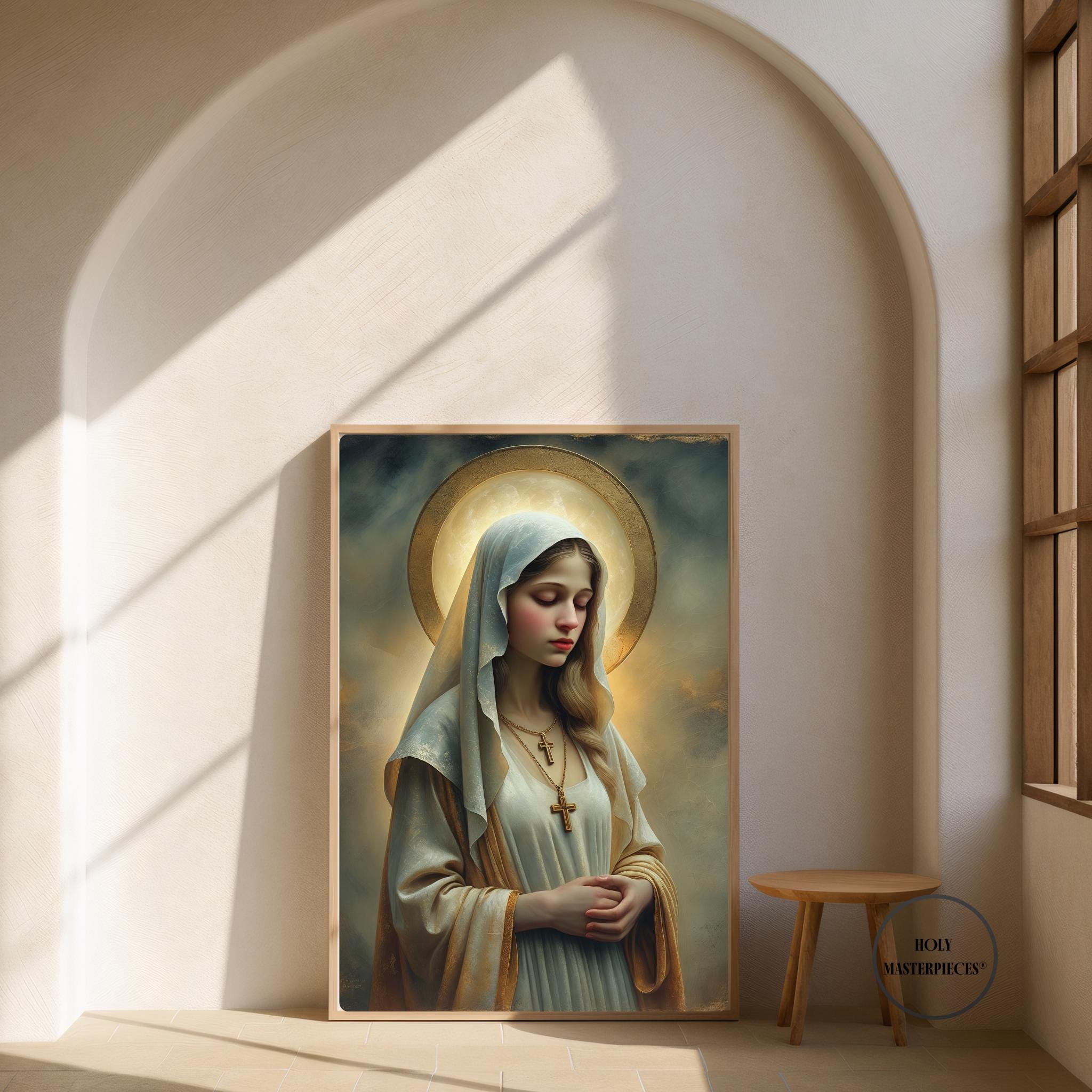 This serene Marian artwork portrays the Blessed Virgin in quiet contemplation as evening light gathers around her. Soft dusk tones envelop Mary’s gentle features, while her lowered gaze and still posture express humility, surrender, and interior prayer. The transition from light to shadow evokes the sacred hour of reflection, when the soul rests silently in God’s presence.