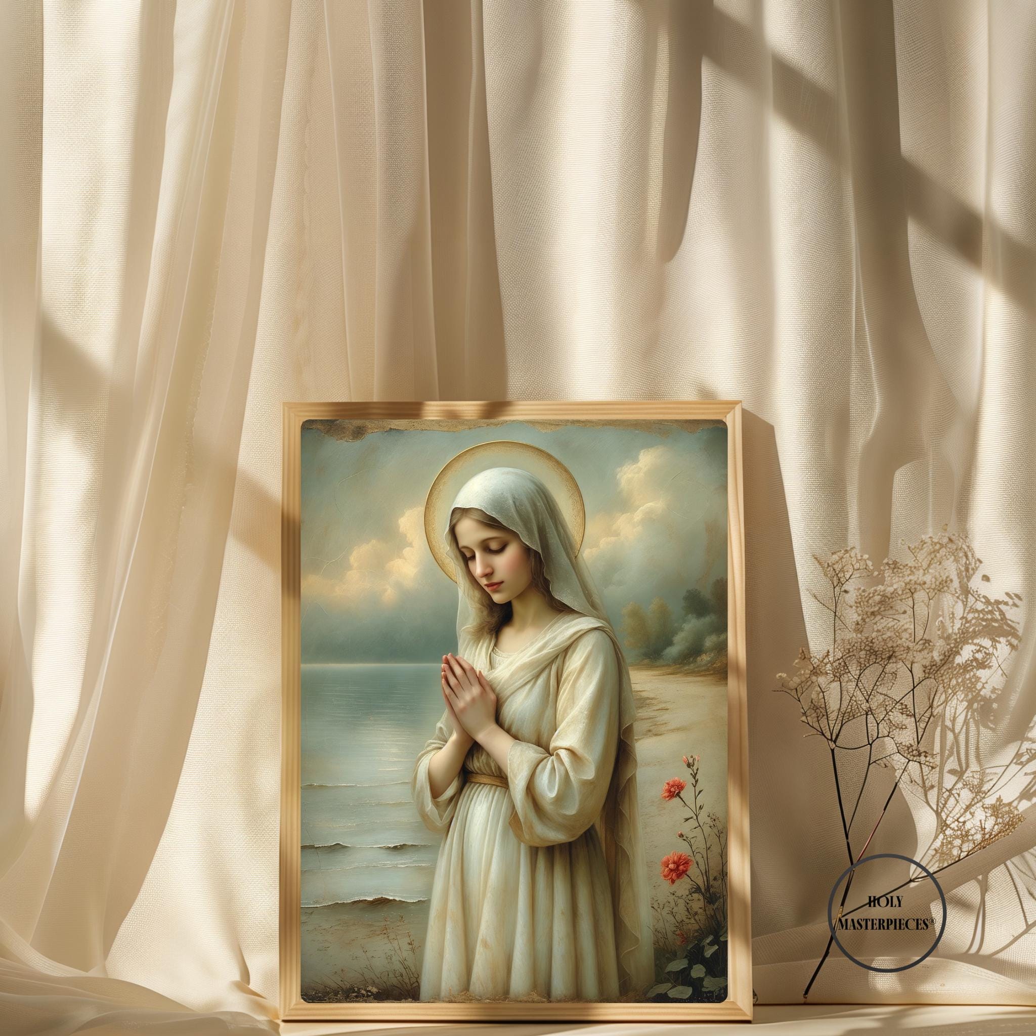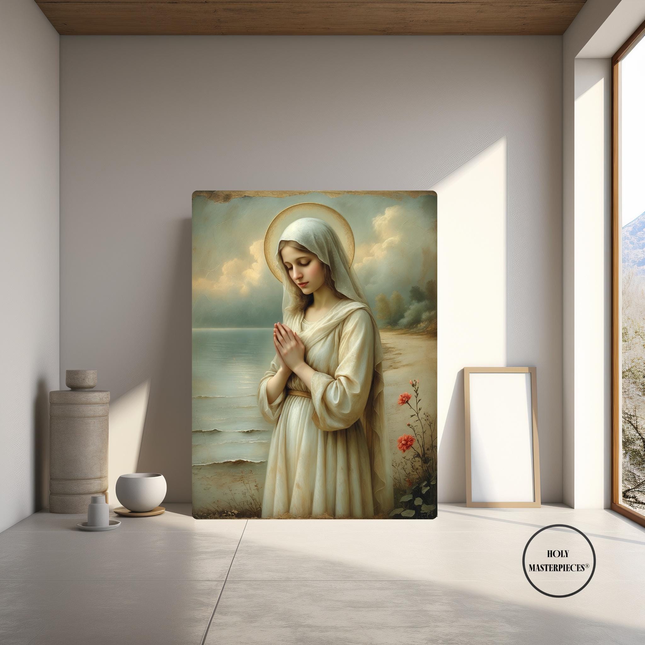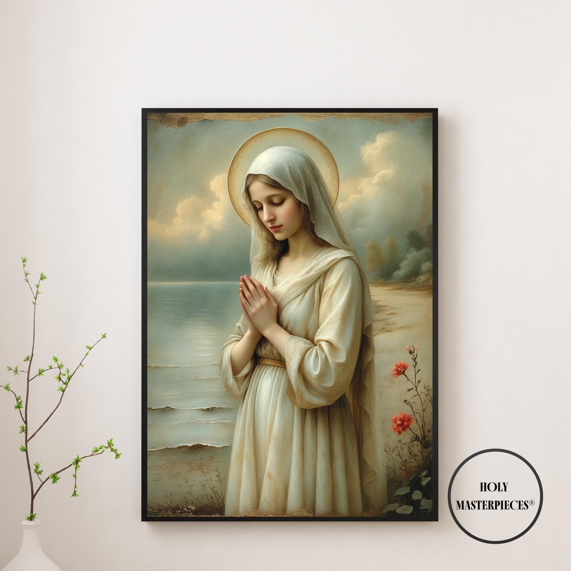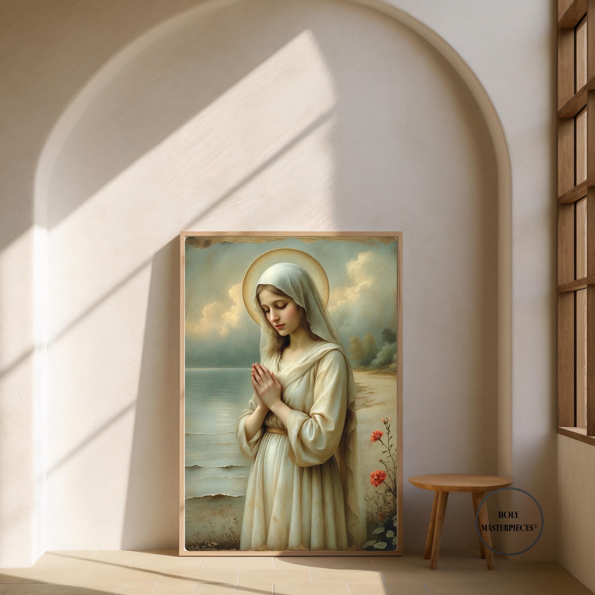 This serene Marian artwork depicts the Blessed Virgin in silent prayer beside a calm shoreline, her hands gently joined and her eyes lowered in humble devotion. The still water and distant horizon evoke interior peace, trust, and surrender, reflecting Mary’s role as a quiet refuge for the faithful.