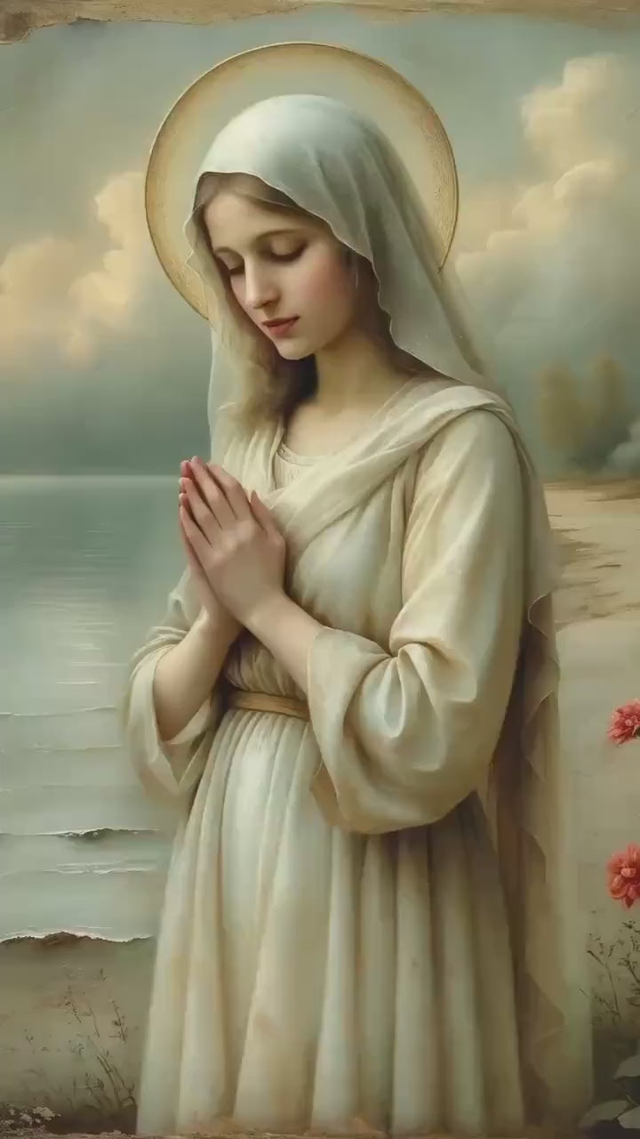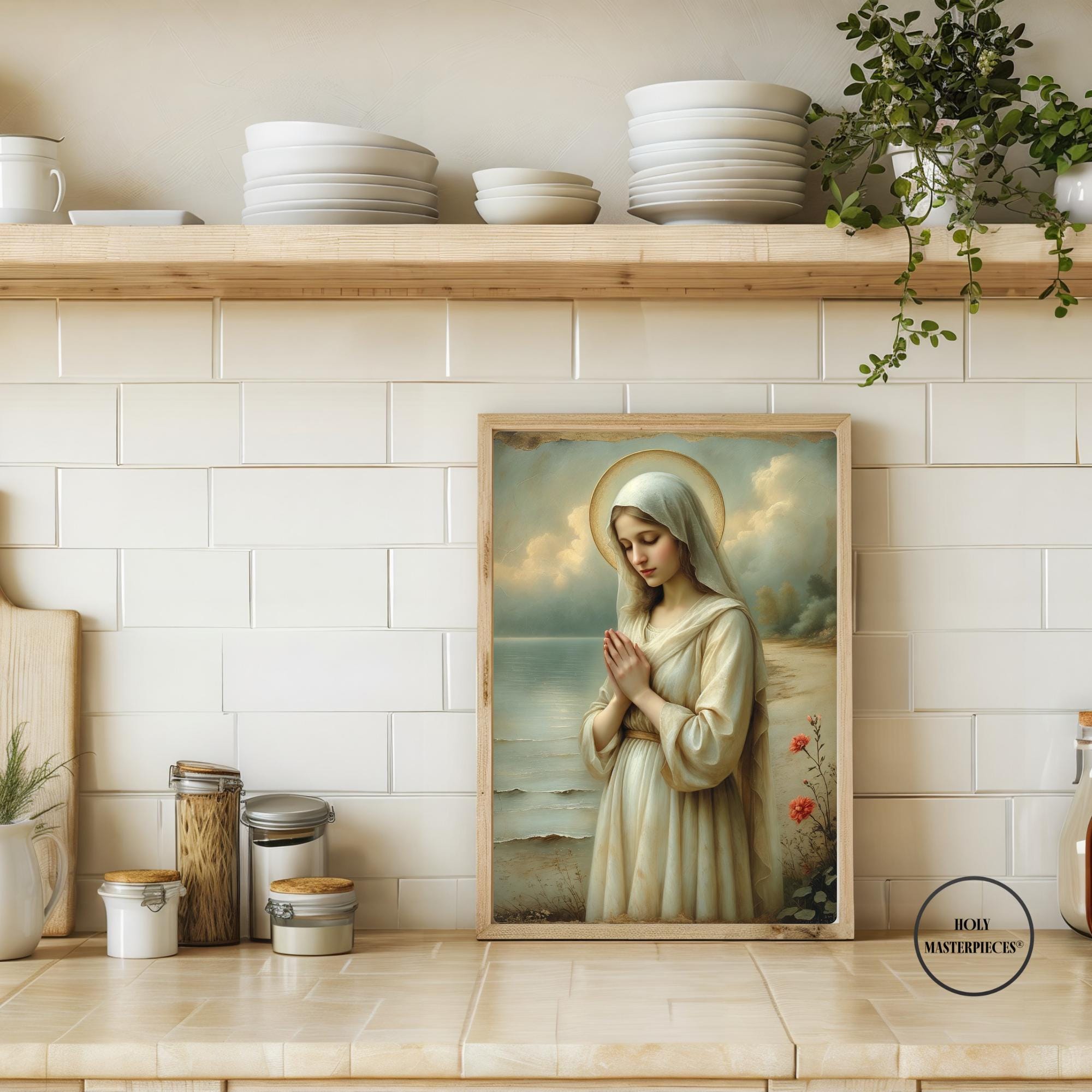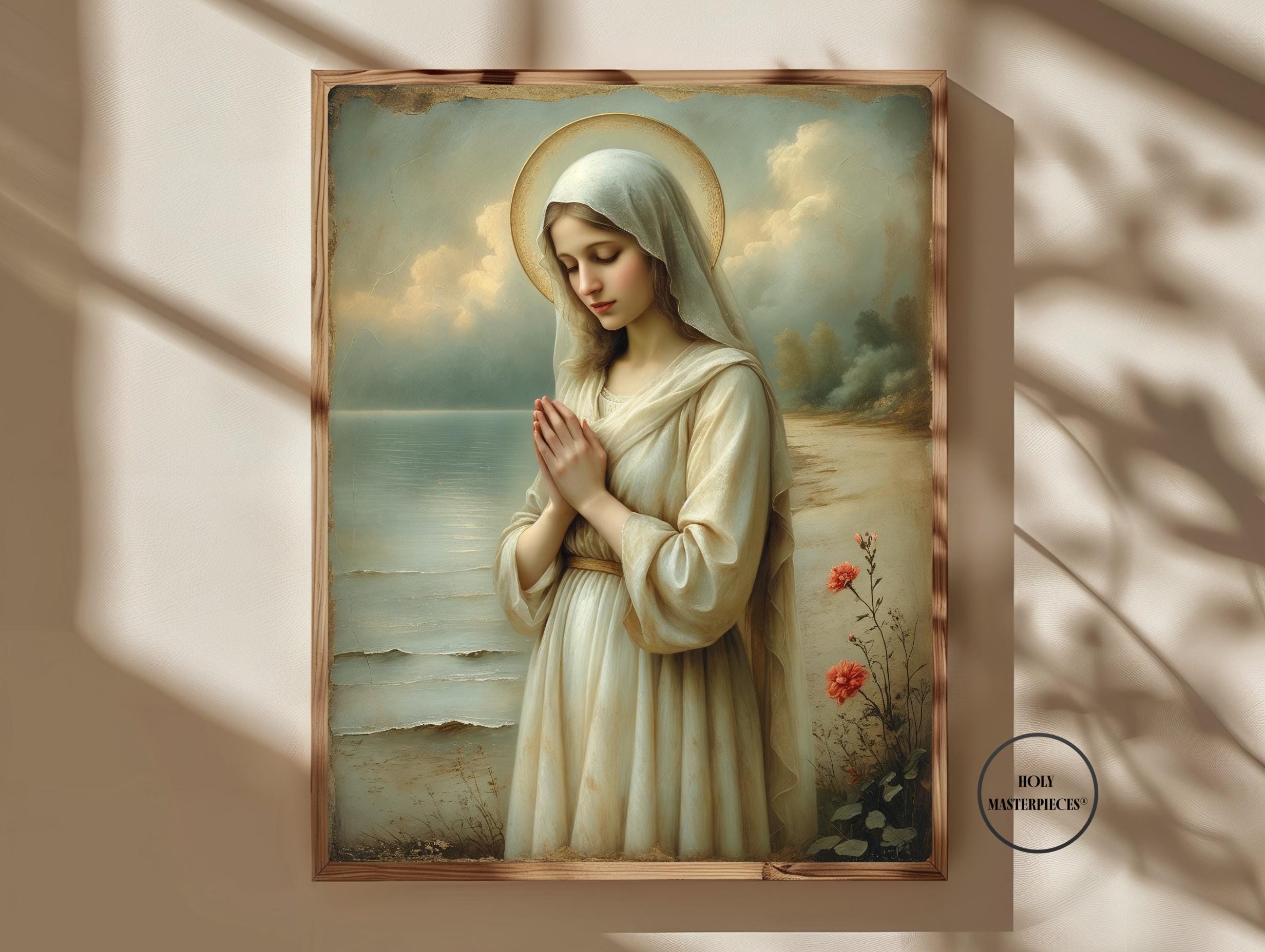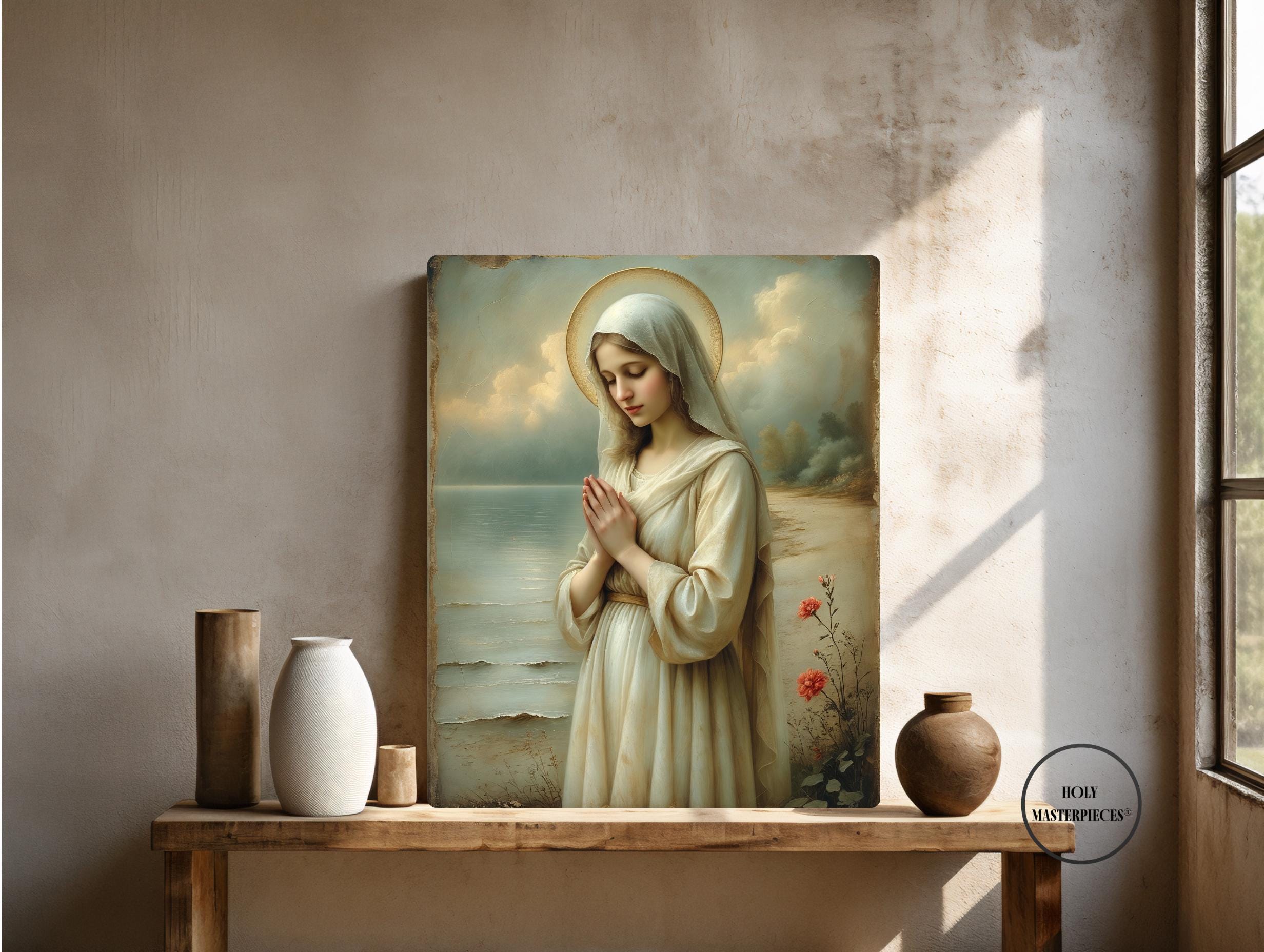 This serene Marian artwork depicts the Blessed Virgin in silent prayer beside a calm shoreline, her hands gently joined and her eyes lowered in humble devotion. The still water and distant horizon evoke interior peace, trust, and surrender, reflecting Mary’s role as a quiet refuge for the faithful.