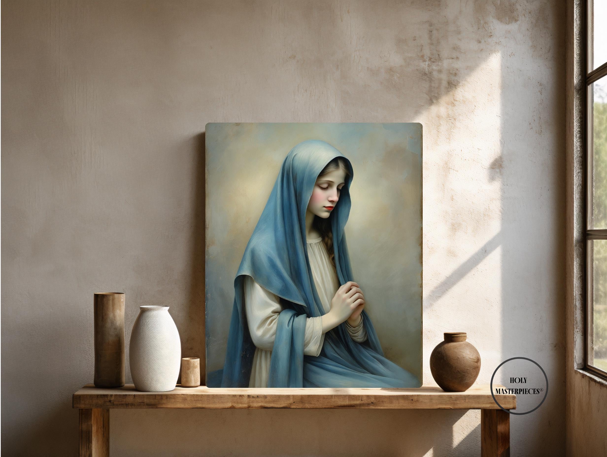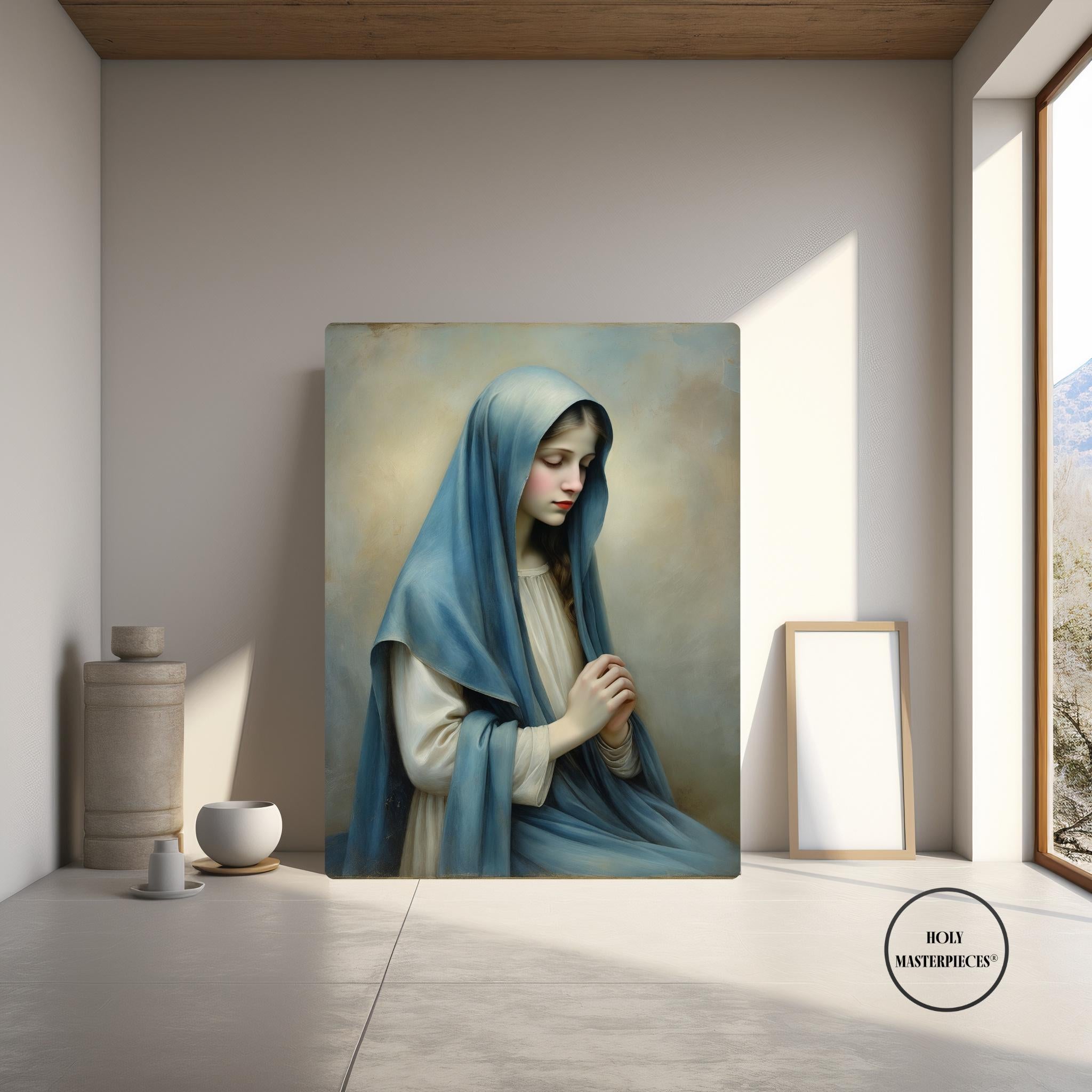 Inspired by classical 17th-century Western sacred oil painting, the artwork features softened edges, refined brushwork, and smooth tonal transitions. The museum-like finish and tactile surface make this piece especially suited for prayer rooms, chapels, bedrooms, and contemplative Marian spaces within Catholic homes.