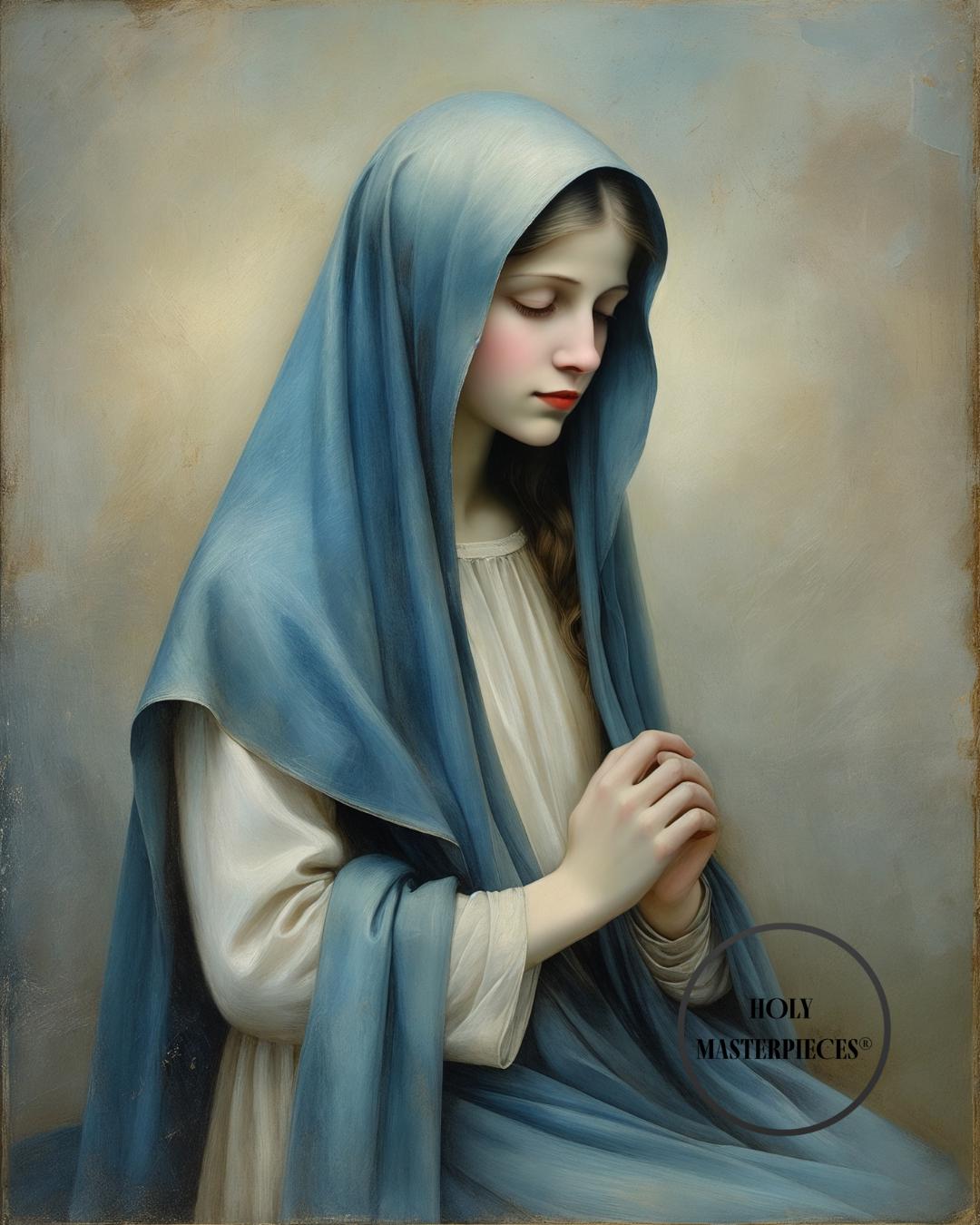 Her hands are softly gathered in calm surrender, reinforcing a posture of humility and silent prayer. The dark blue veil contrasts gently with her ivory garments, creating a balanced and harmonious devotional palette. Subtle chiaroscuro lighting shapes her features and flowing fabric with painterly restraint, while a soft halo glow and muted background preserve a timeless, reverent atmosphere.