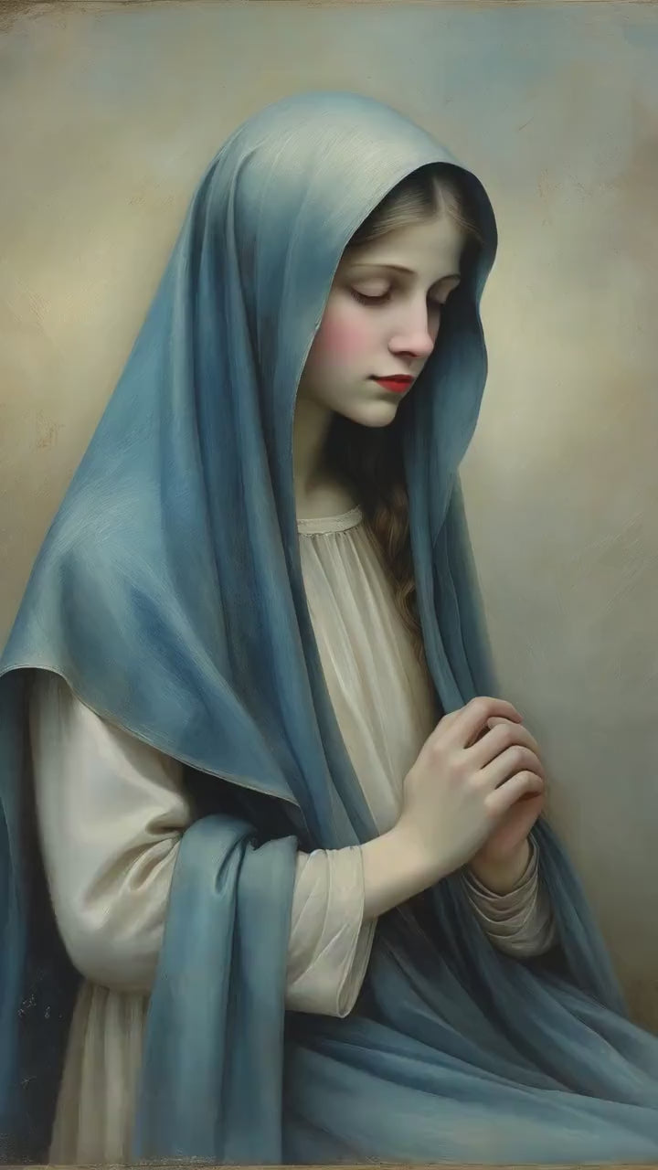 Mary’s Dark Blue Veil presents the Blessed Virgin Mary in quiet half-length repose, her head gently inclined and eyes lowered in prayerful contemplation. A deep dark blue veil drapes over her head and shoulders, its rich, subdued tone conveying humility, reverence, and steadfast faith. This Catholic Marian wall art centers on interior devotion and sacred stillness rather than dramatic gesture.