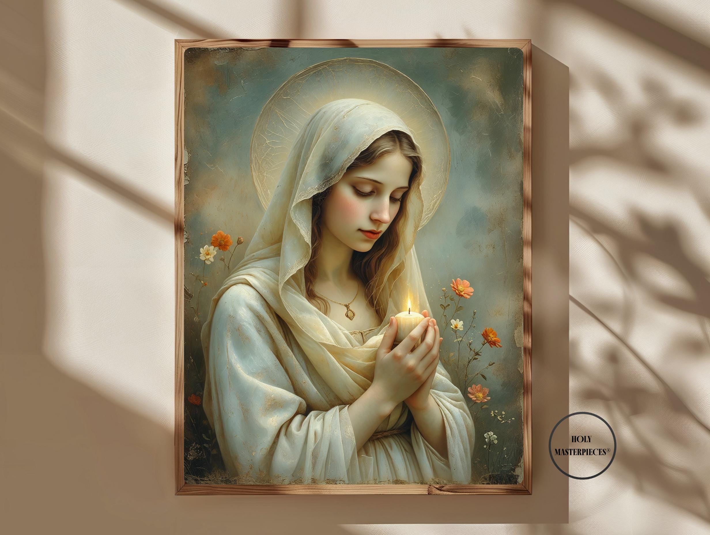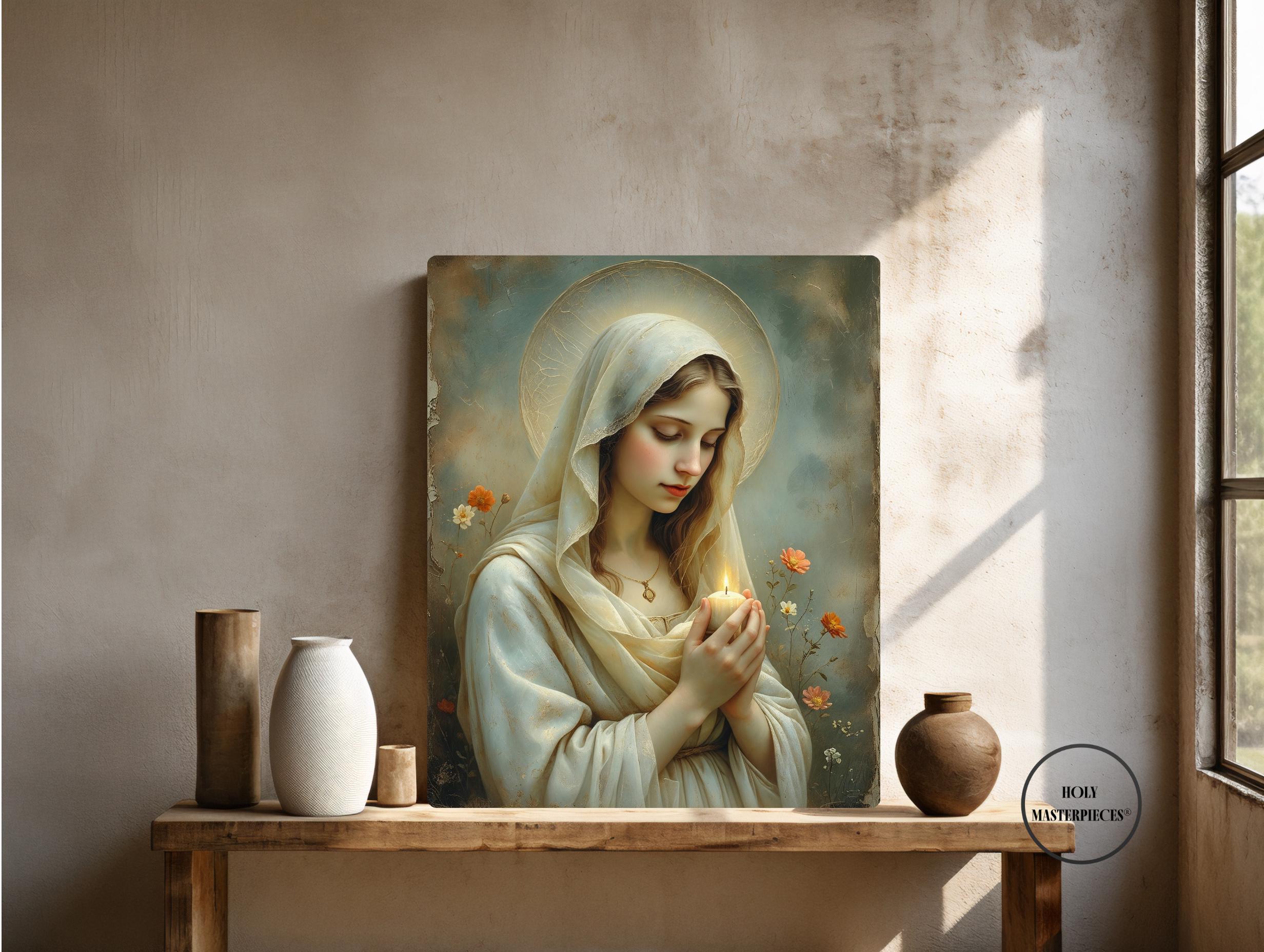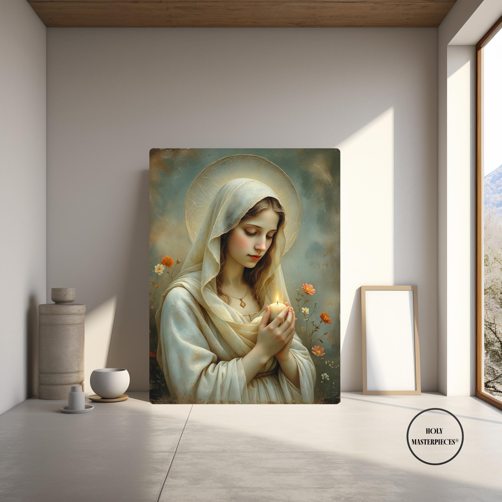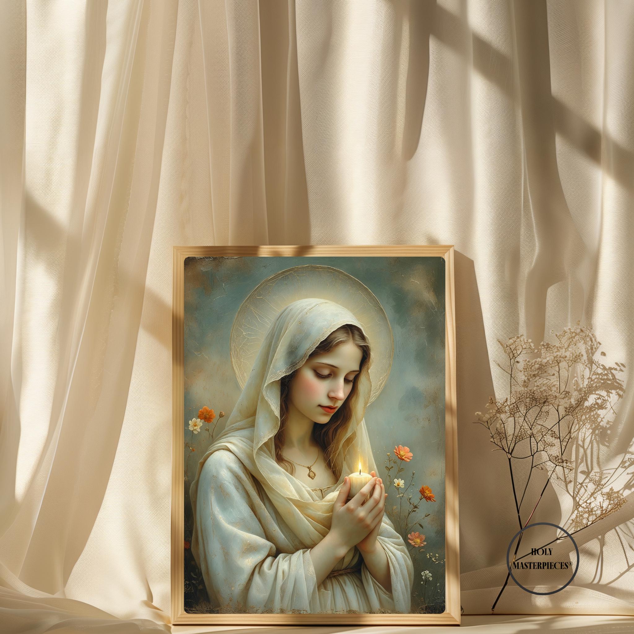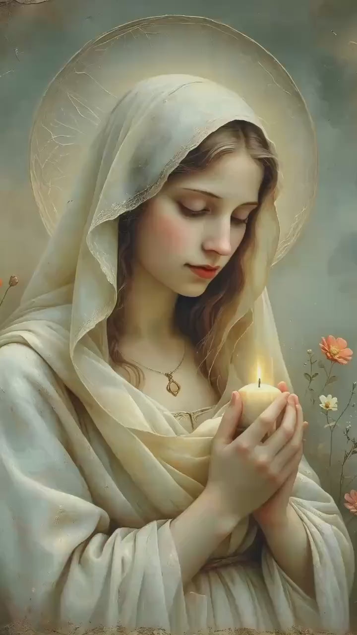 This tender Marian artwork portrays the Blessed Virgin holding a small candle, its gentle flame symbolizing faith carried quietly through the stillness of prayer. Surrounded by delicate meadow flowers, Mary’s lowered gaze and softly joined hands reflect humility, hope, and steadfast trust in God’s light.