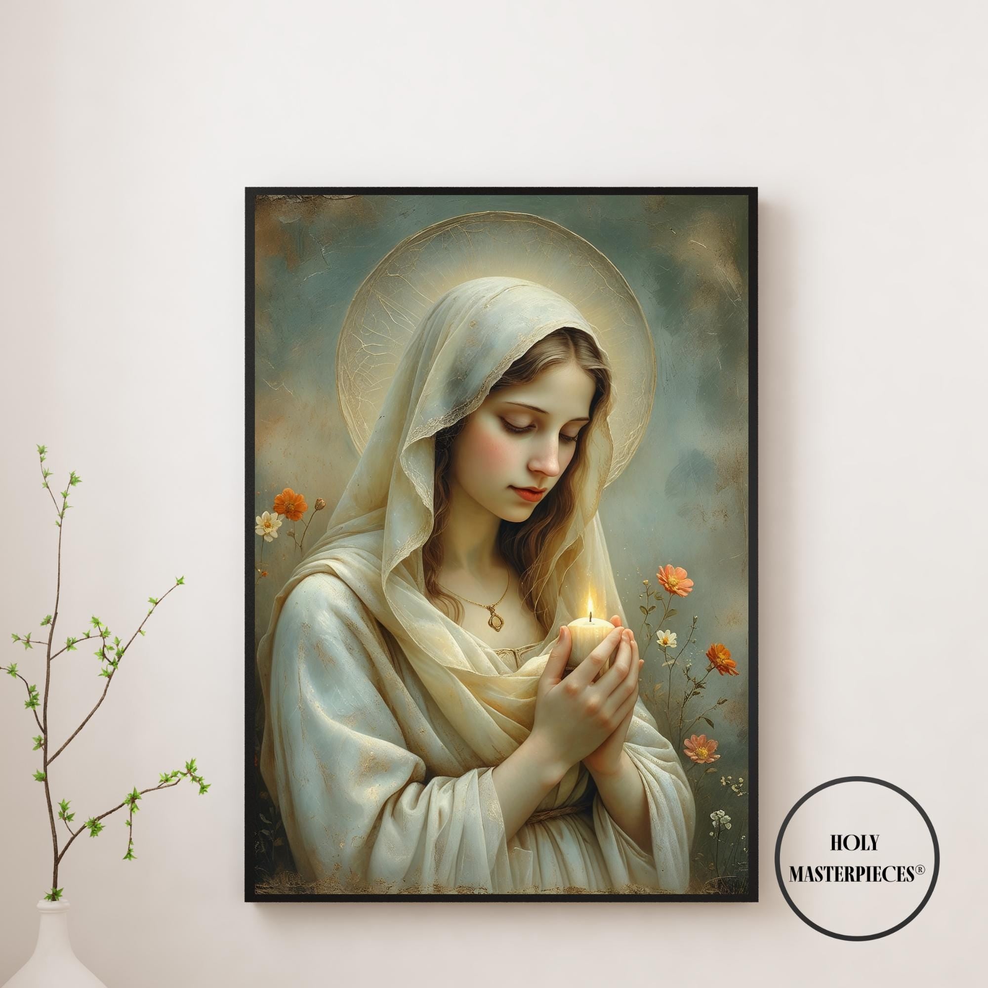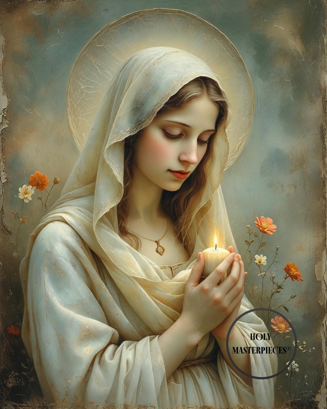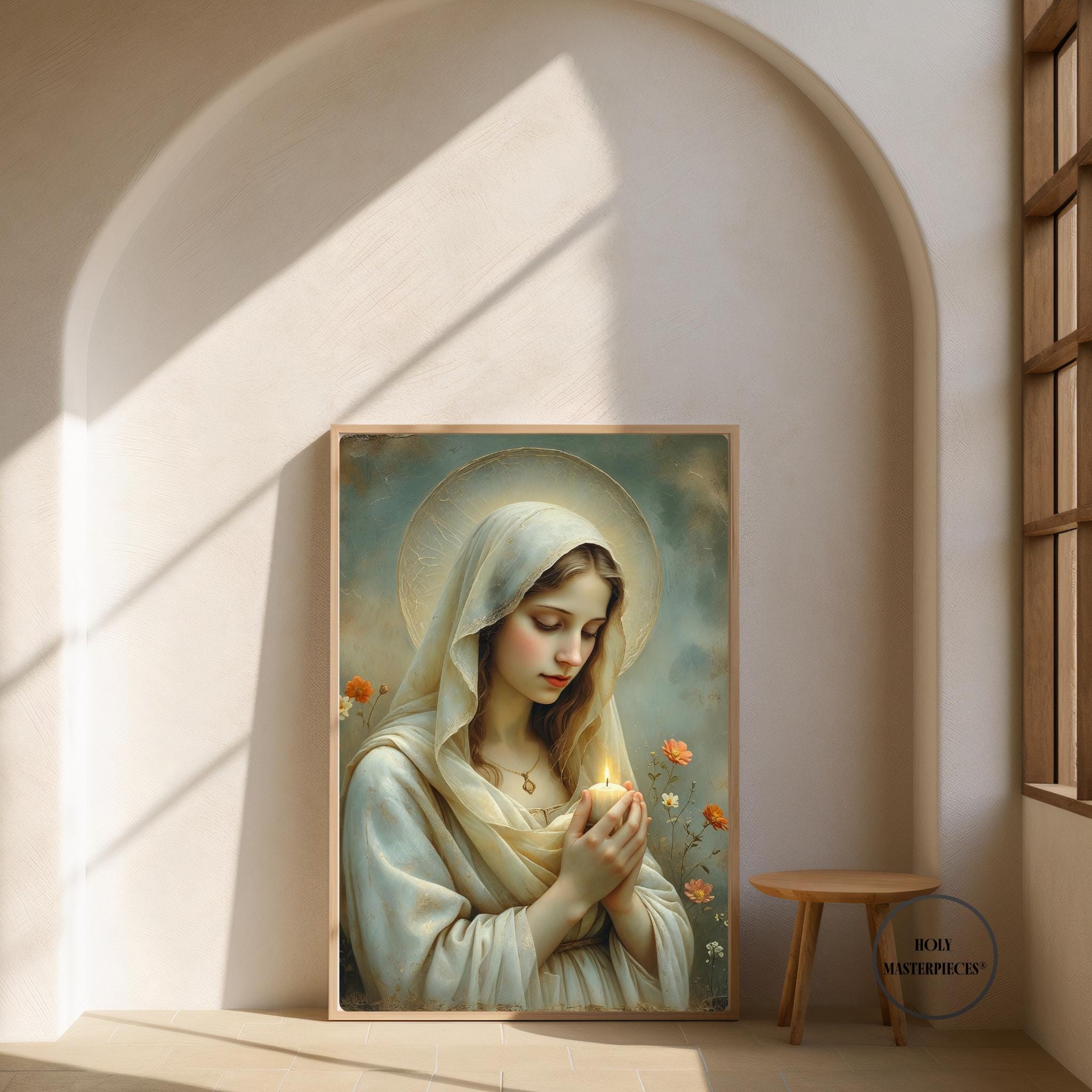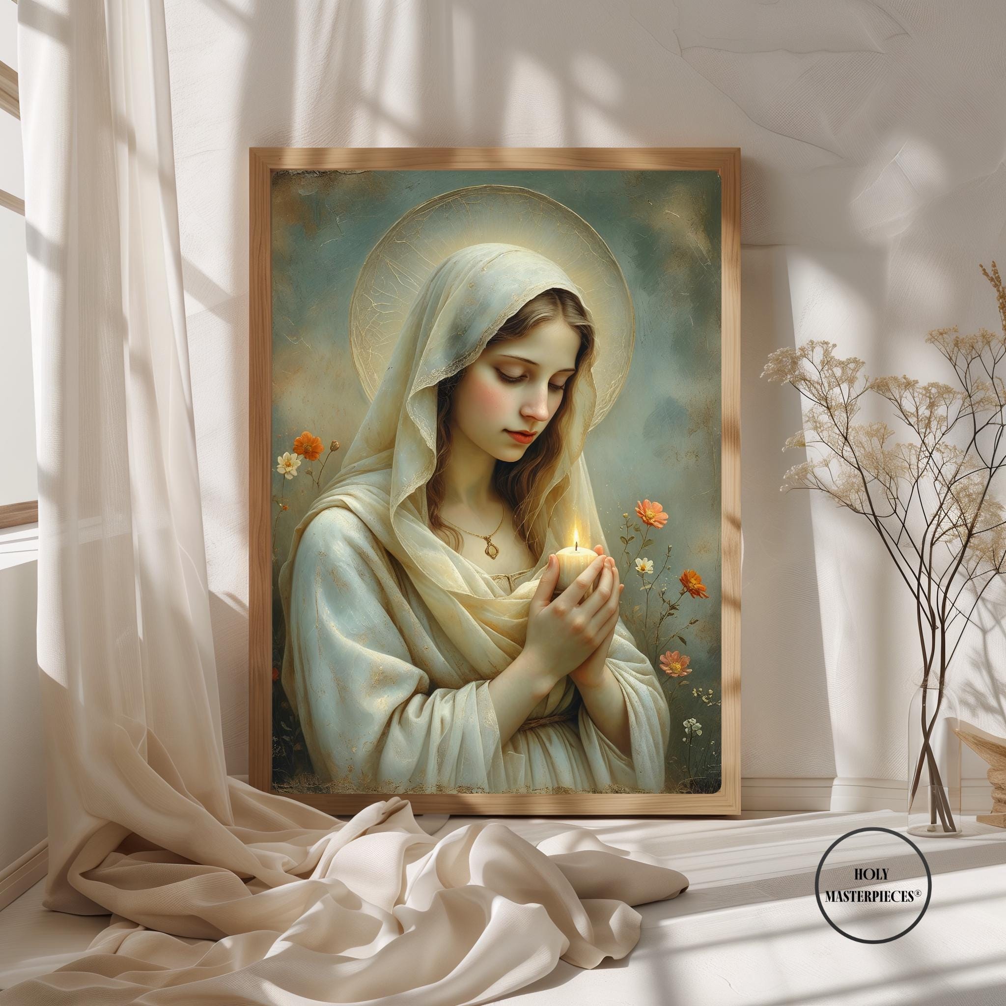 This tender Marian artwork portrays the Blessed Virgin holding a small candle, its gentle flame symbolizing faith carried quietly through the stillness of prayer. Surrounded by delicate meadow flowers, Mary’s lowered gaze and softly joined hands reflect humility, hope, and steadfast trust in God’s light.