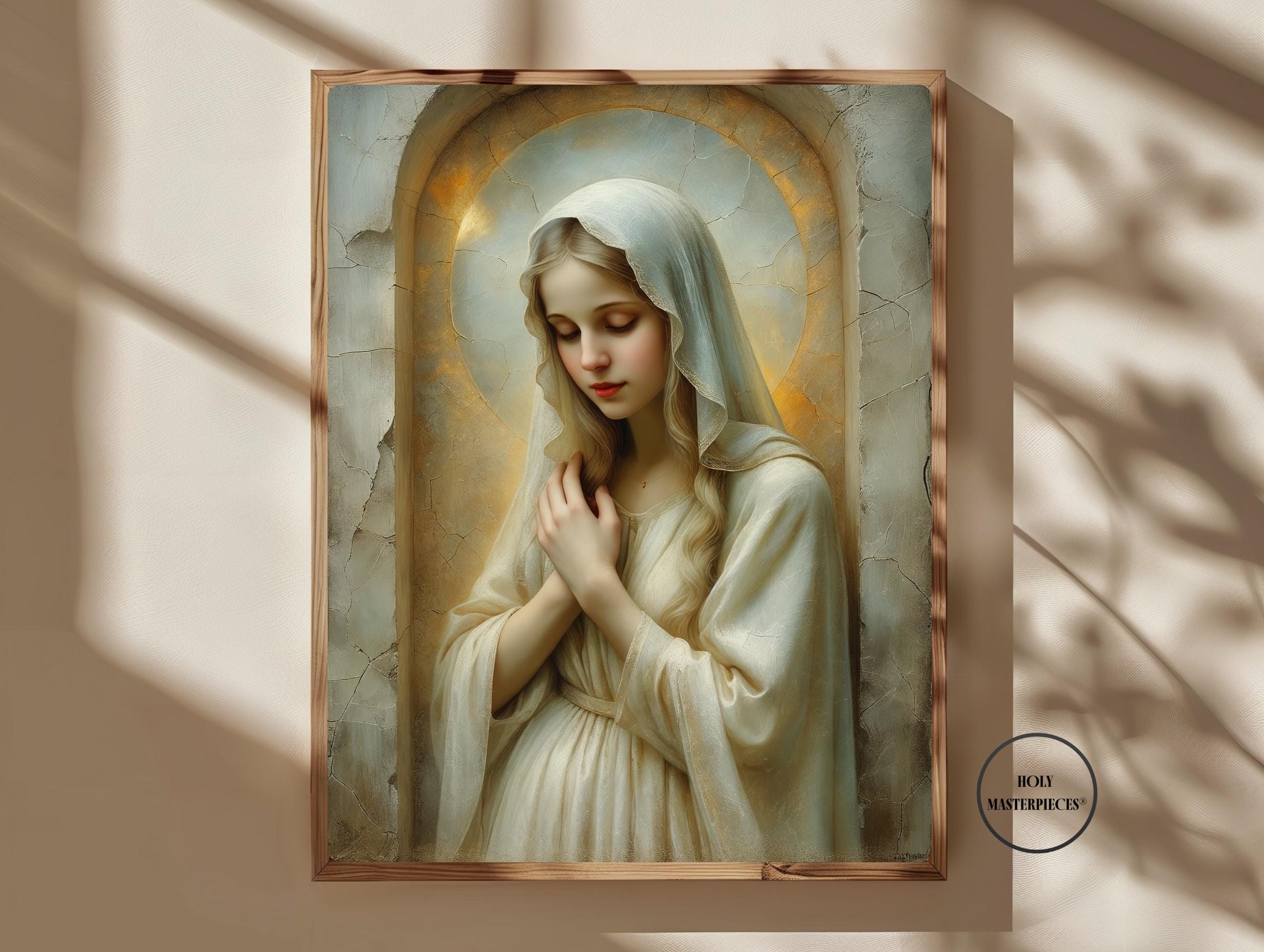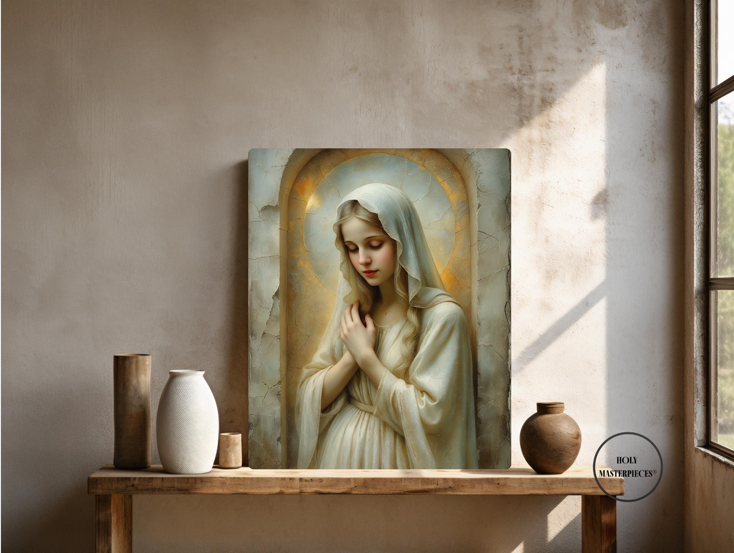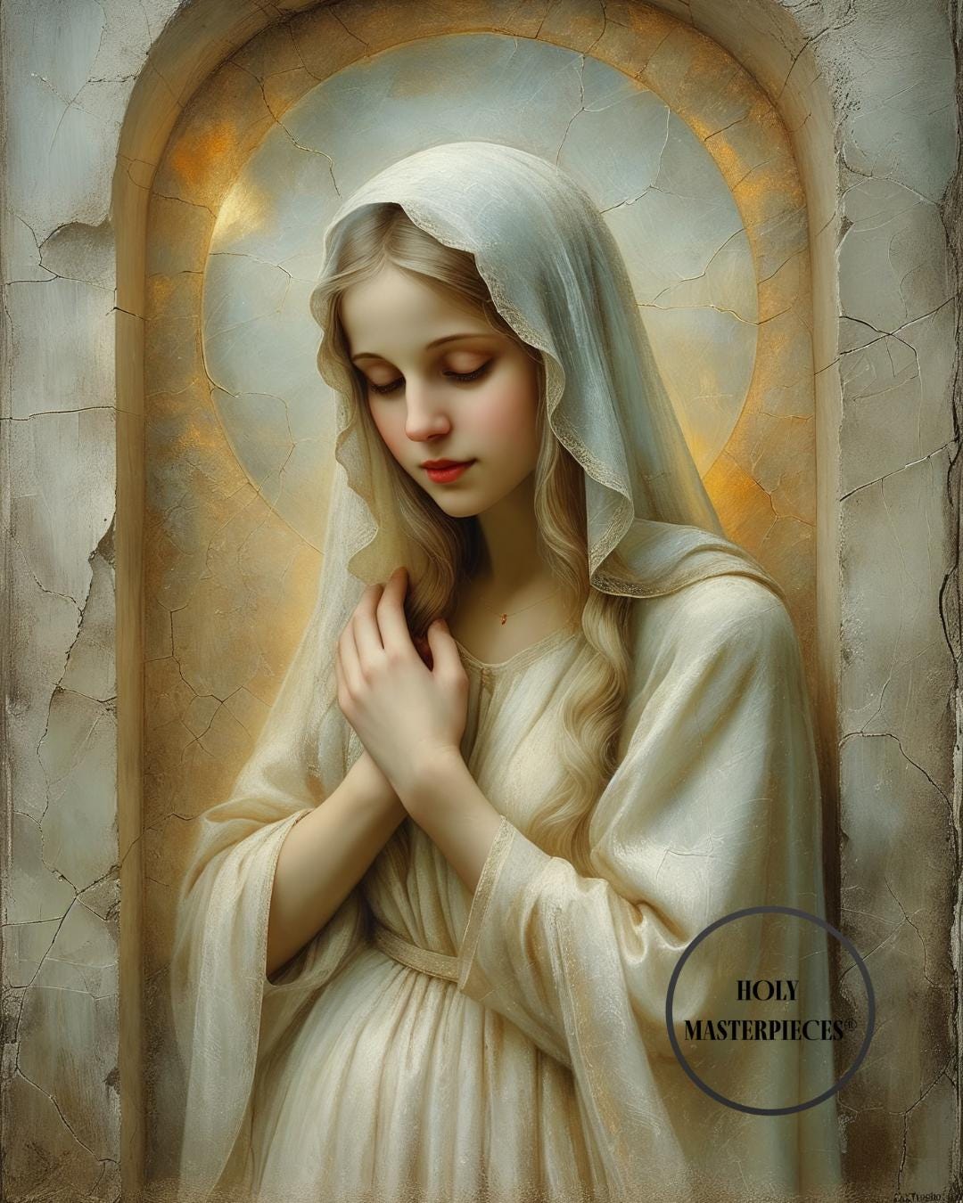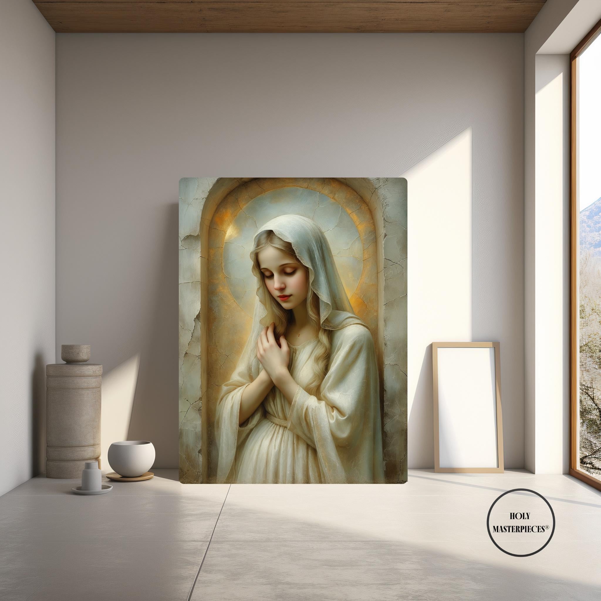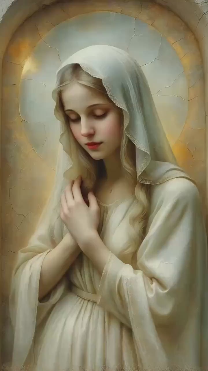 Created in the tradition of a classical 17th-century Western sacred oil painting, the composition is marked by a muted palette, soft painterly texture, and delicate sacred chiaroscuro. Mary is veiled in luminous ivory tones, her figure surrounded by a warm devotional glow that blends seamlessly into an aged cracked-plaster background. The softened edges and radiant stillness create a timeless image meant to inspire contemplation and devotion.
