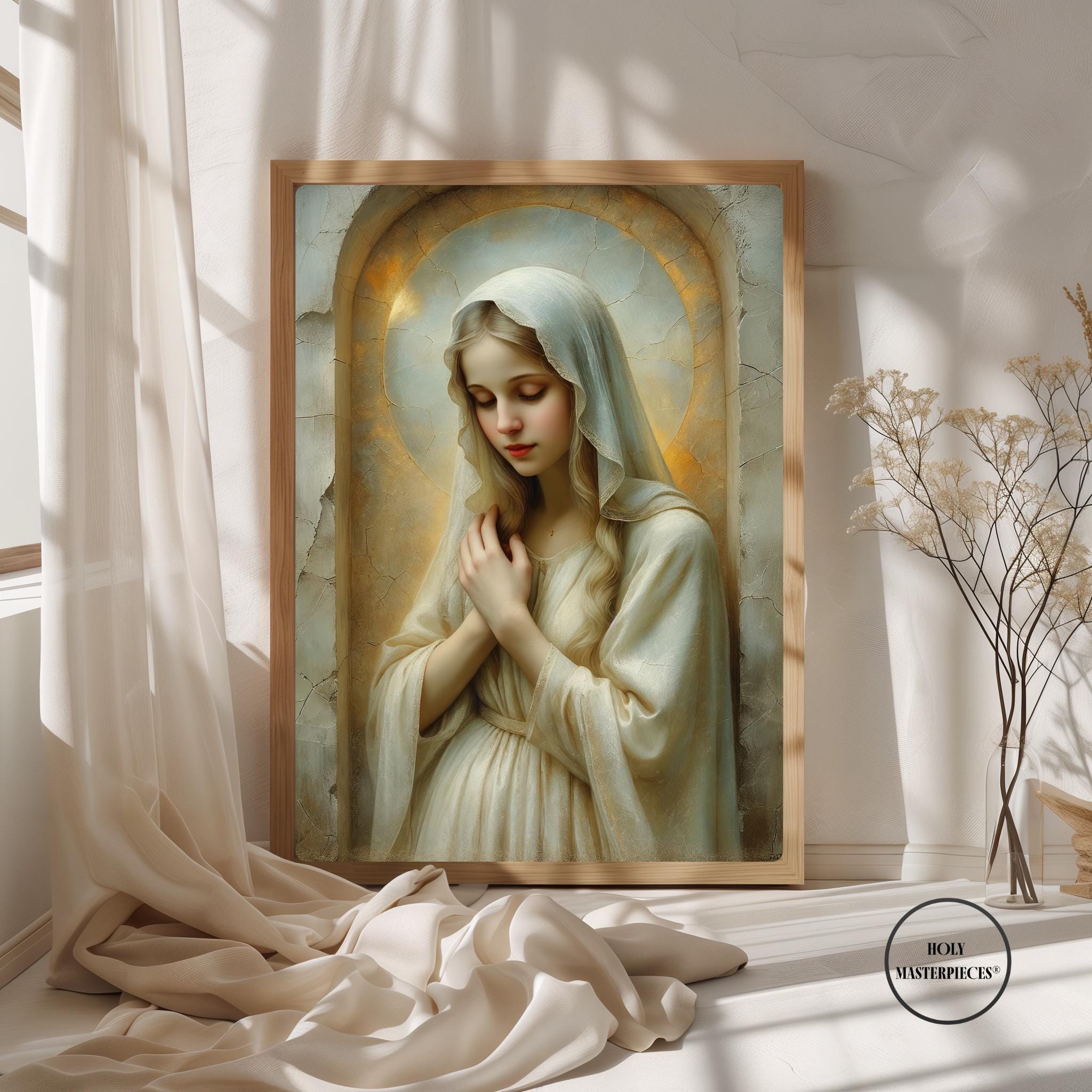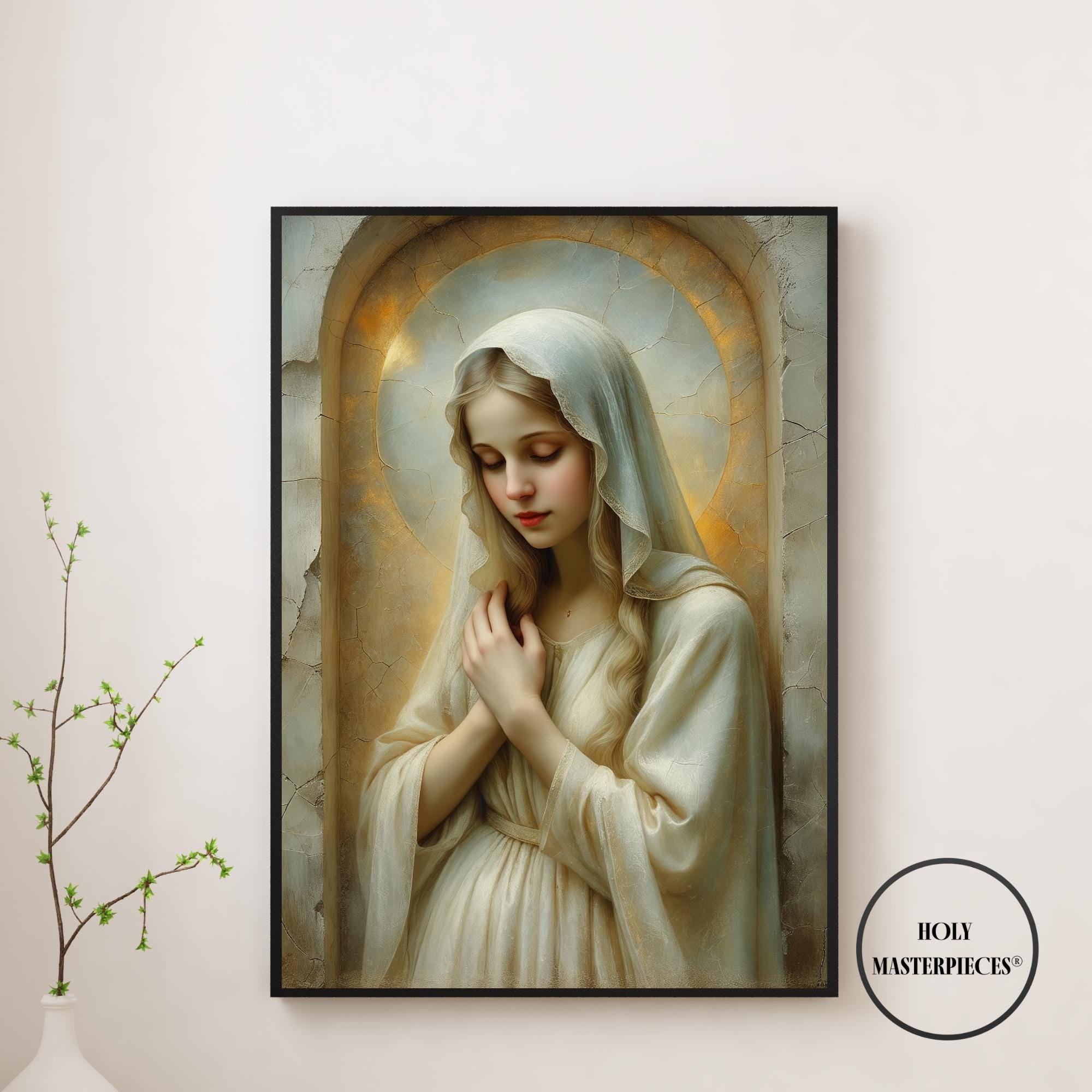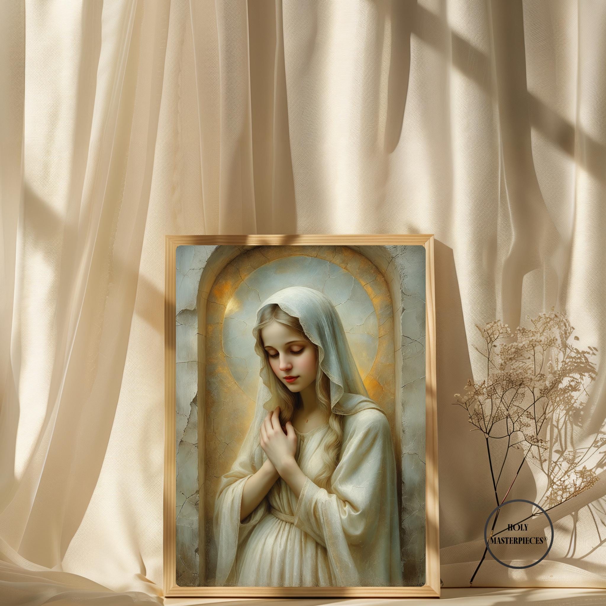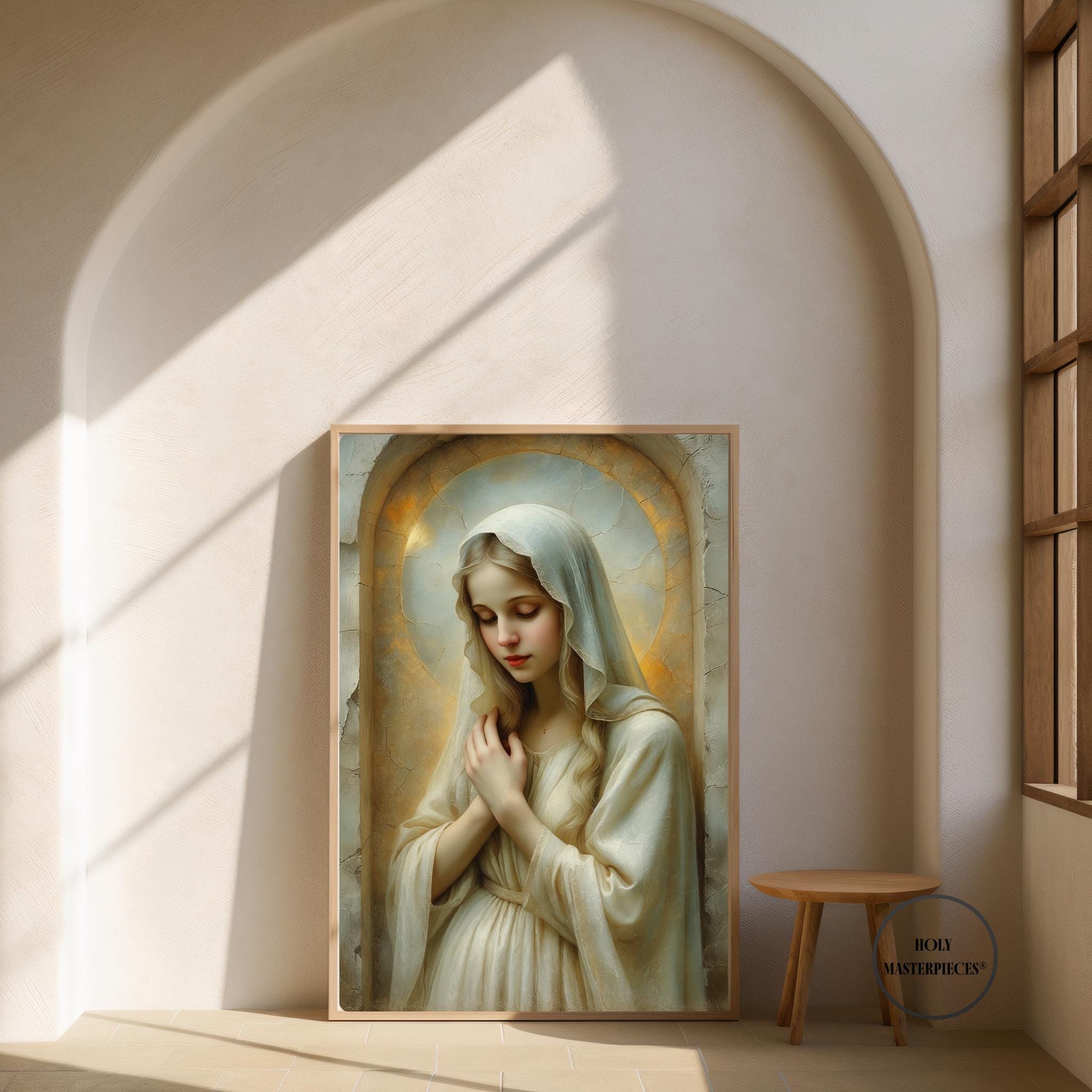 Created in the tradition of a classical 17th-century Western sacred oil painting, the composition is marked by a muted palette, soft painterly texture, and delicate sacred chiaroscuro. Mary is veiled in luminous ivory tones, her figure surrounded by a warm devotional glow that blends seamlessly into an aged cracked-plaster background. The softened edges and radiant stillness create a timeless image meant to inspire contemplation and devotion.
