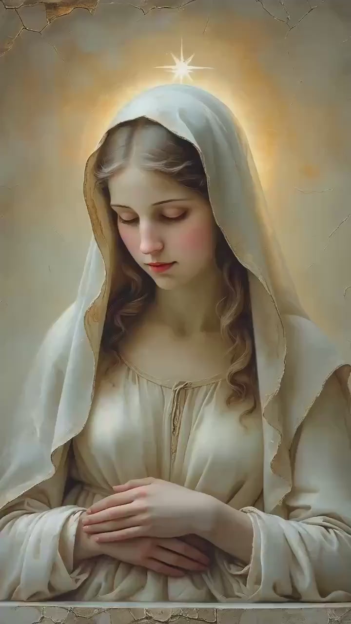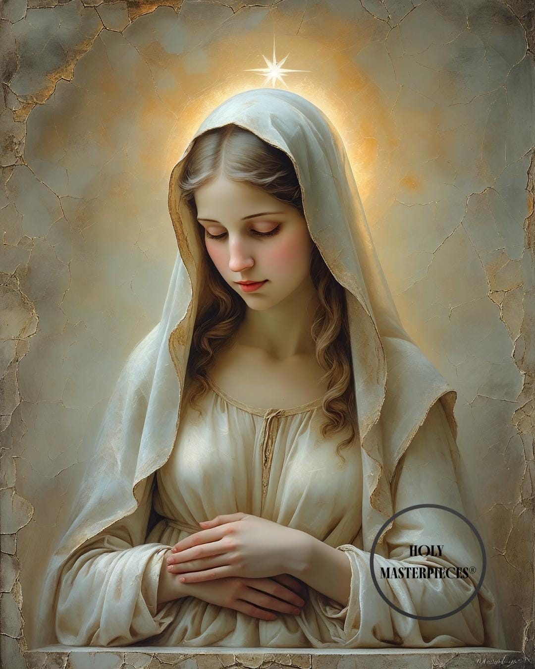 The muted twilight tones, soft painterly textures, and cracked-plaster background create a timeless sacred atmosphere reminiscent of ancient frescoes. The subdued illumination of the star adds a sense of heavenly stillness and contemplative peace.