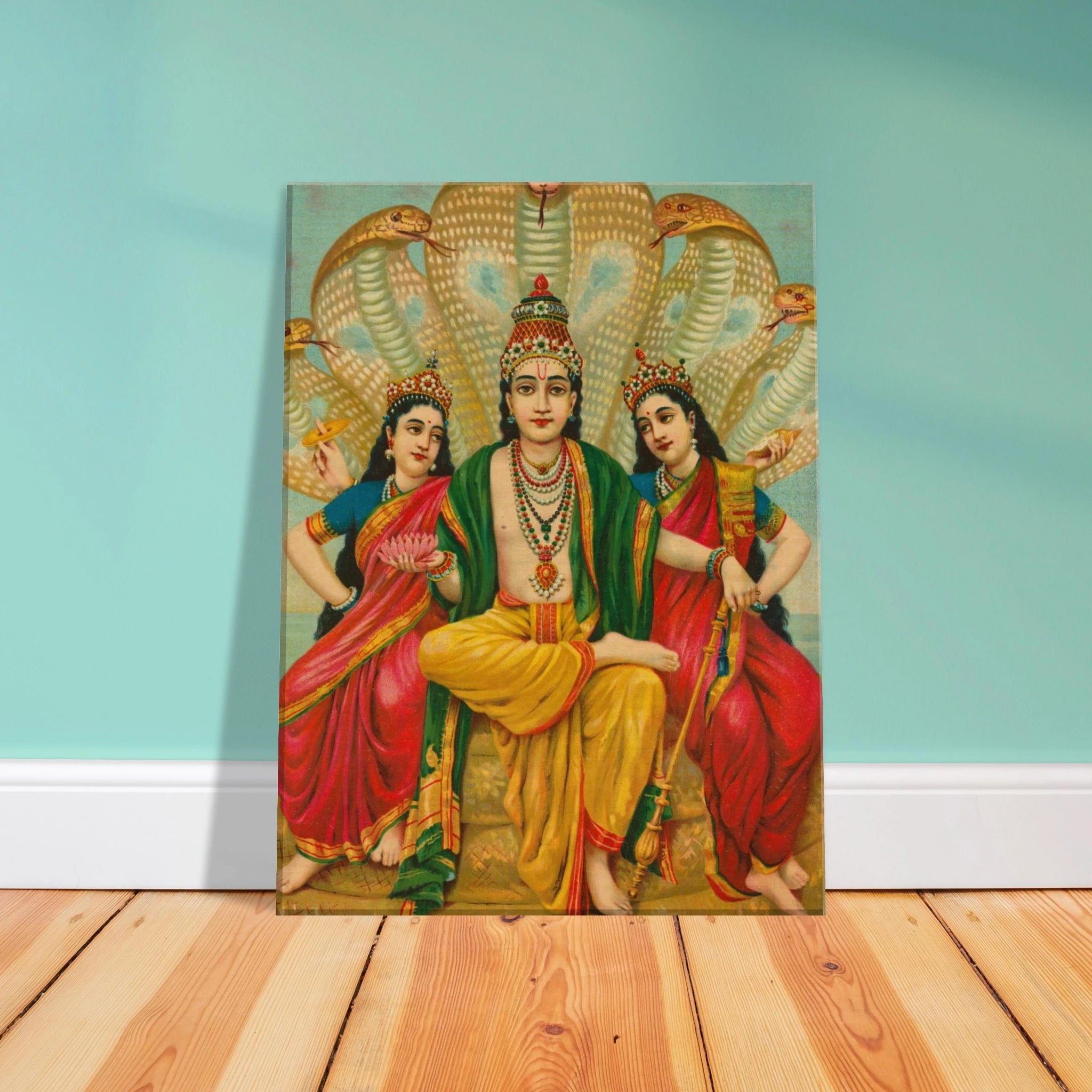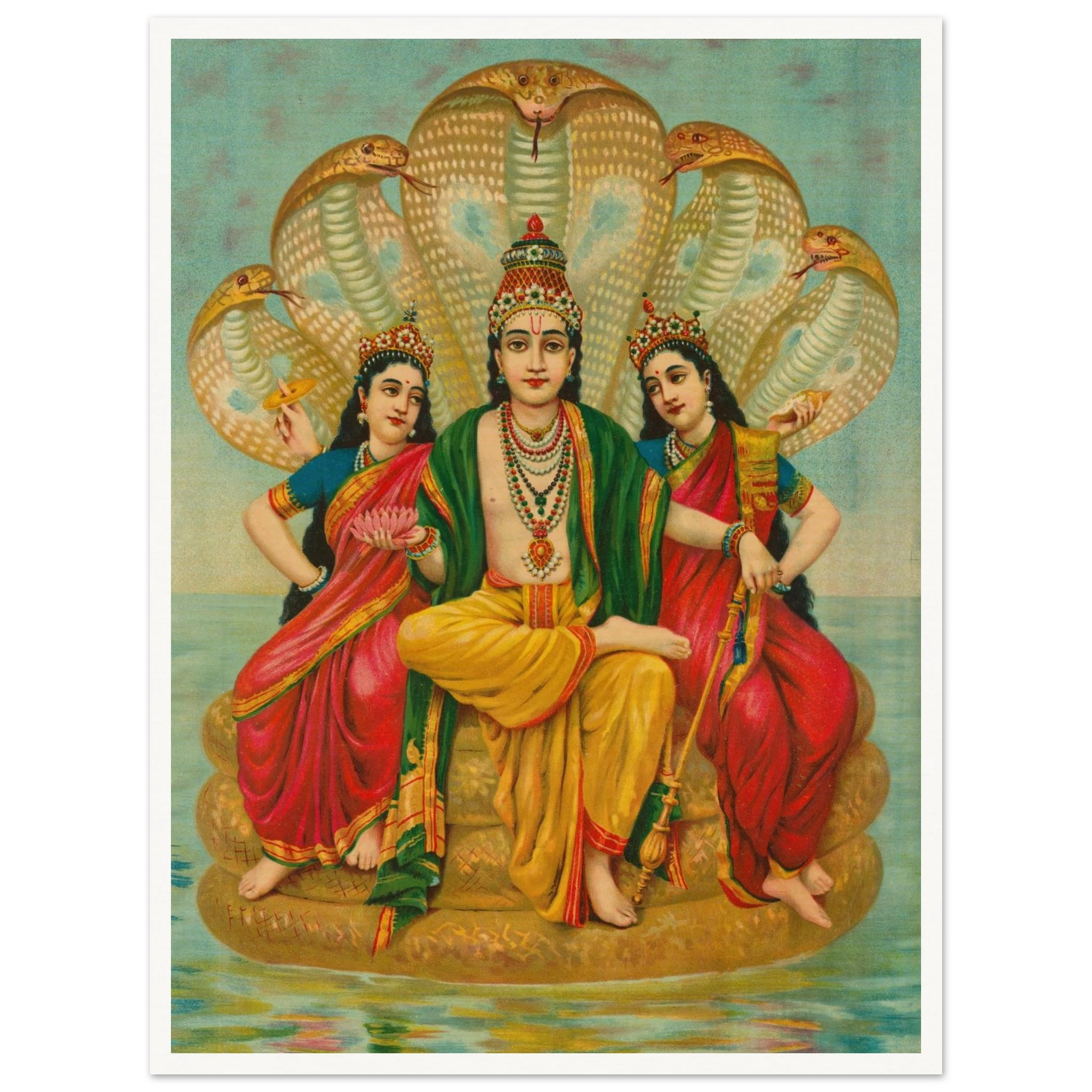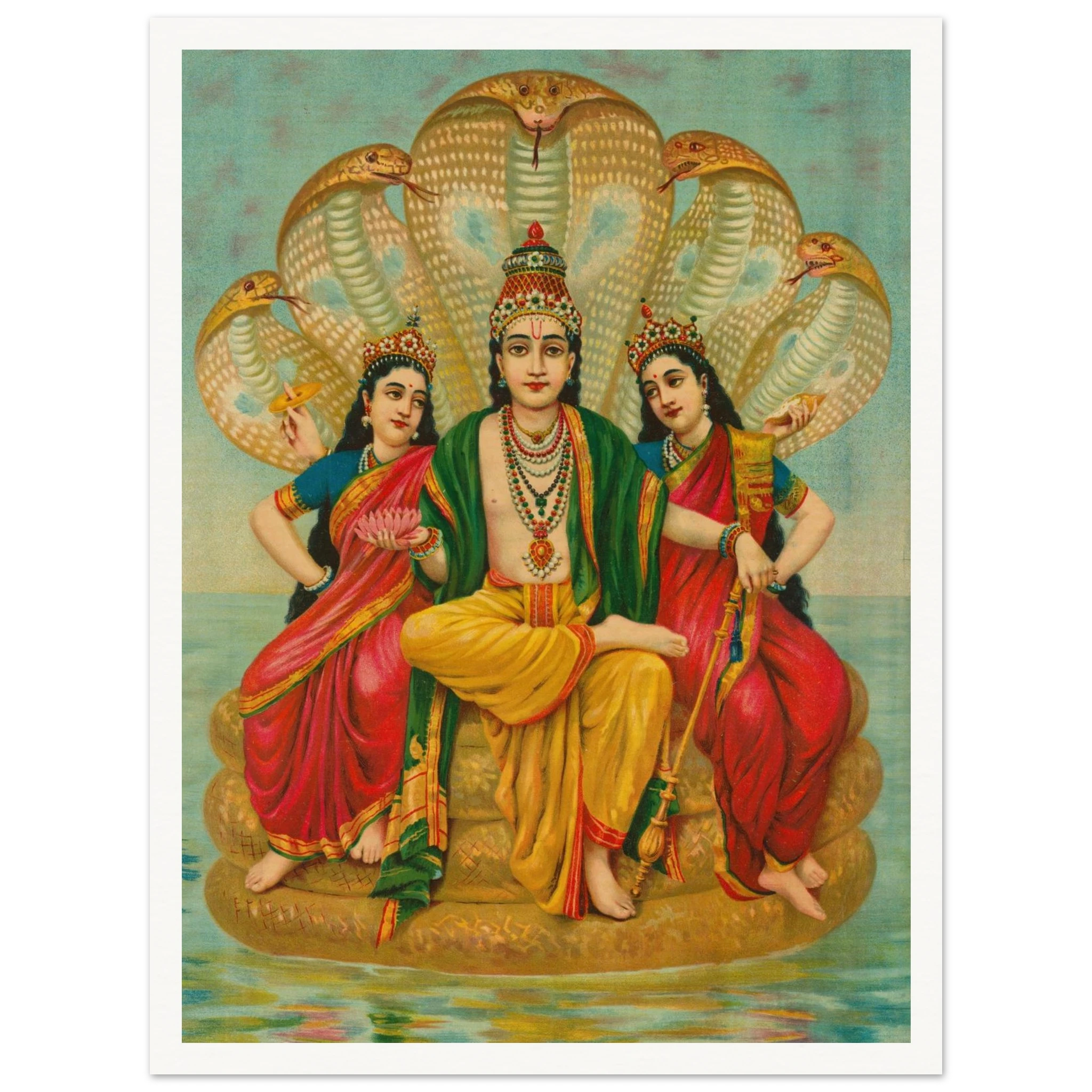 This art print, created in 1900 by renowned artist Raja Ravi Varma, depicts the Hindu deity Shesha Narayana. With expert use of colors and intricate details, this print is a stunning representation of the divine. Bring cultural and aesthetic appreciation to any room with this piece.