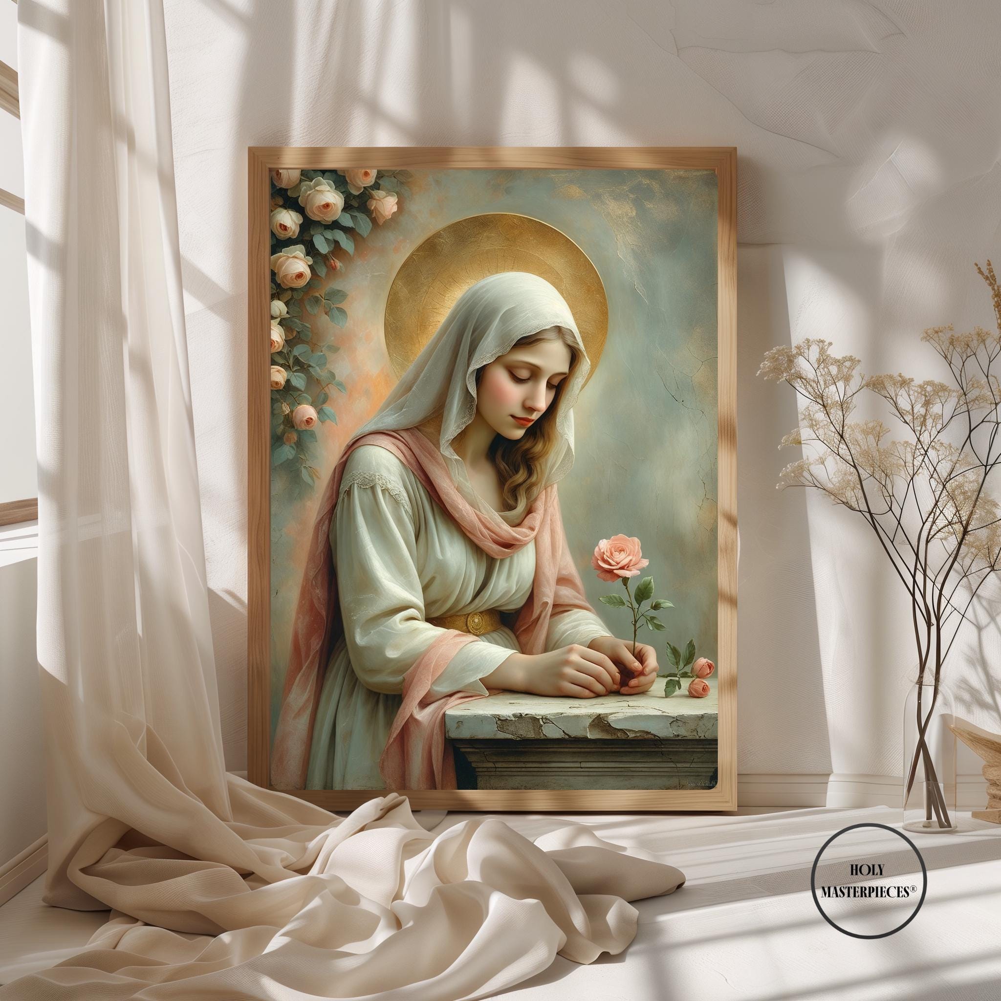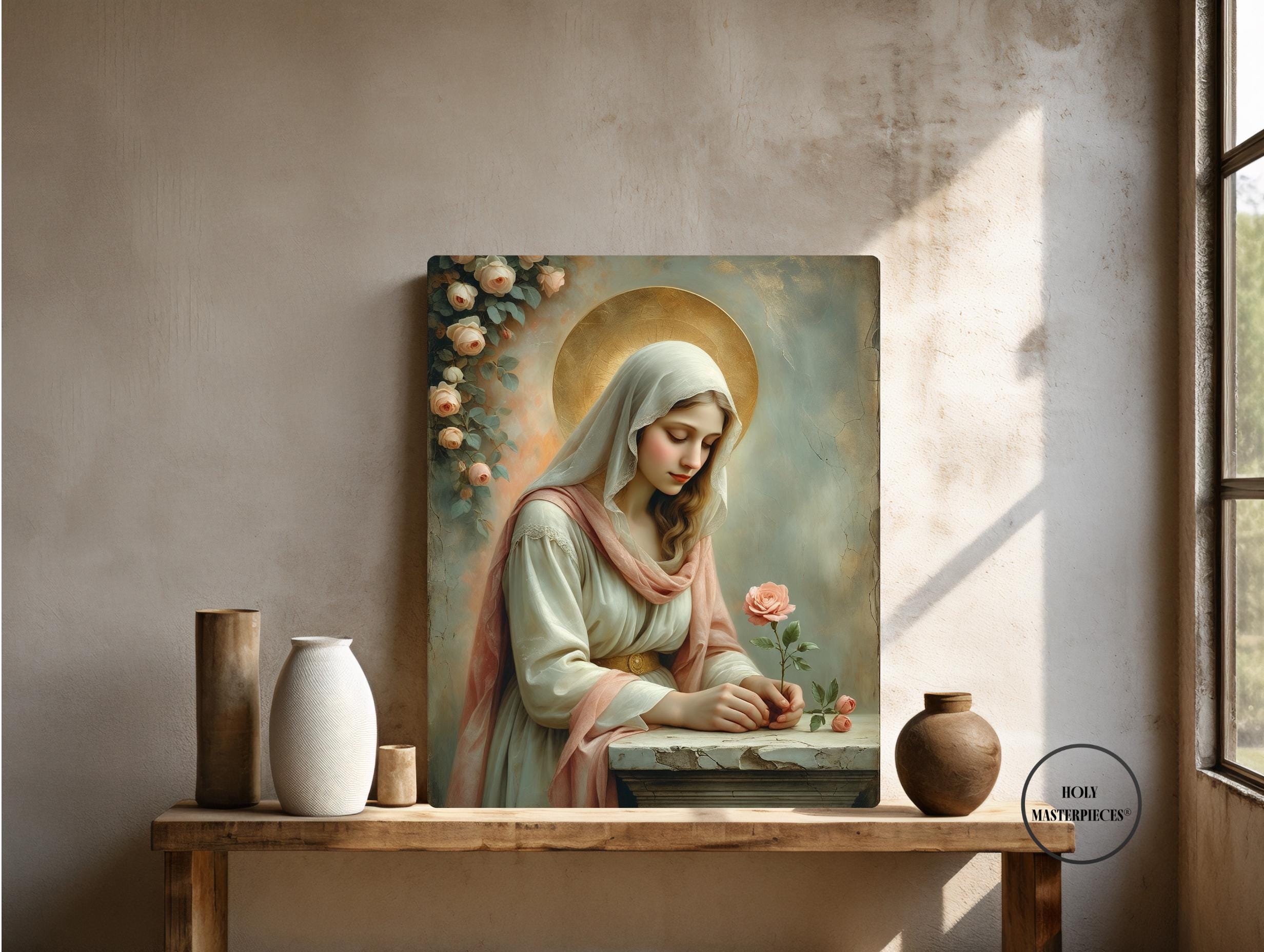 Her warm ivory veil, softly lowered gaze, and the muted painterly tones create a timeless sacred atmosphere reminiscent of ancient frescoes. The rose’s subtle blush tones add a tender warmth, heightening the contemplative beauty of the scene.