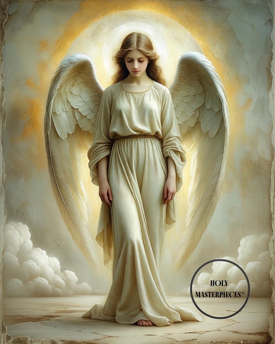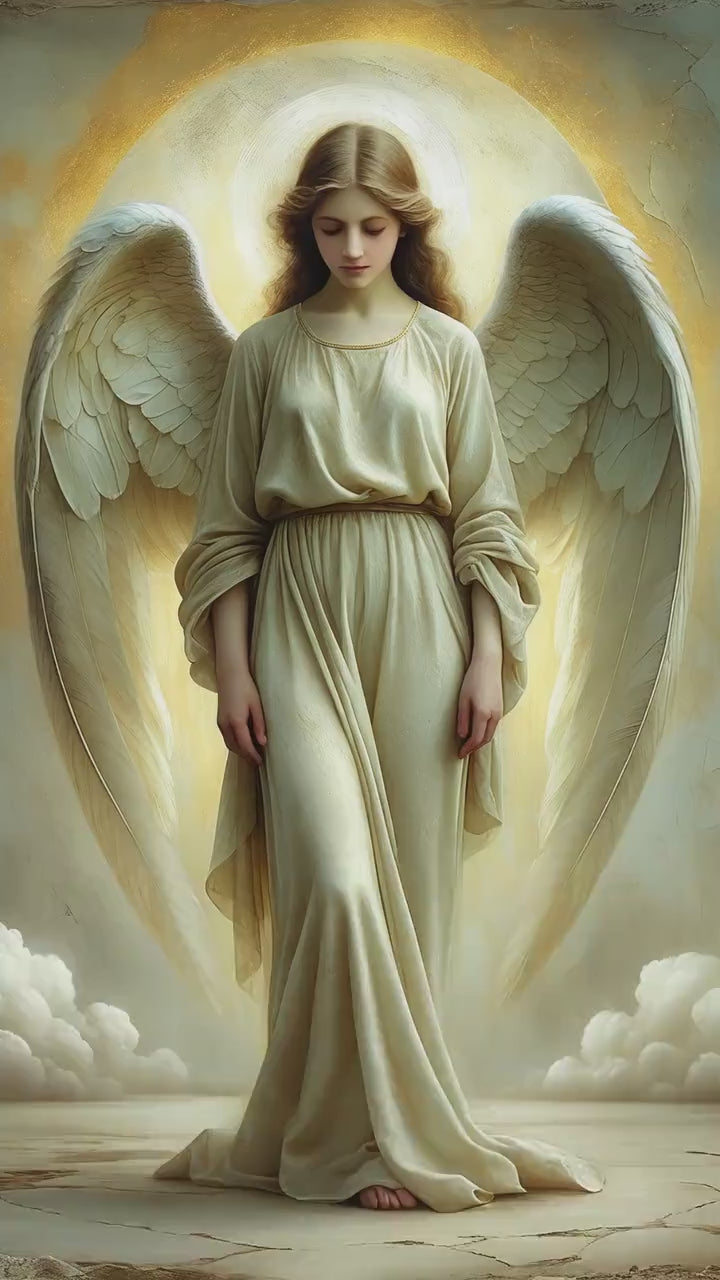 Warm ivory robes fall in long, graceful folds that emphasize vertical balance and serenity. The wings extend downward in a protective arc, framing the figure without dominance, their feathers rendered with subtle oil-textured brushwork and softened highlights. A diffused golden halo surrounds the head, atmospheric rather than sharply defined, reinforcing the sacred tone of the image.