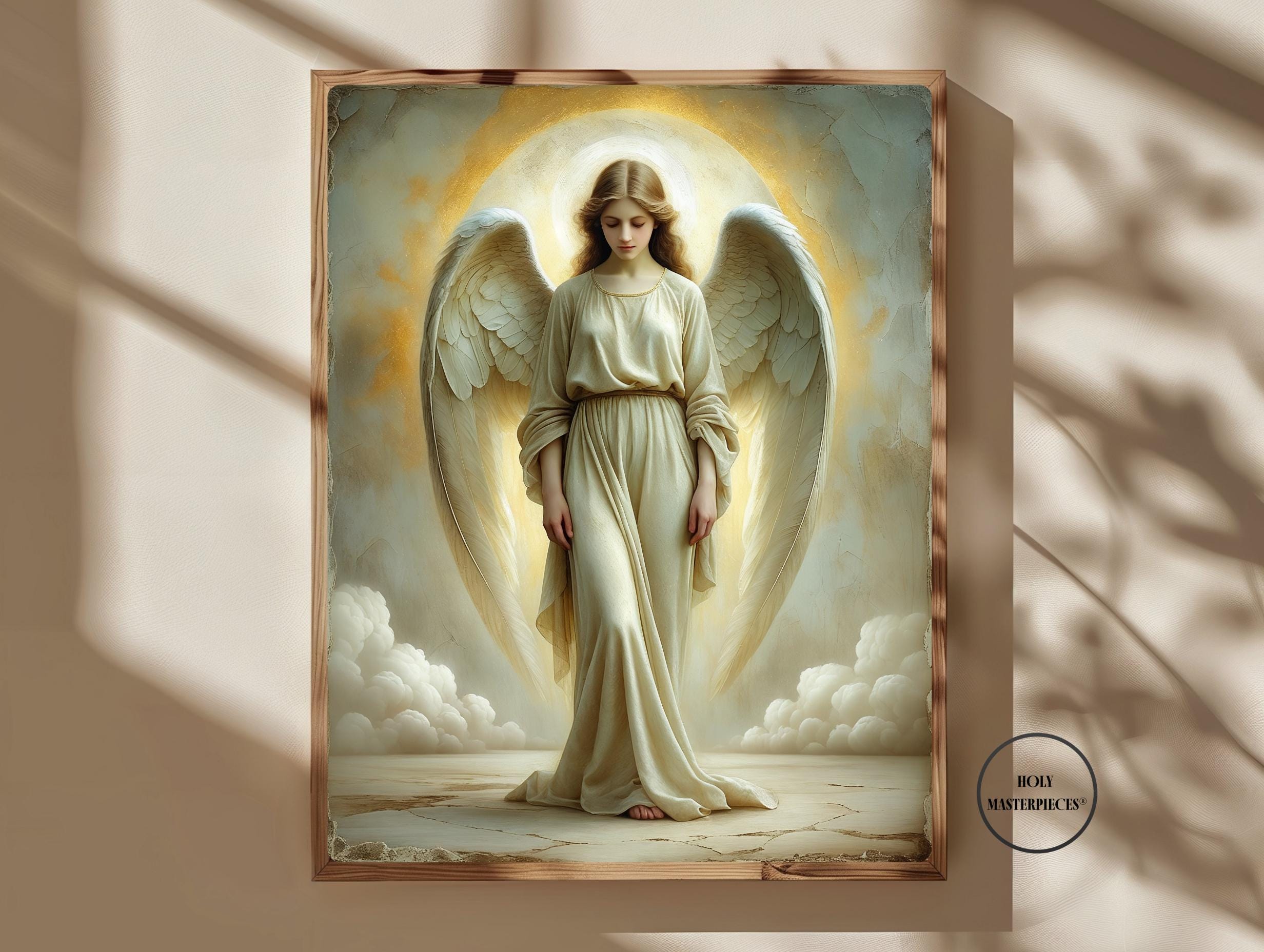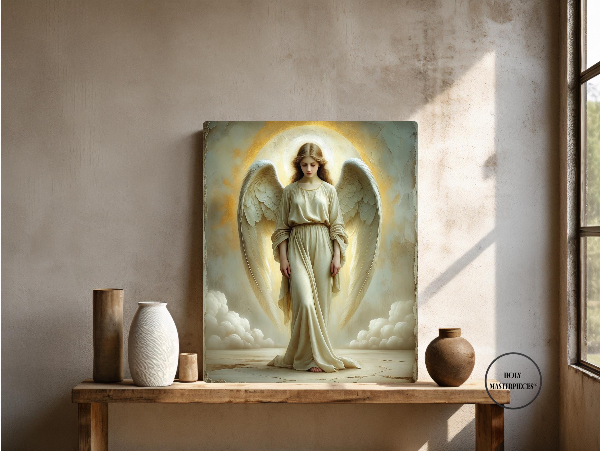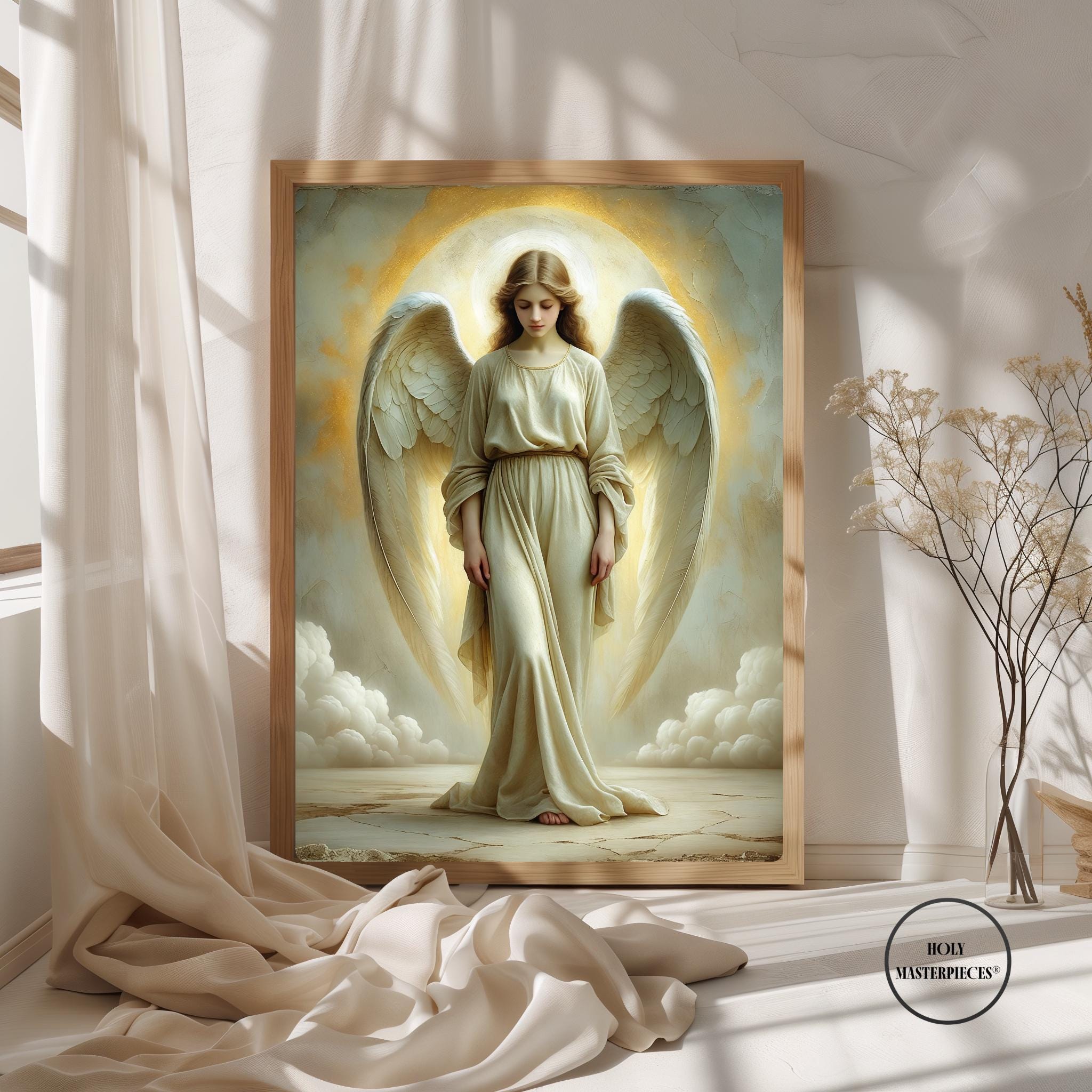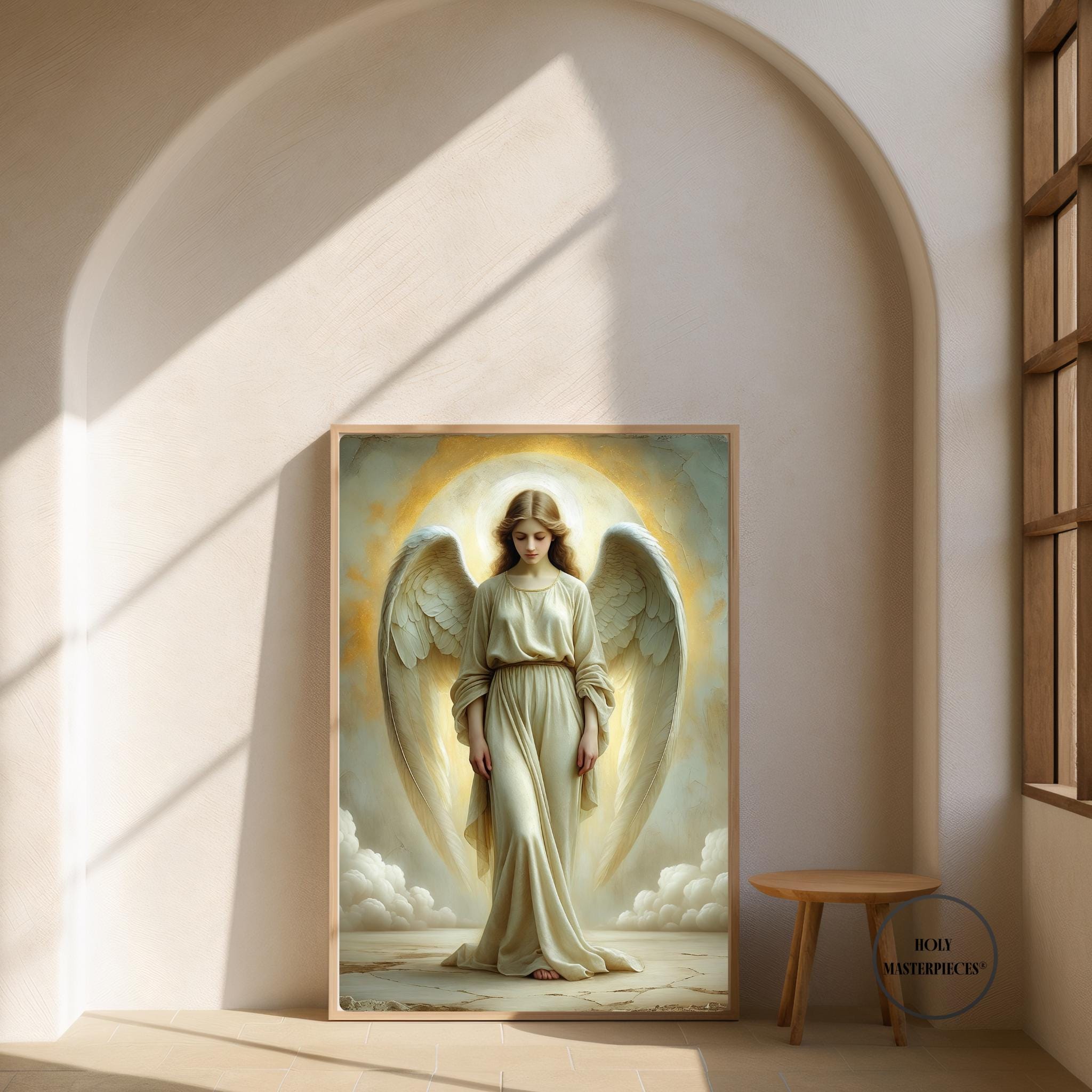 The Light Angel presents a luminous depiction of an angel standing in quiet reverence, bathed in soft radiance that appears to emanate from within the figure. With head gently bowed and eyes lowered, the angel conveys humility, peace, and sacred presence. The absence of movement or proclamation allows the composition to rest entirely in stillness, making this a contemplative piece of Catholic angel wall art designed for calm and reflective interiors.