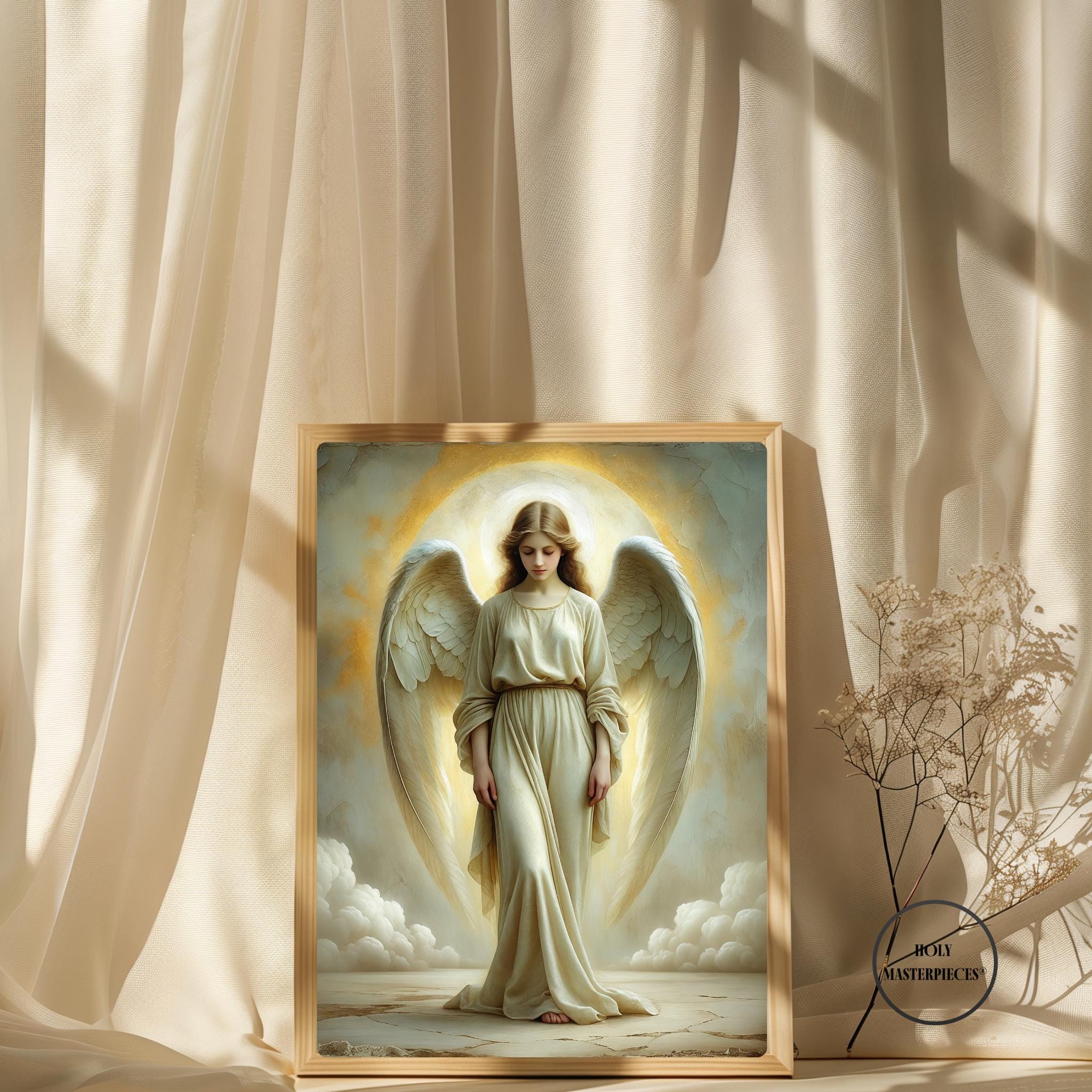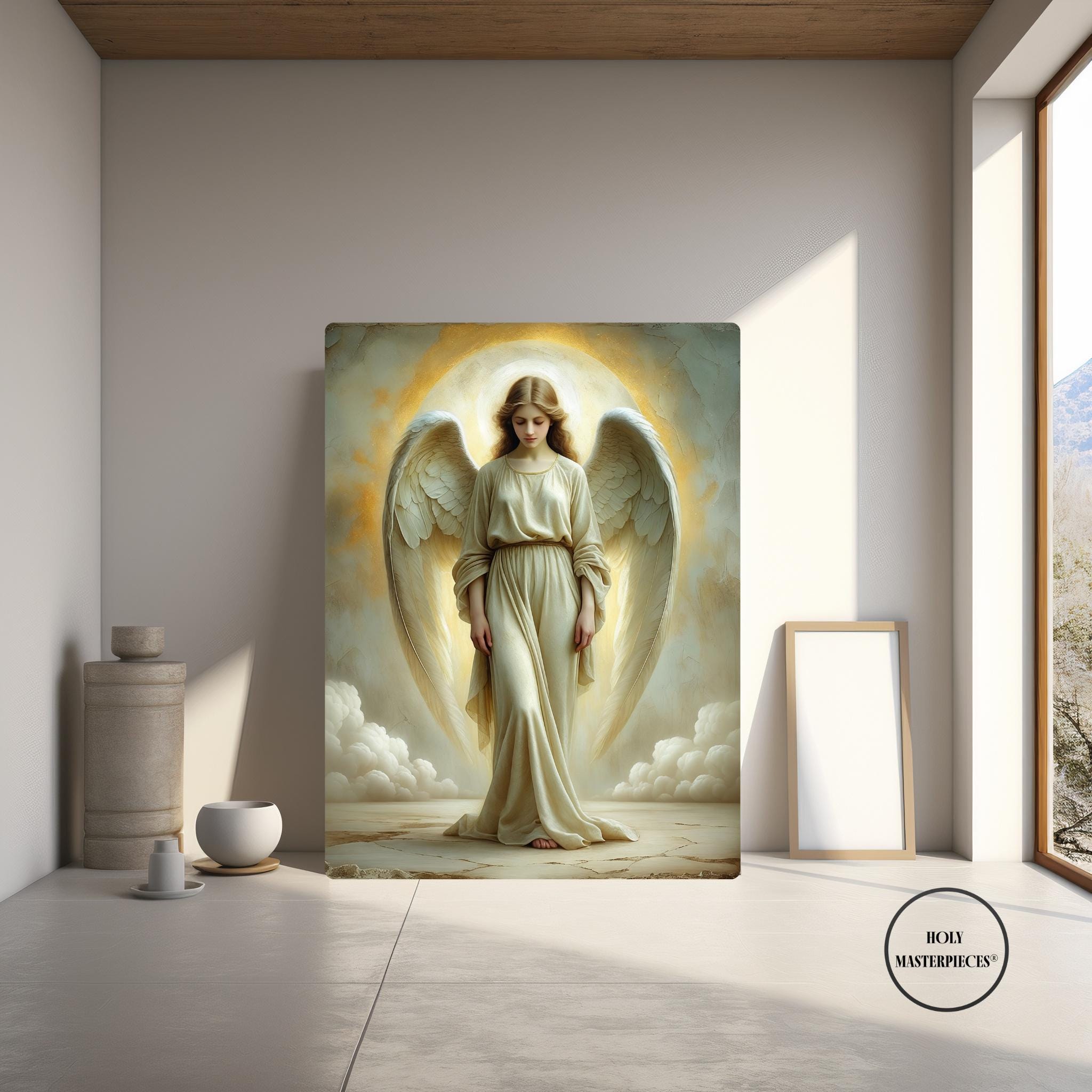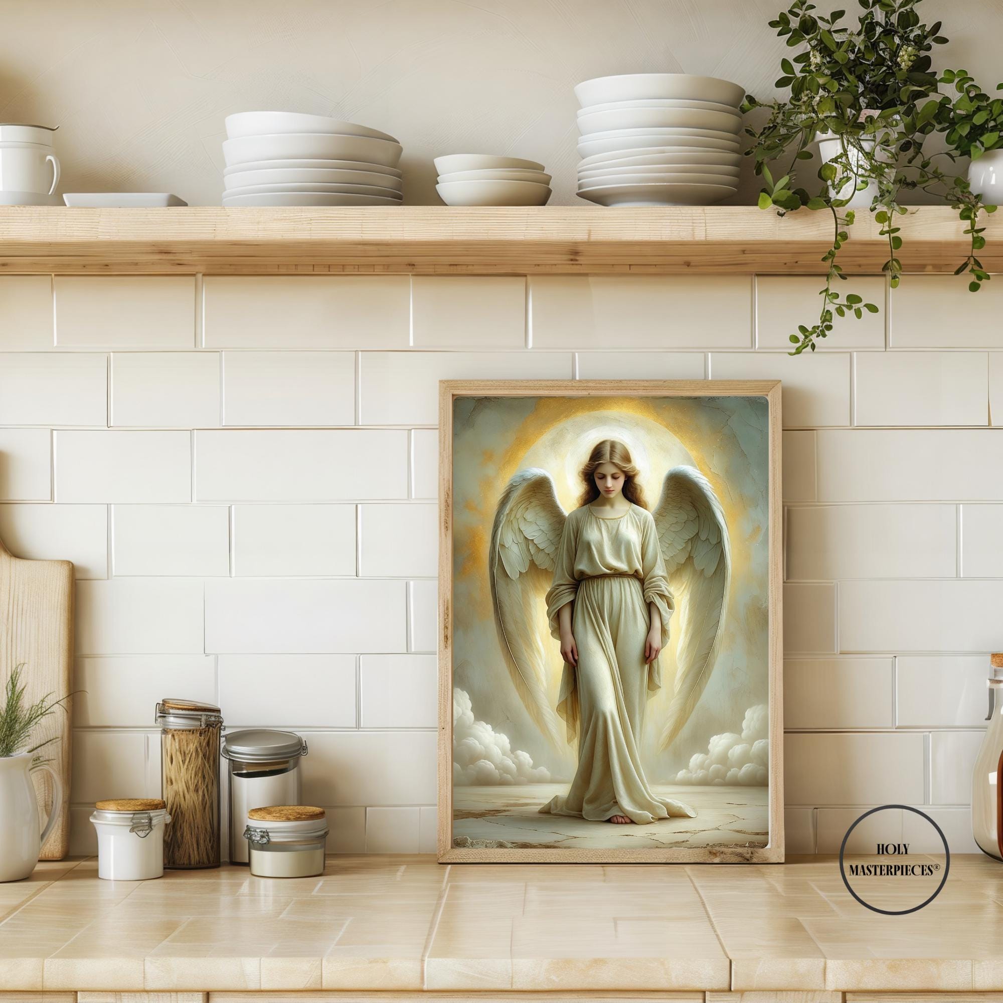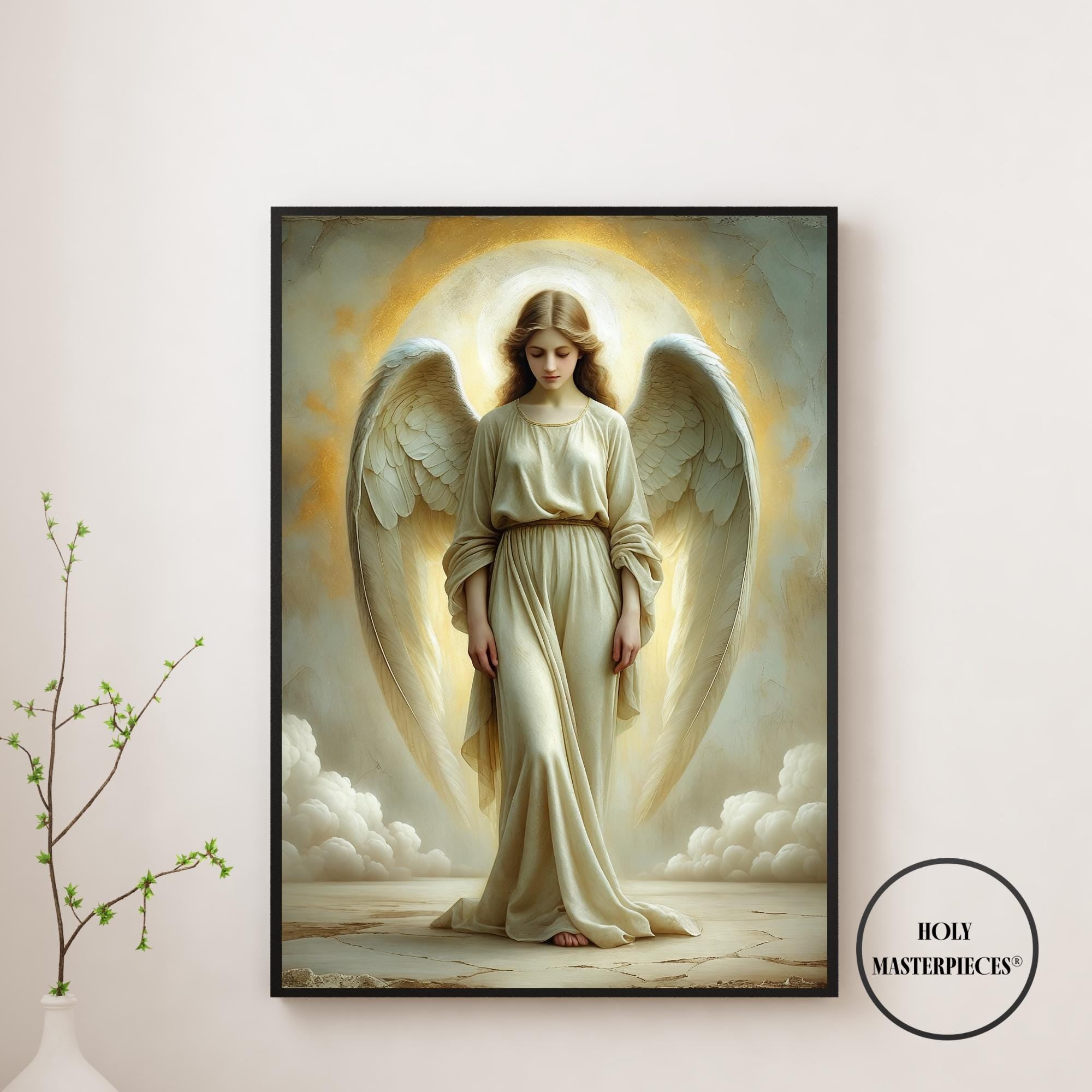 The Light Angel presents a luminous depiction of an angel standing in quiet reverence, bathed in soft radiance that appears to emanate from within the figure. With head gently bowed and eyes lowered, the angel conveys humility, peace, and sacred presence. The absence of movement or proclamation allows the composition to rest entirely in stillness, making this a contemplative piece of Catholic angel wall art designed for calm and reflective interiors.